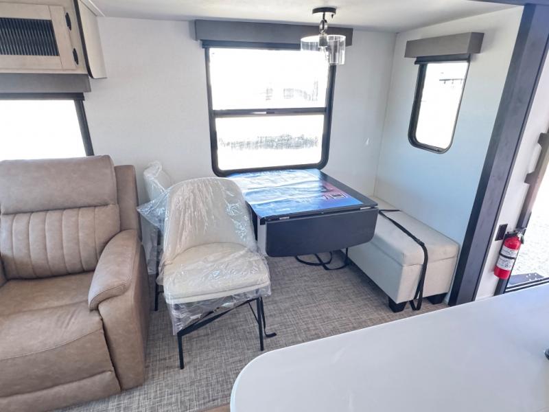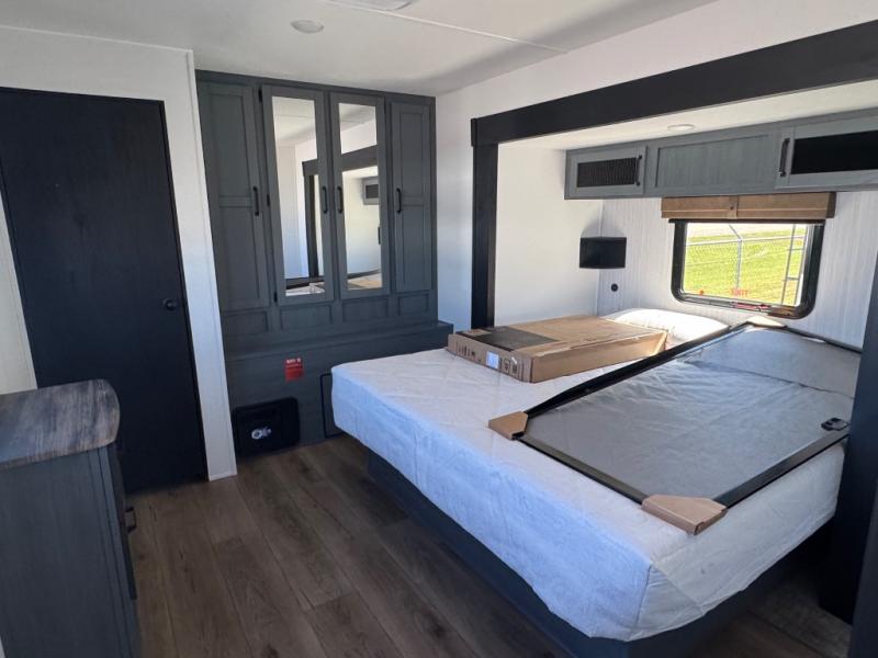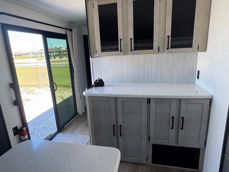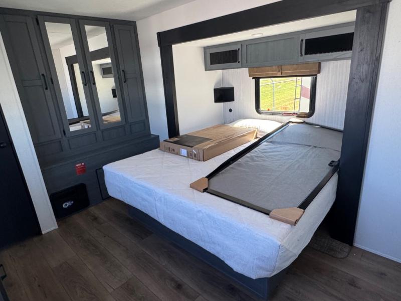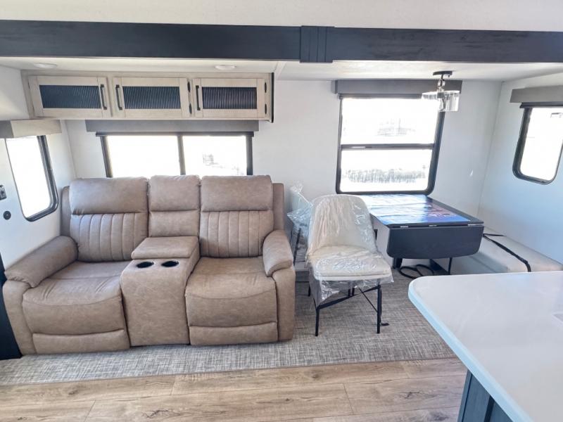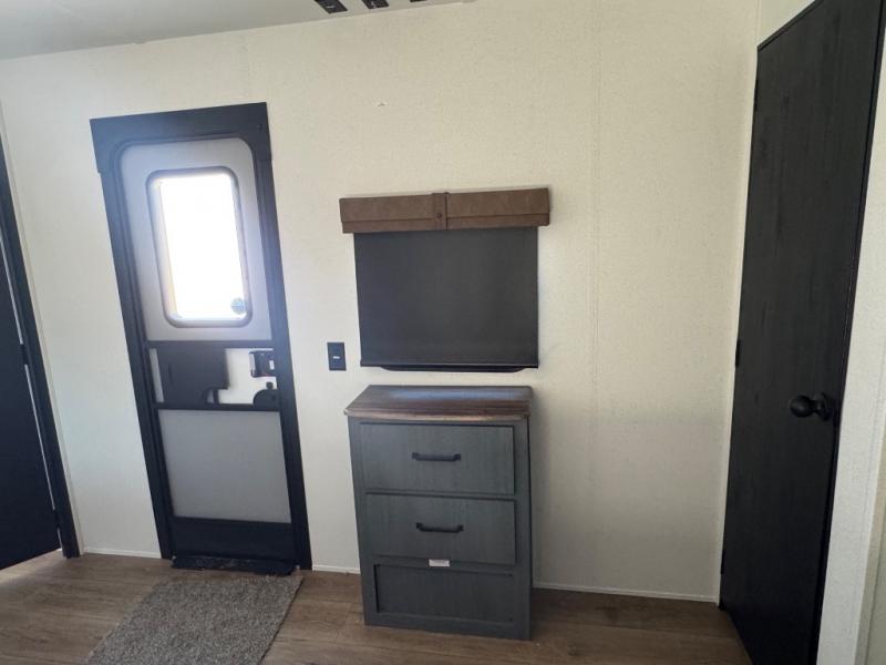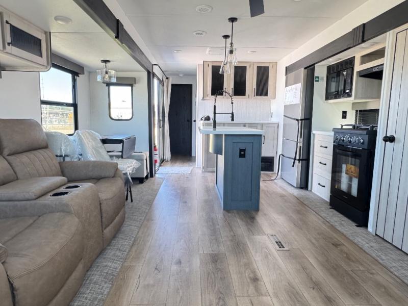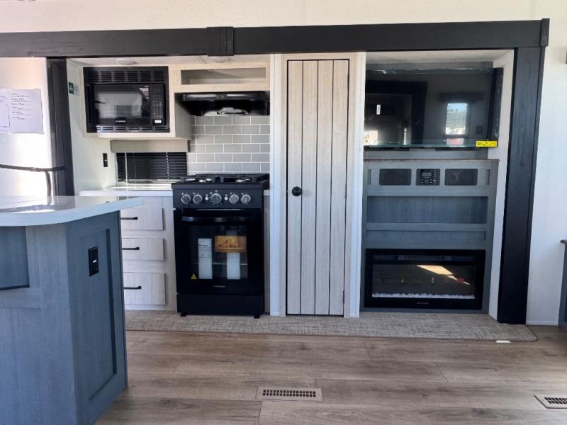 Get ready to enjoy your destination for a weekend or even longer in comfort with the front living and kitchen combined area. The sofa and booth dinette offer relaxing and dining space as well as sleeping space when needed. There are two recliners you are sure to love, as well as a fireplace to make it feel more like home. There is a kitchen island to prepare and serve meals from and wash the dishes. The kitchen offers full amenities including a stainless steel refrigerator and plenty of storage. You will surely enjoy the natural lighting from the patio door, and the second entry/exit is located in the rear private bedroom where you can sleep like a royalty on the king bed. There is also a closet with the option to add washer and dryer prep if you choose!