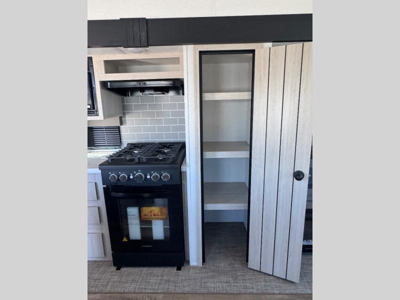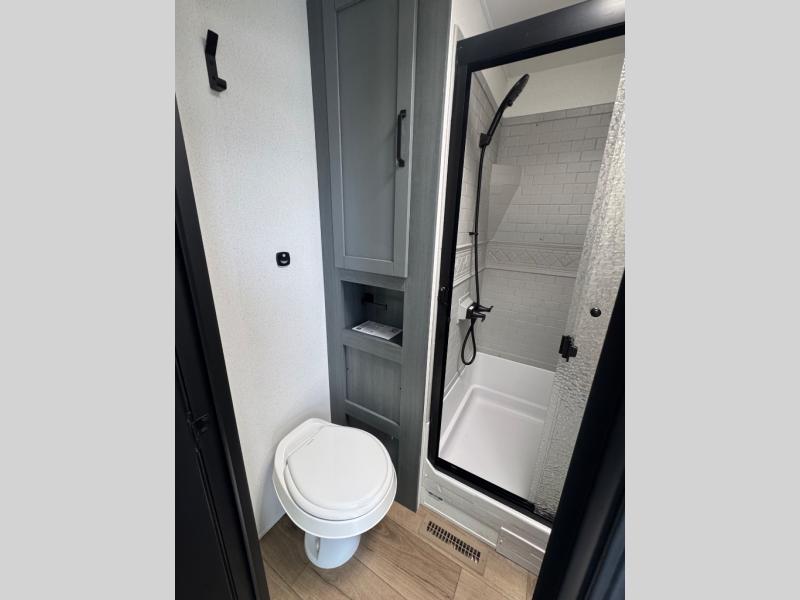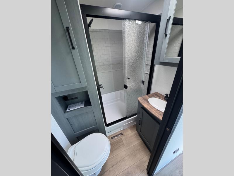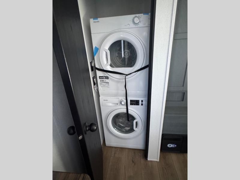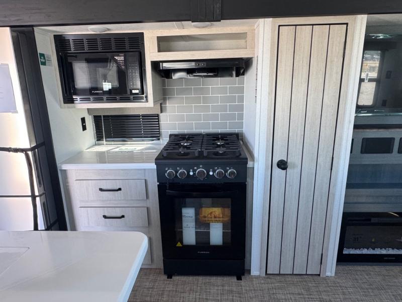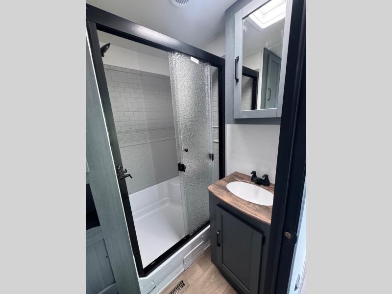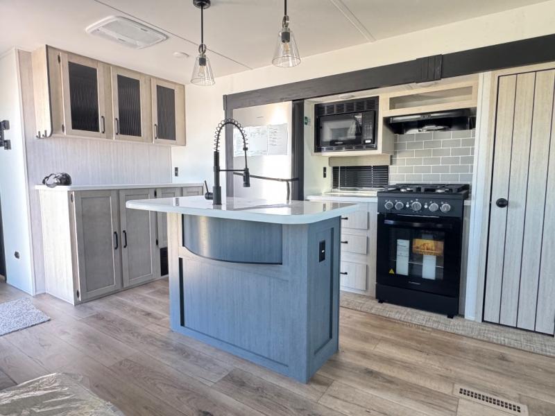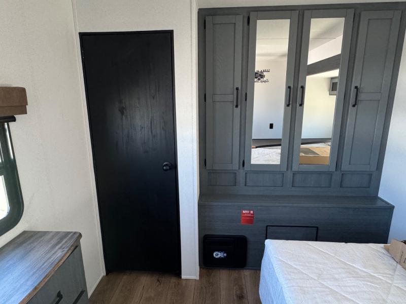 Get ready to enjoy your destination for a weekend or even longer in comfort with the front living and kitchen combined area. The sofa and booth dinette offer relaxing and dining space as well as sleeping space when needed. There are two recliners you are sure to love, as well as a fireplace to make it feel more like home. There is a kitchen island to prepare and serve meals from and wash the dishes. The kitchen offers full amenities including a stainless steel refrigerator and plenty of storage. You will surely enjoy the natural lighting from the patio door, and the second entry/exit is located in the rear private bedroom where you can sleep like a royalty on the king bed. There is also a closet with the option to add washer and dryer prep if you choose!