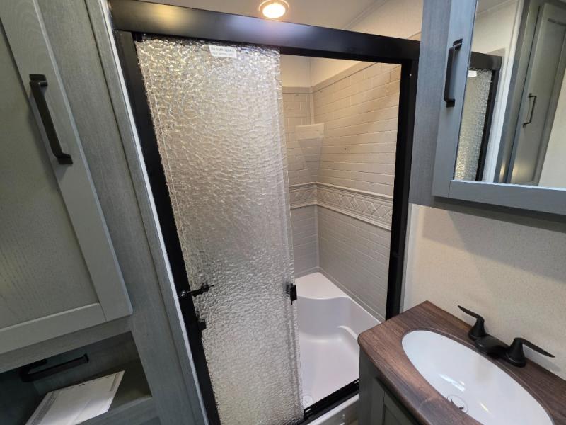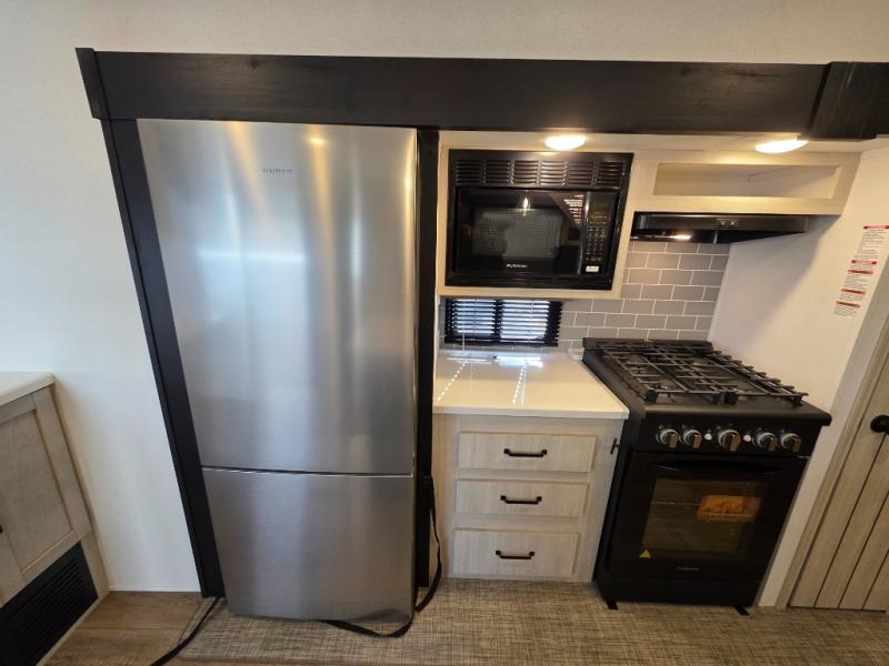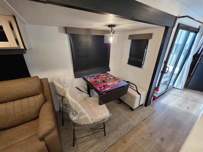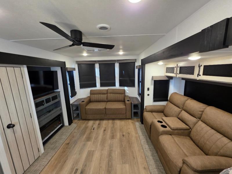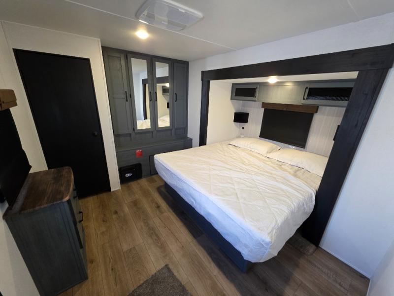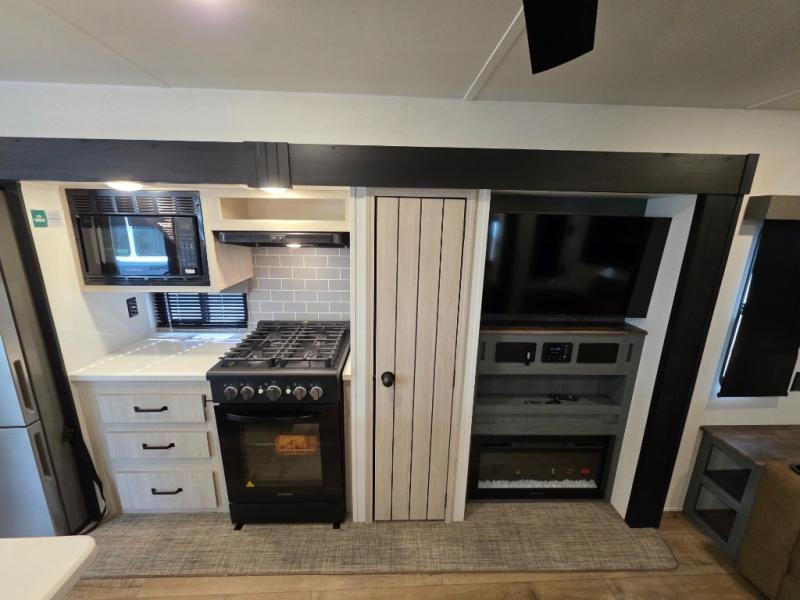 Get ready to enjoy your destination for a weekend or even longer in comfort with the front living and kitchen combined area. The sofa and booth dinette offer relaxing and dining space as well as sleeping space when needed. There are two recliners you are sure to love, as well as a fireplace to make it feel more like home. There is a kitchen island to prepare and serve meals from and wash the dishes. The kitchen offers full amenities including a stainless steel refrigerator and plenty of storage. You will surely enjoy the natural lighting from the patio door, and the second entry/exit is located in the rear private bedroom where you can sleep like a royalty on the king bed. There is also a closet with the option to add washer and dryer prep if you choose!