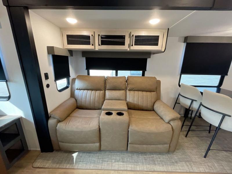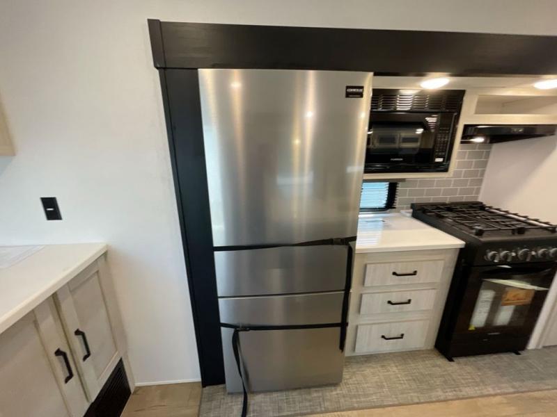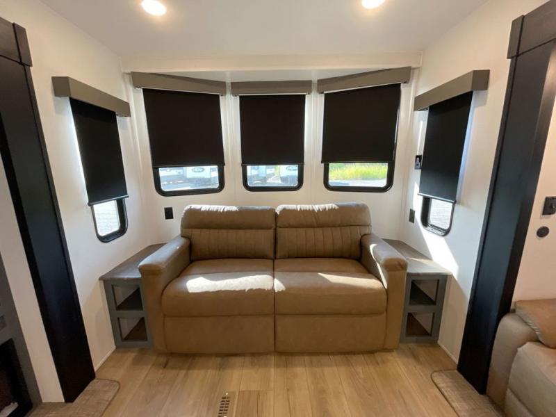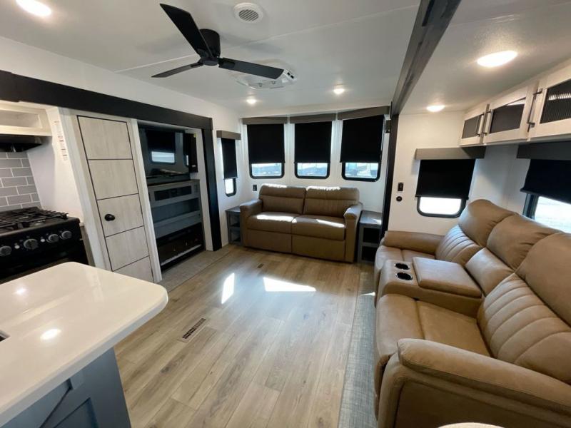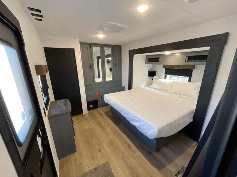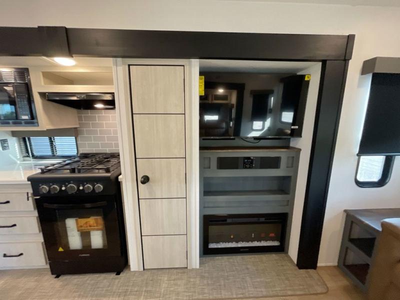 Get ready to enjoy your destination for a weekend or even longer in comfort with the front living and kitchen combined area. The sofa and booth dinette offer relaxing and dining space as well as sleeping space when needed. There are two recliners you are sure to love, as well as a fireplace to make it feel more like home. There is a kitchen island to prepare and serve meals from and wash the dishes. The kitchen offers full amenities including a stainless steel refrigerator and plenty of storage. You will surely enjoy the natural lighting from the patio door, and the second entry/exit is located in the rear private bedroom where you can sleep like a royalty on the king bed. There is also a closet with the option to add washer and dryer prep if you choose!