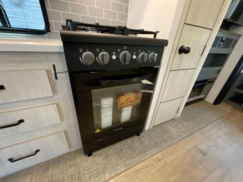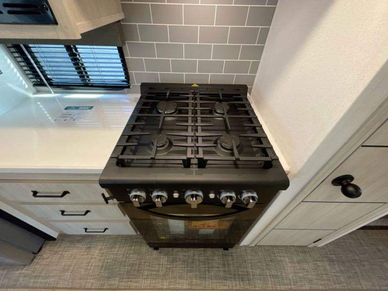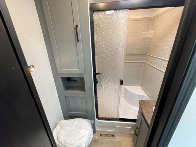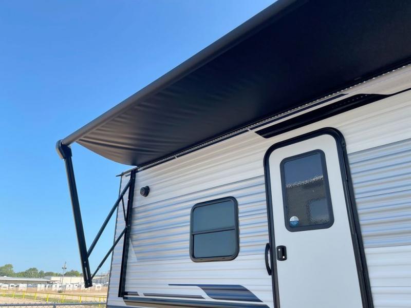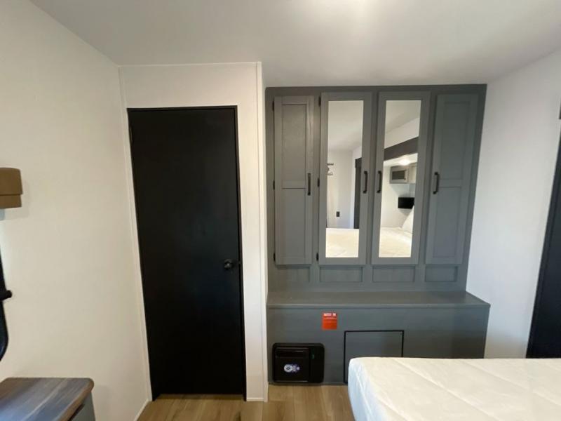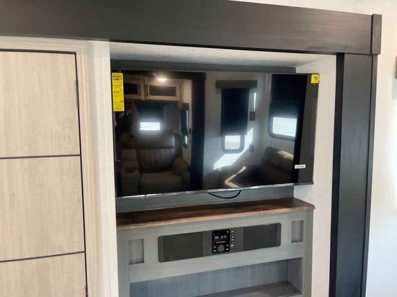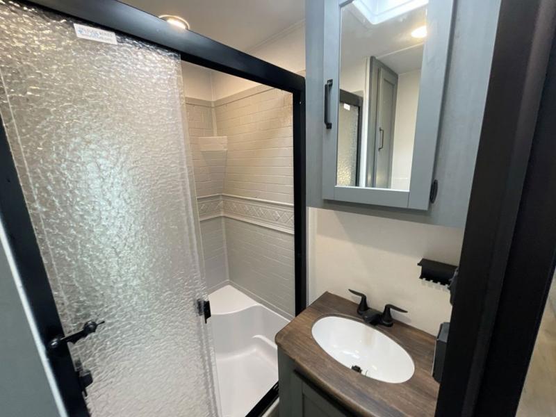Get ready to enjoy your destination for a weekend or even longer in comfort with the front living and kitchen combined area. The sofa and booth dinette offer relaxing and dining space as well as sleeping space when needed. There are two recliners you are sure to love, as well as a fireplace to make it feel more like home. There is a kitchen island to prepare and serve meals from and wash the dishes. The kitchen offers full amenities including a stainless steel refrigerator and plenty of storage. You will surely enjoy the natural lighting from the patio door, and the second entry/exit is located in the rear private bedroom where you can sleep like a royalty on the king bed. There is also a closet with the option to add washer and dryer prep if you choose!