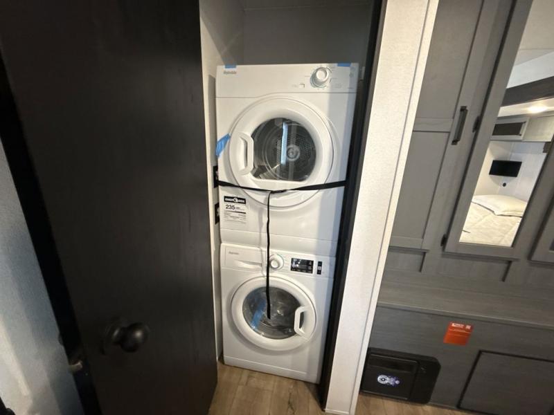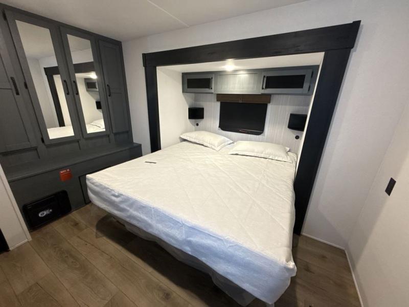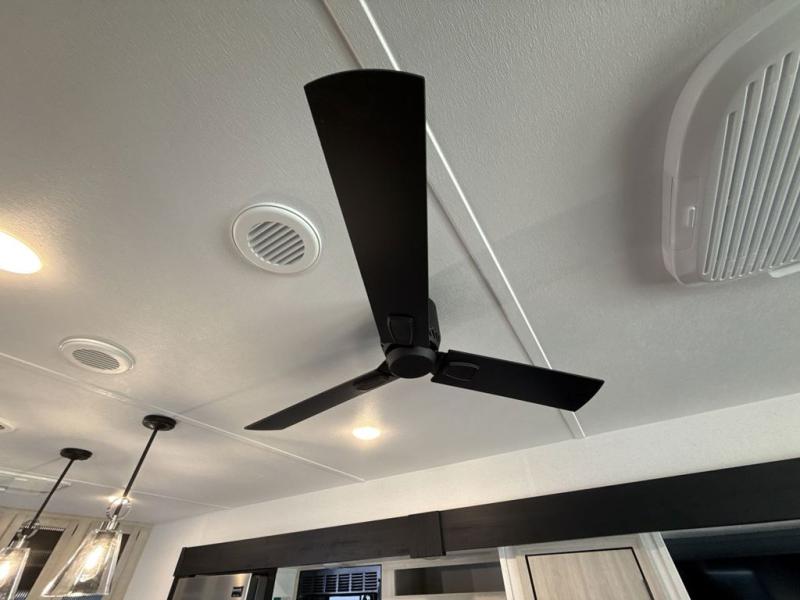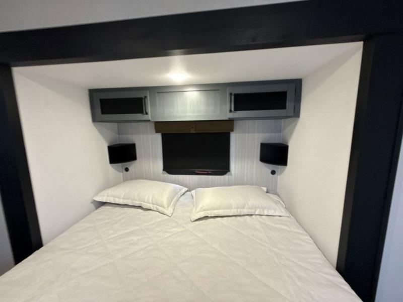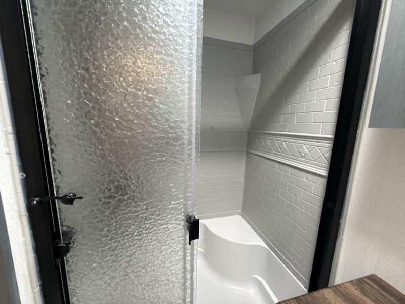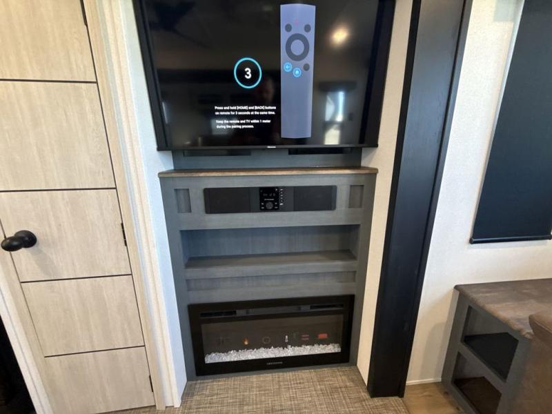 Get ready to enjoy your destination for a weekend or even longer in comfort with the front living and kitchen combined area. The sofa and booth dinette offer relaxing and dining space as well as sleeping space when needed. There are two recliners you are sure to love, as well as a fireplace to make it feel more like home. There is a kitchen island to prepare and serve meals from and wash the dishes. The kitchen offers full amenities including a stainless steel refrigerator and plenty of storage. You will surely enjoy the natural lighting from the patio door, and the second entry/exit is located in the rear private bedroom where you can sleep like a royalty on the king bed. There is also a closet with the option to add washer and dryer prep if you choose!