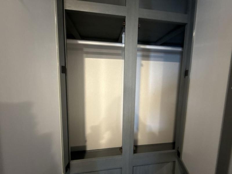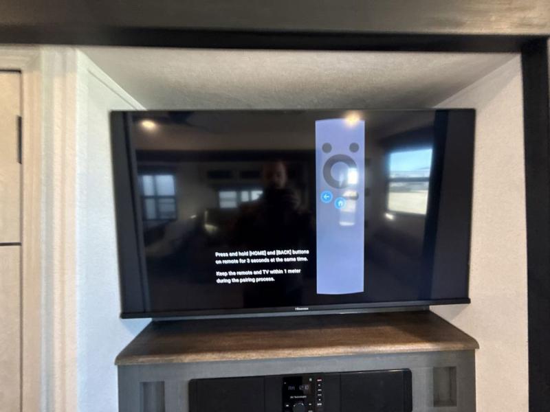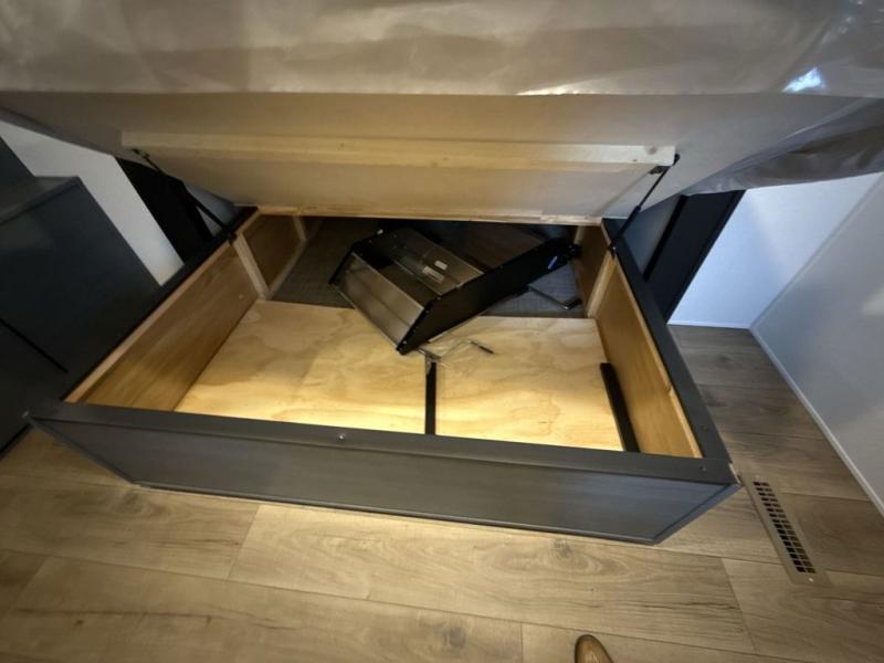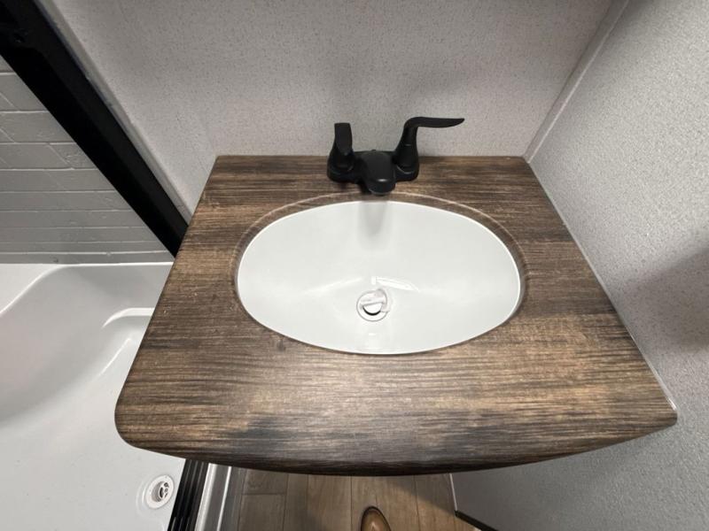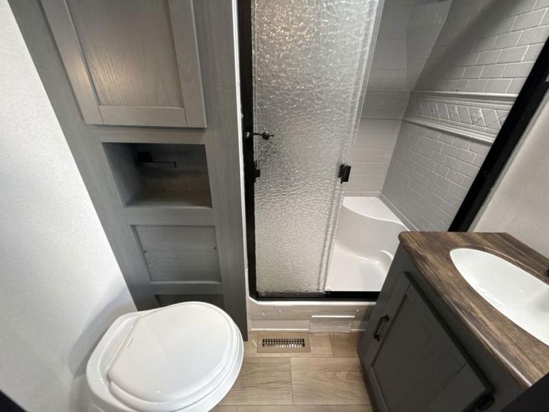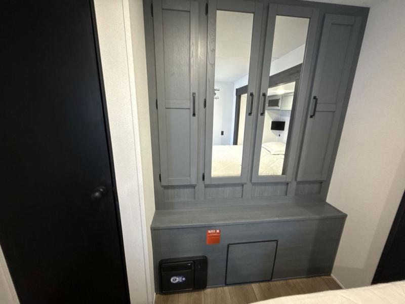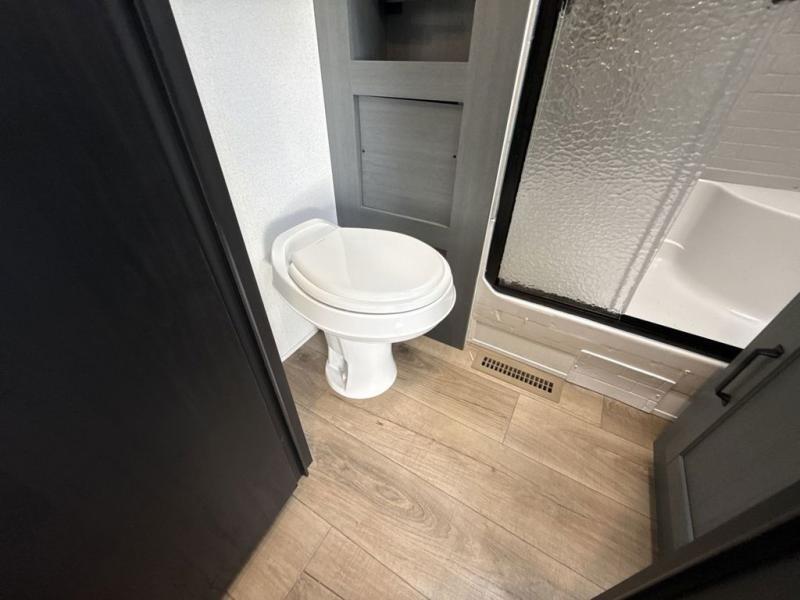 Get ready to enjoy your destination for a weekend or even longer in comfort with the front living and kitchen combined area. The sofa and booth dinette offer relaxing and dining space as well as sleeping space when needed. There are two recliners you are sure to love, as well as a fireplace to make it feel more like home. There is a kitchen island to prepare and serve meals from and wash the dishes. The kitchen offers full amenities including a stainless steel refrigerator and plenty of storage. You will surely enjoy the natural lighting from the patio door, and the second entry/exit is located in the rear private bedroom where you can sleep like a royalty on the king bed. There is also a closet with the option to add washer and dryer prep if you choose!