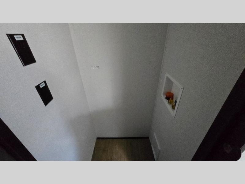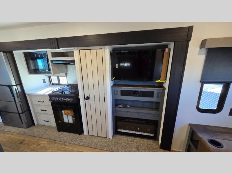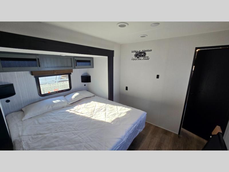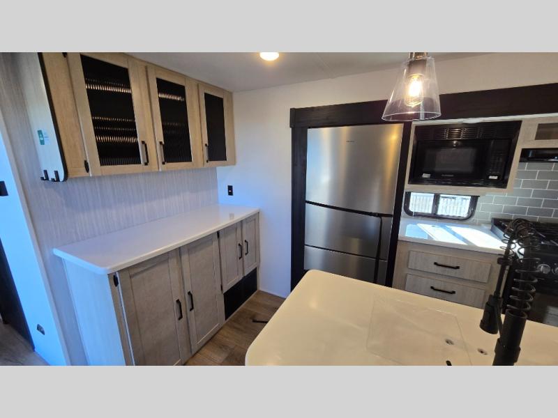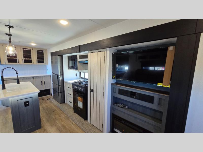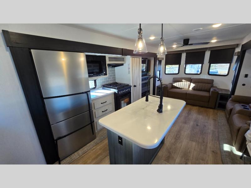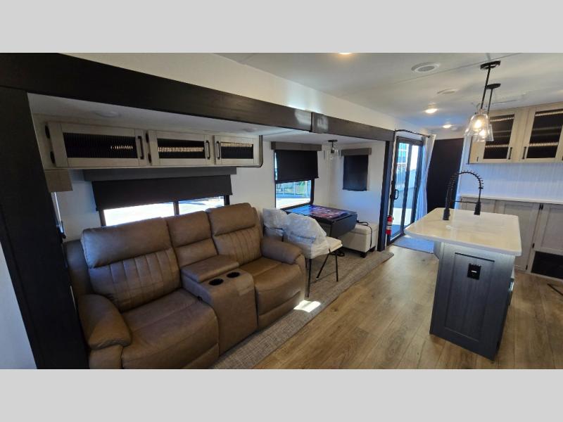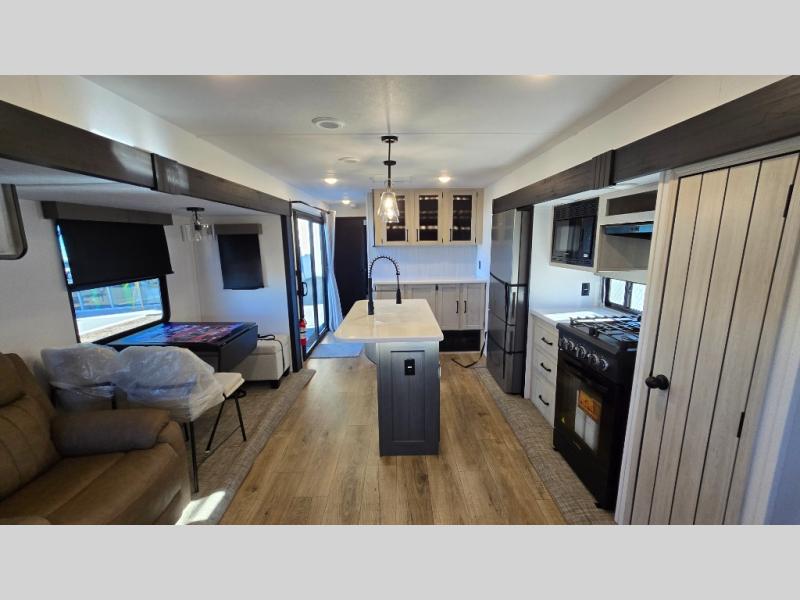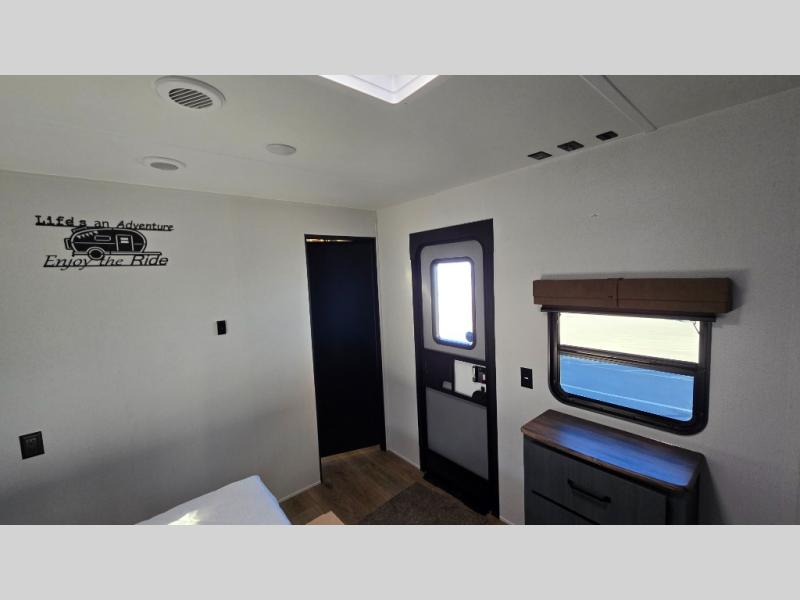 Get ready to enjoy your destination for a weekend or even longer in comfort with the front living and kitchen combined area. The sofa, table and chairs plus theater seating offer a place to relax, dine, and let guests sleep over. There is a kitchen island to prepare and serve meals from and wash the dishes. The kitchen offers full amenities including a residential-style refrigerator and plenty of storage. You will surely enjoy the natural lighting from the patio door, and the second entry/exit is located in the rear private bedroom where you can sleep like royalty on the king bed. There is also a closet with washer and dryer prep if you choose to add these appliances.