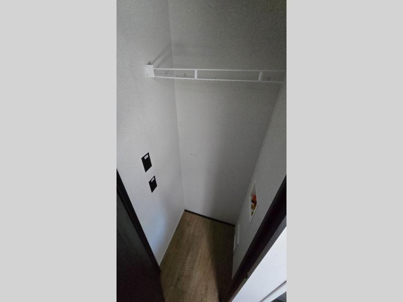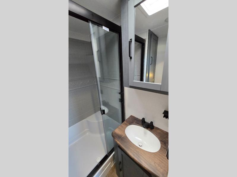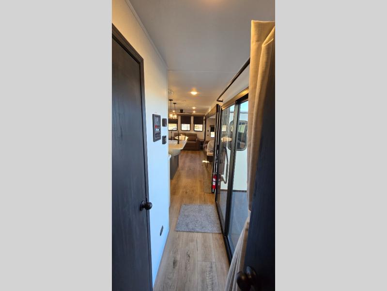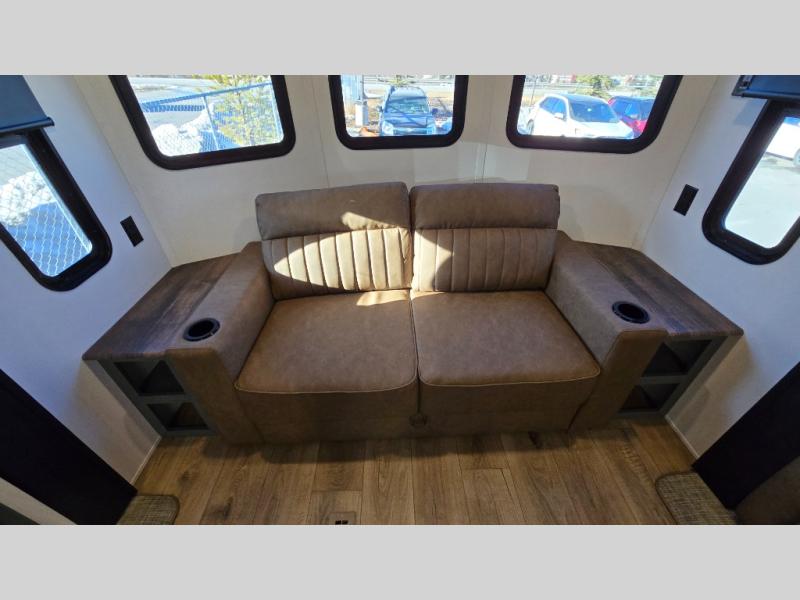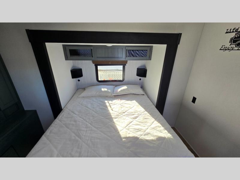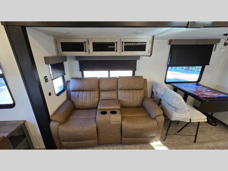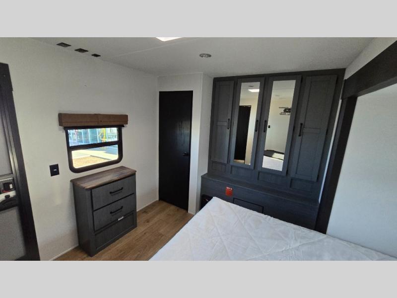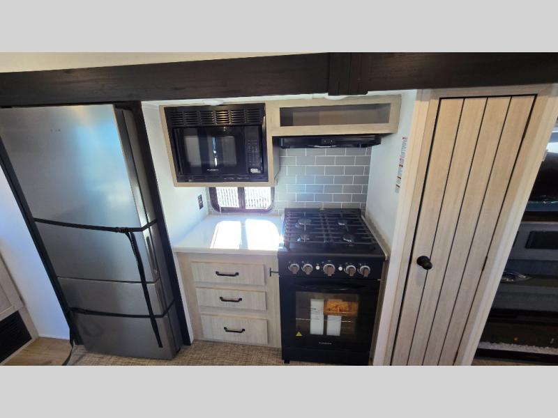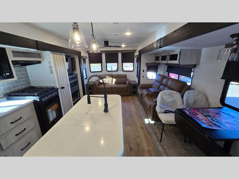 Get ready to enjoy your destination for a weekend or even longer in comfort with the front living and kitchen combined area. The sofa, table and chairs plus theater seating offer a place to relax, dine, and let guests sleep over. There is a kitchen island to prepare and serve meals from and wash the dishes. The kitchen offers full amenities including a residential-style refrigerator and plenty of storage. You will surely enjoy the natural lighting from the patio door, and the second entry/exit is located in the rear private bedroom where you can sleep like royalty on the king bed. There is also a closet with washer and dryer prep if you choose to add these appliances.