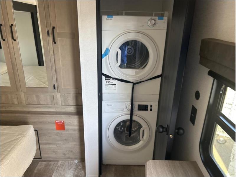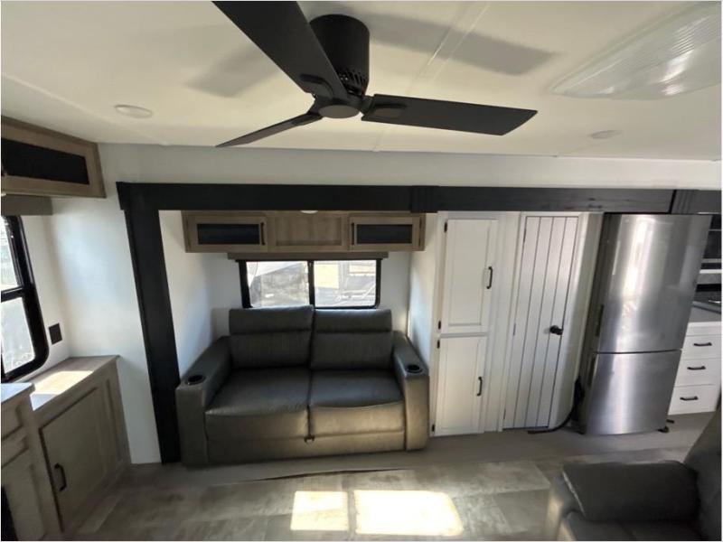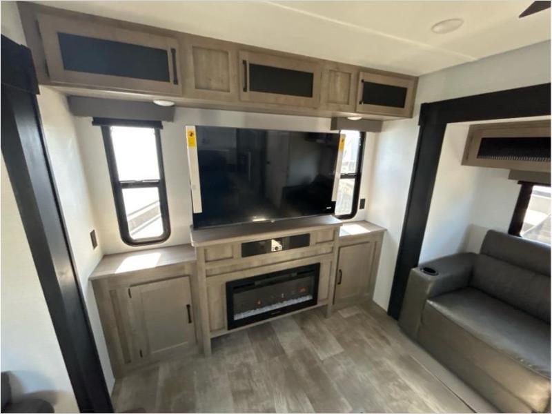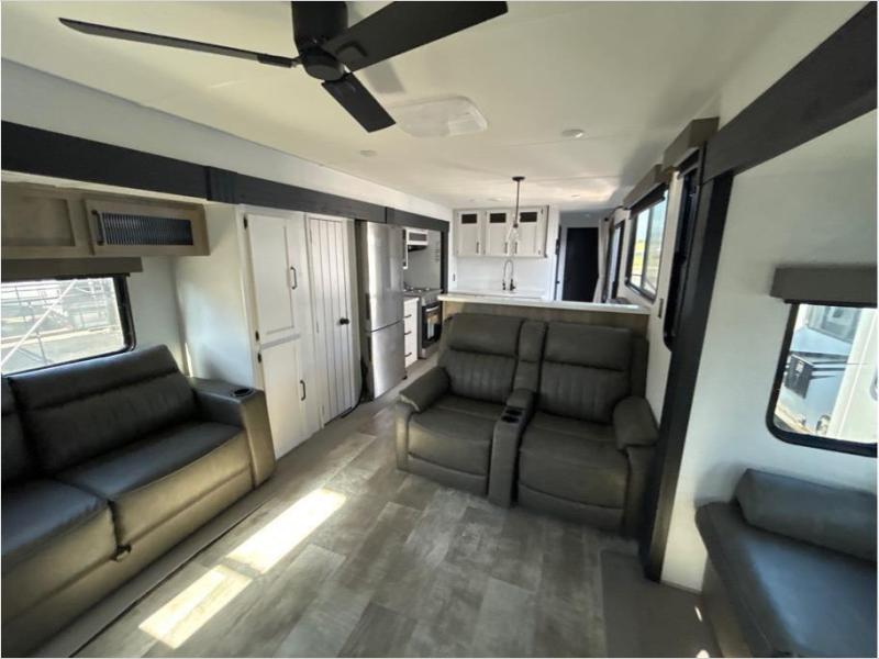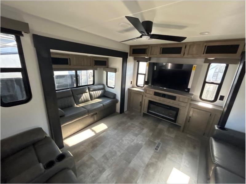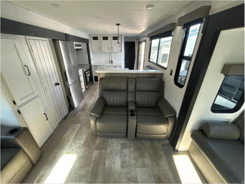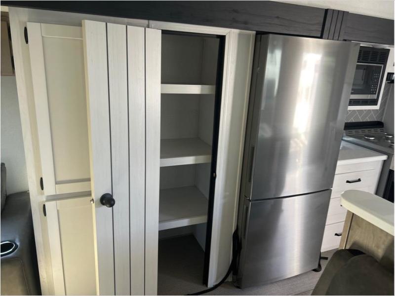 Escape the everyday schedule and enjoy your trailer at your favorite spot! Once you arrive, you can enter through the patio door or the second entry which places you inside the front bedroom. You can quickly load your clothing and food and relax in the rear separate living area with theater seating, two sofas, and an entertainment center. The cook can make a meal with full amenities with plenty of counter space plus a large pantry and refrigerator to hold lots of food. The table and two chairs plus booth seating will allow four people to enjoy a meal together or play a game here. When you need to get refreshed, the full bathroom includes everything needed plus linen storage and a seated shower. And the front bedroom offers a slide out king bed, a dresser and a large closet, plus a second closet with washer and dryer prep for the option to add these appliances.