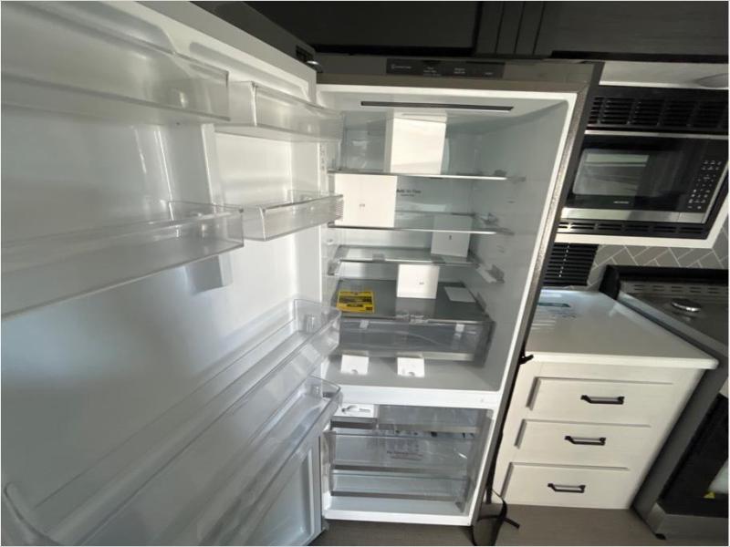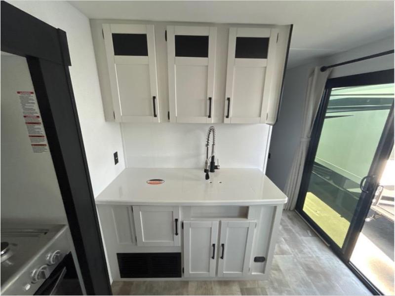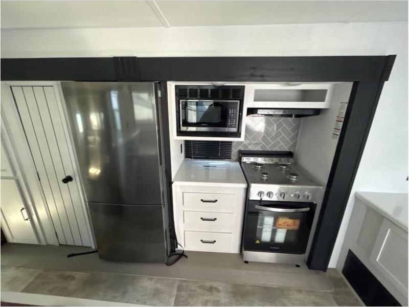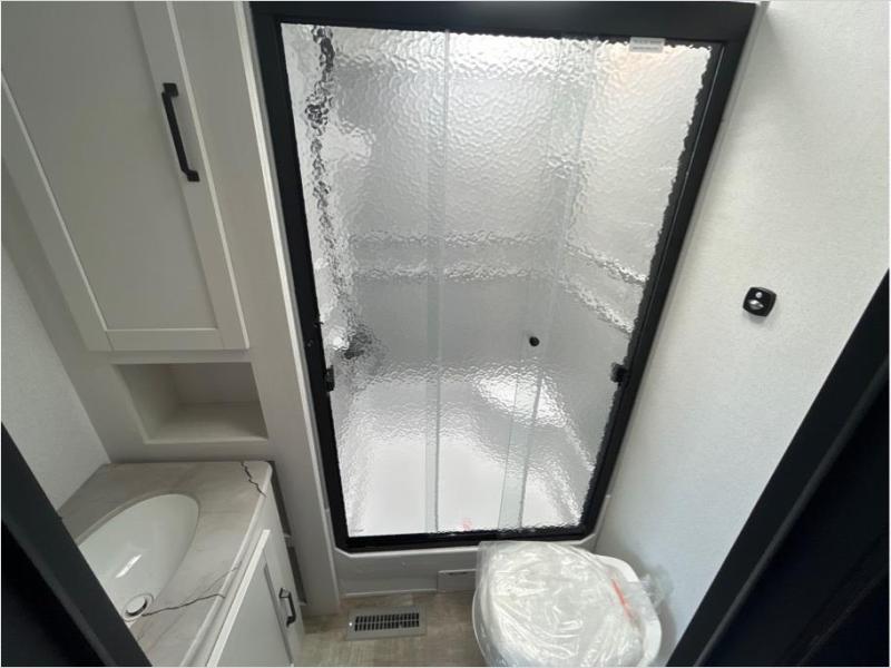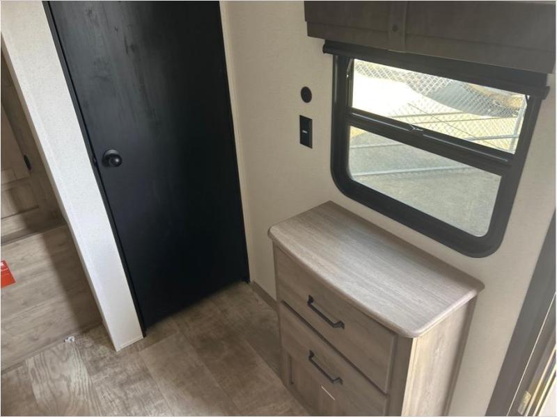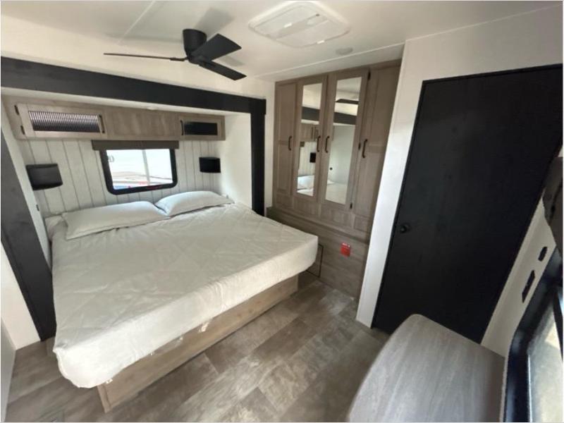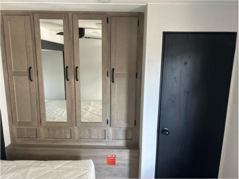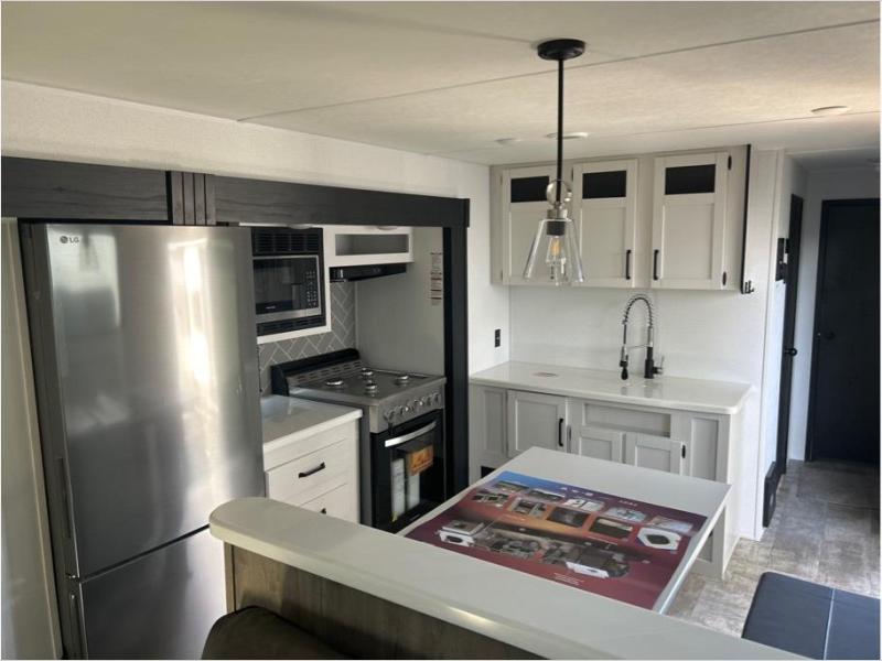 Escape the everyday schedule and enjoy your trailer at your favorite spot! Once you arrive, you can enter through the patio door or the second entry which places you inside the front bedroom. You can quickly load your clothing and food and relax in the rear separate living area with theater seating, two sofas, and an entertainment center. The cook can make a meal with full amenities with plenty of counter space plus a large pantry and refrigerator to hold lots of food. The table and two chairs plus booth seating will allow four people to enjoy a meal together or play a game here. When you need to get refreshed, the full bathroom includes everything needed plus linen storage and a seated shower. And the front bedroom offers a slide out king bed, a dresser and a large closet, plus a second closet with washer and dryer prep for the option to add these appliances.