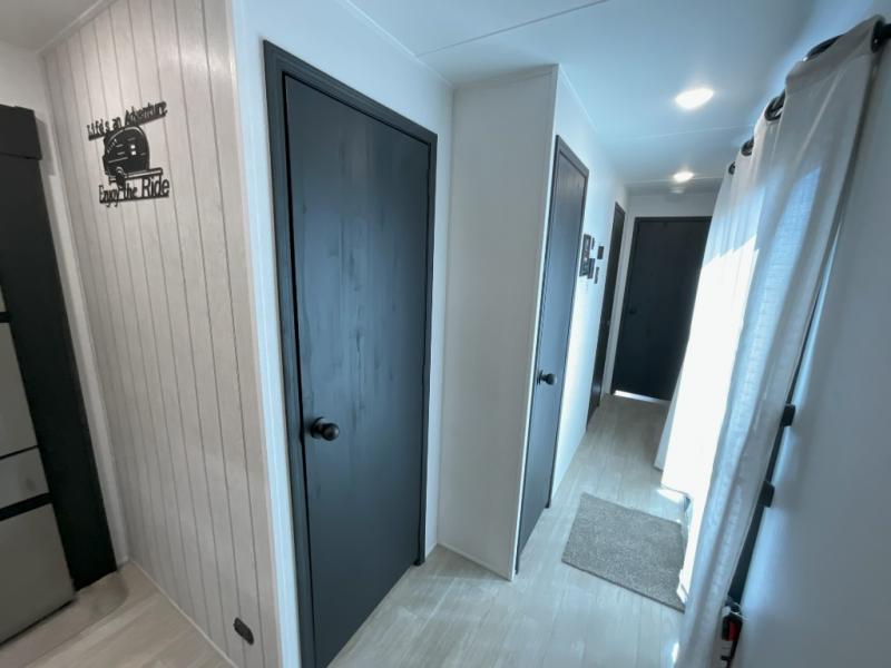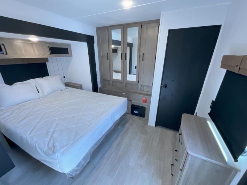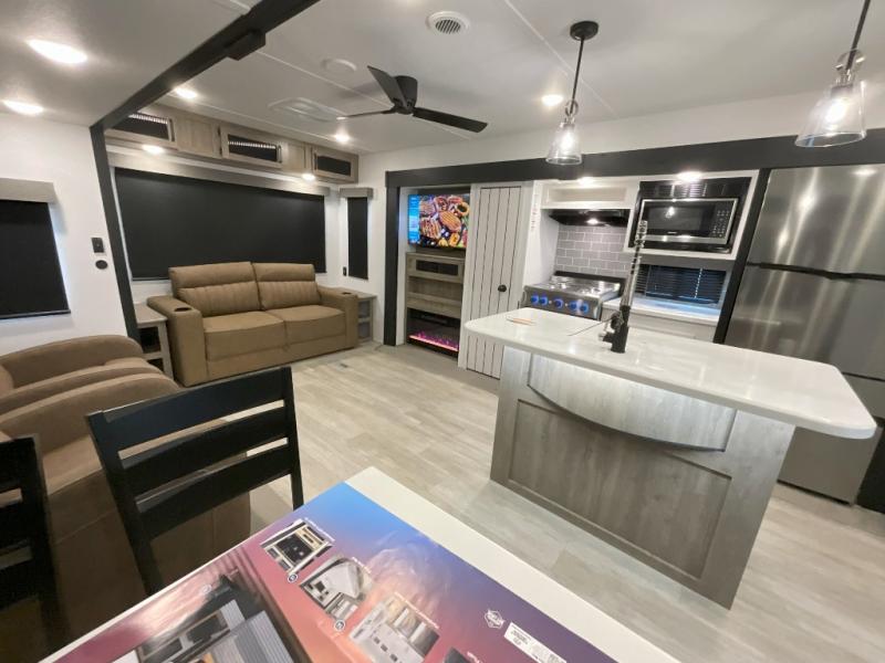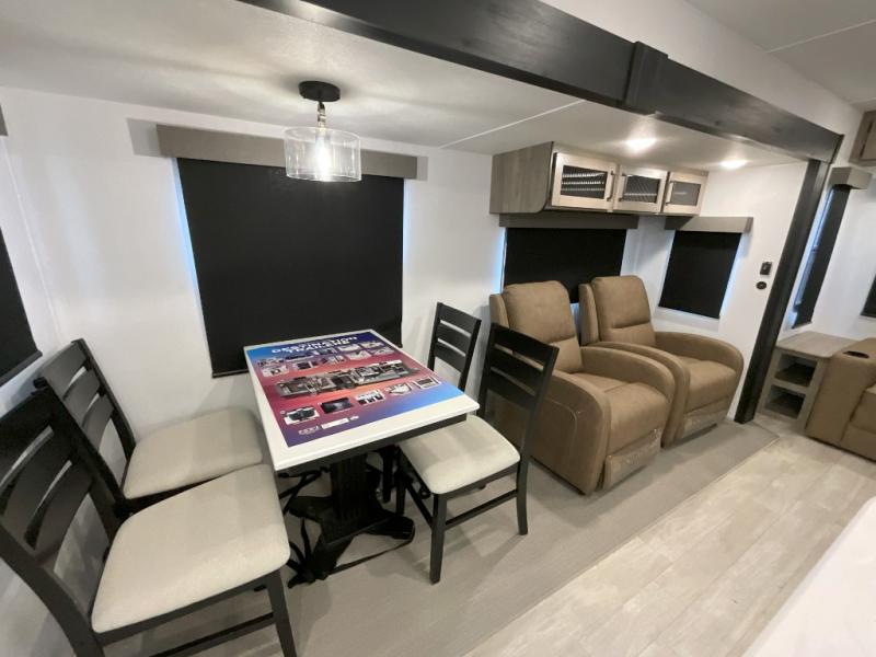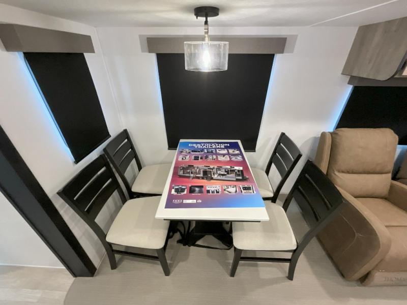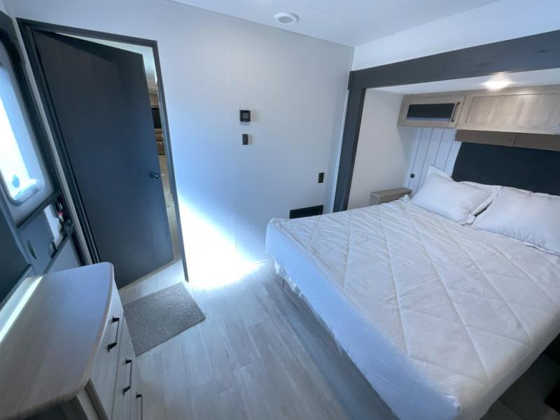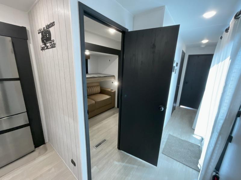Everyone will want to join you when you head back out to the lake to stay in this trailer! With the middle bunkhouse that includes a bunk above a jiffy sofa and a closet, this can be your kids room or guests headquarters. You will have your own privacy when needed in the front bedroom which includes a queen bed slide and two closets. There is also a dresser and a space within a closet for a washer/dryer prep option. The full bathroom is conveniently located between the two rooms, and the rear of the destination trailer offers a combined living and kitchen area. The dual slides give you lots of floor space around the kitchen island to relax on the booth dinette or sofa, and the cook will have full kitchen amenities including a residential style refrigerator.