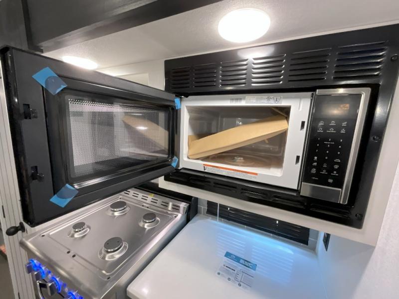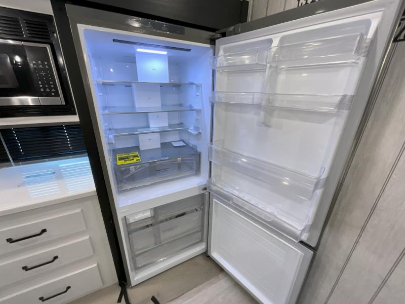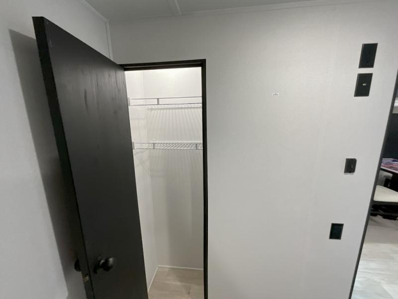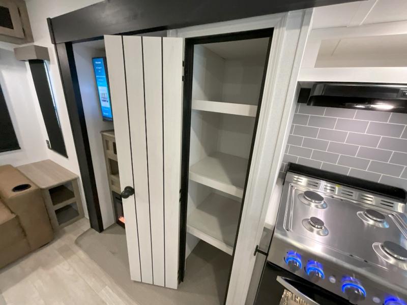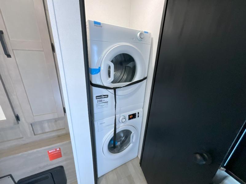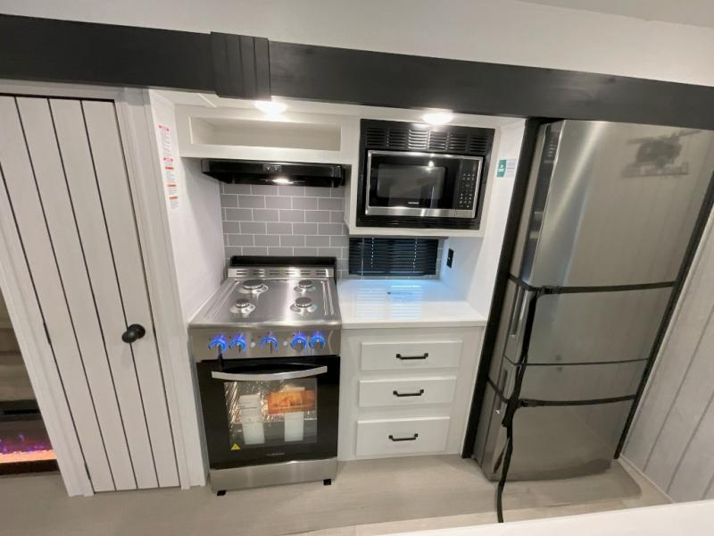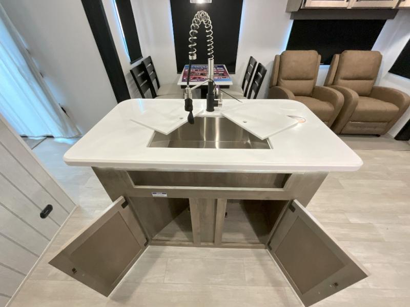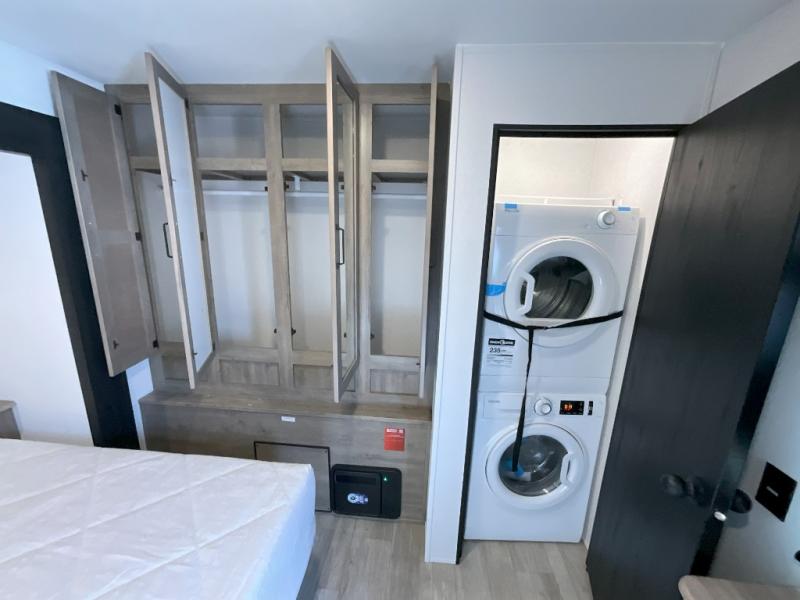 Everyone will want to join you when you head back out to the lake to stay in this trailer! With the middle bunkhouse that includes a bunk above a jiffy sofa and a closet, this can be your kids room or guests headquarters. You will have your own privacy when needed in the front bedroom which includes a queen bed slide and two closets. There is also a dresser and a space within a closet for a washer/dryer prep option. The full bathroom is conveniently located between the two rooms, and the rear of the destination trailer offers a combined living and kitchen area. The dual slides give you lots of floor space around the kitchen island to relax on the booth dinette or sofa, and the cook will have full kitchen amenities including a residential style refrigerator.