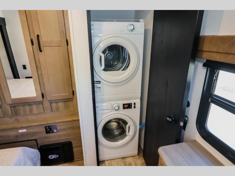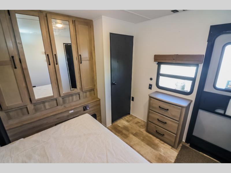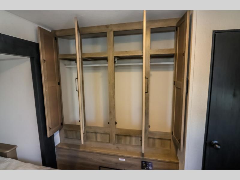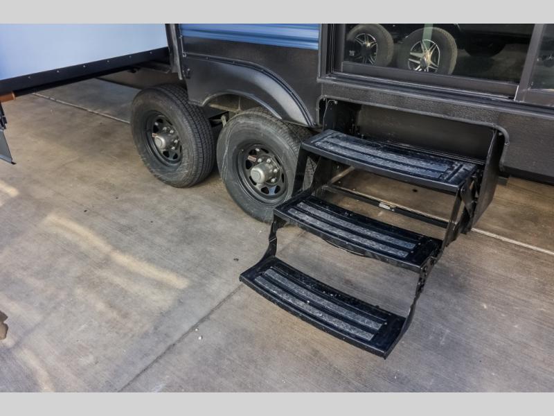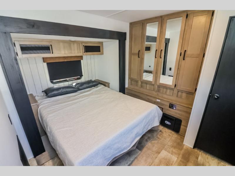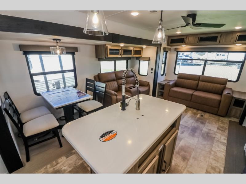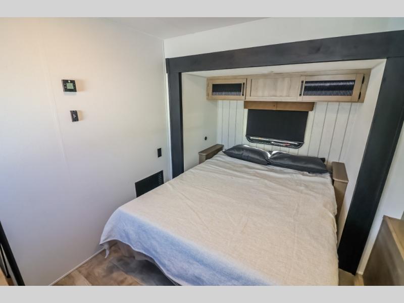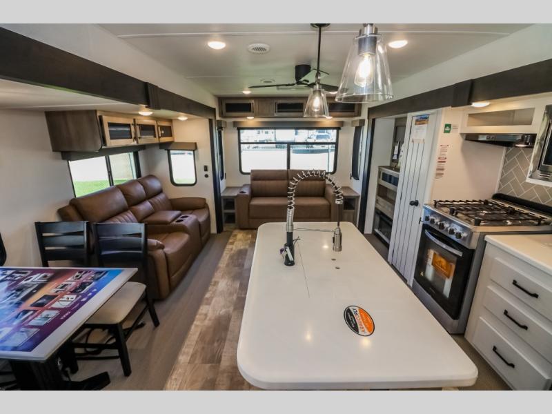 Everyone will want to join you when you head back out to the lake to stay in this trailer! With the middle bunkhouse that includes a bunk above a jiffy sofa and a closet, this can be your kids room or guest's headquarters. You will have your own privacy when needed in the front bedroom which includes a queen bed slide and two closets. There is also a dresser and a space within a closet for a washer/dryer prep. The full bathroom is conveniently located between the two rooms, and the rear of the trailer offers a combined living and kitchen area. The dual slides give you lots of floor space around the kitchen island as you prep dinner. There is also a table and chairs to dine at, plus theater seating and a sofa for even more seating and sleeping space!