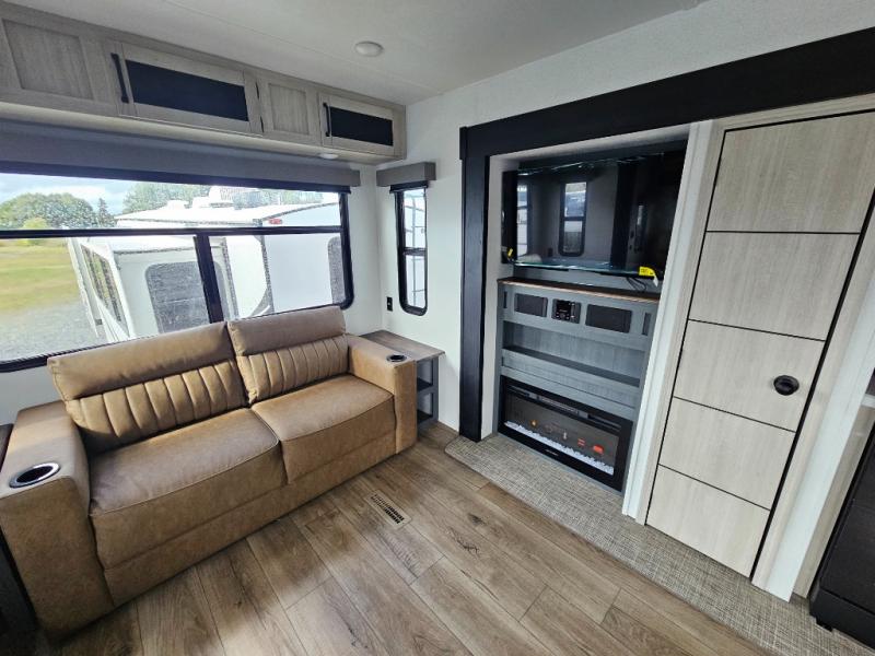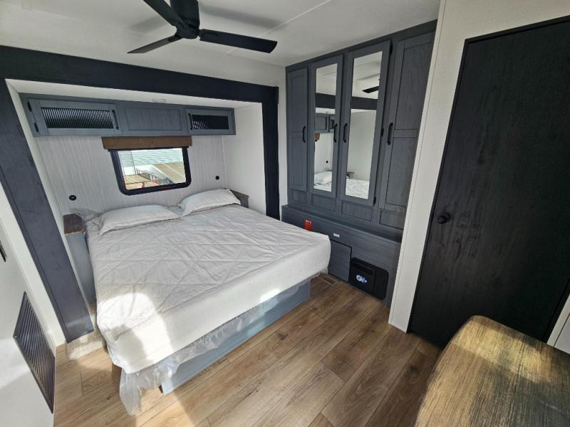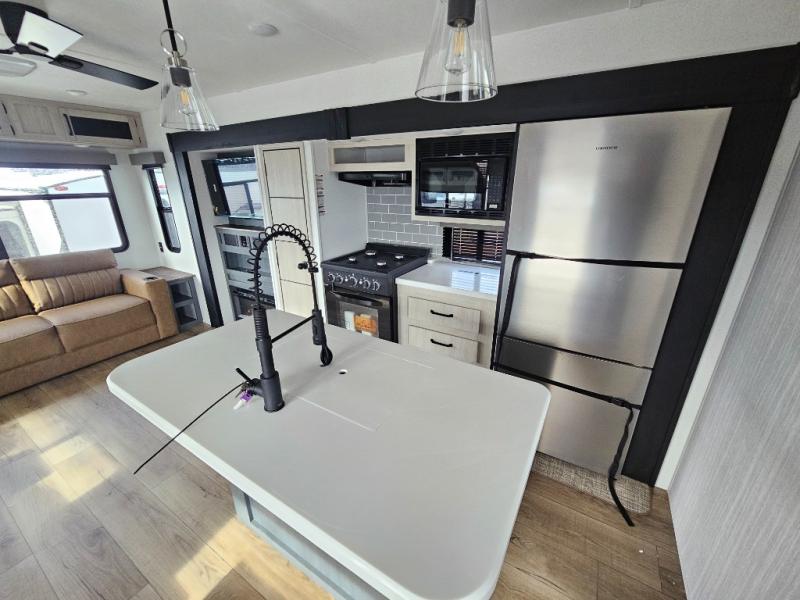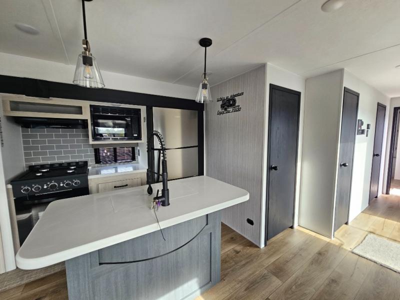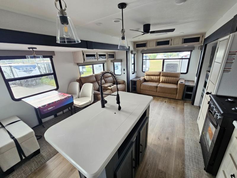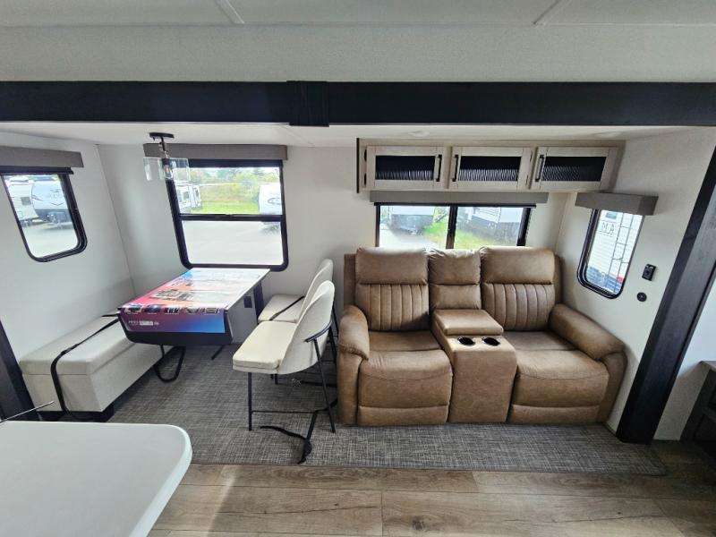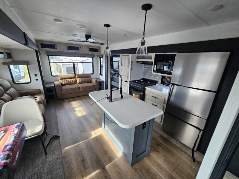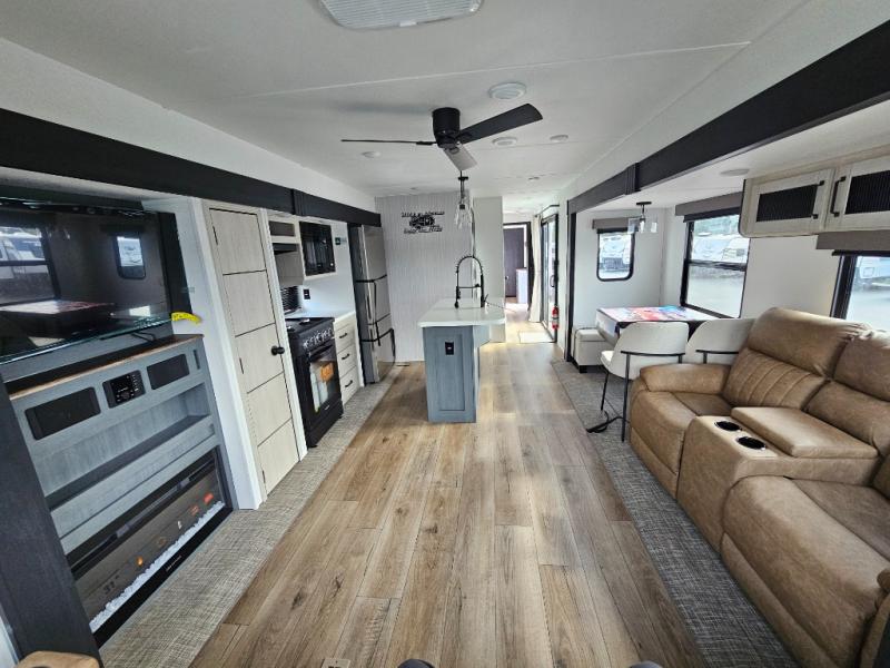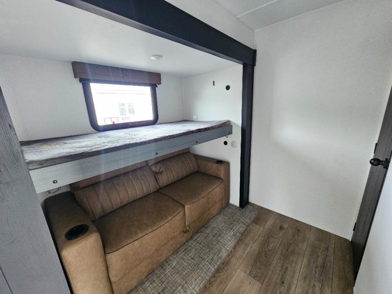 Everyone will want to join you when you head back out to the lake to stay in this trailer! With the middle bunkhouse that includes a bunk above a jiffy sofa and a closet, this can be your kids room or guests headquarters. You will have your own privacy when needed in the front bedroom which includes a queen bed slide and two closets. There is also a dresser and a space within a closet for a washer/dryer prep option. The full bathroom is conveniently located between the two rooms, and the rear of the destination trailer offers a combined living and kitchen area. The dual slides give you lots of floor space around the kitchen island to relax on the booth dinette or sofa, and the cook will have full kitchen amenities including a residential style refrigerator.