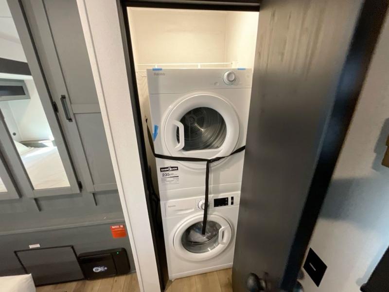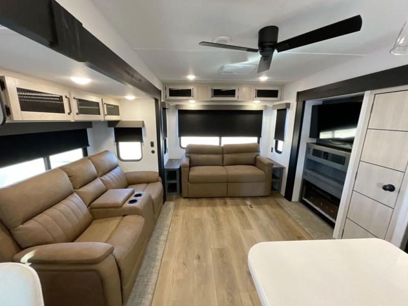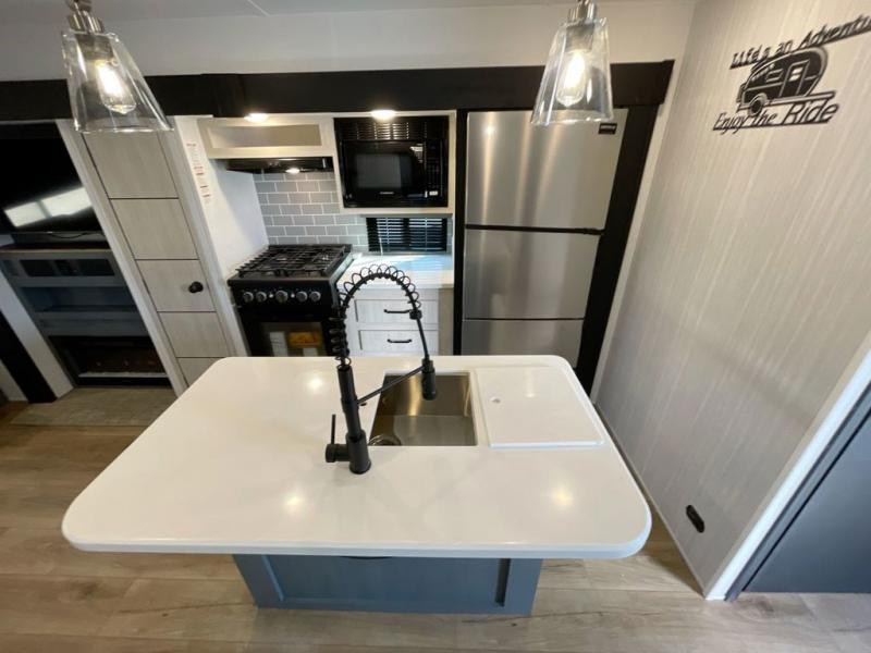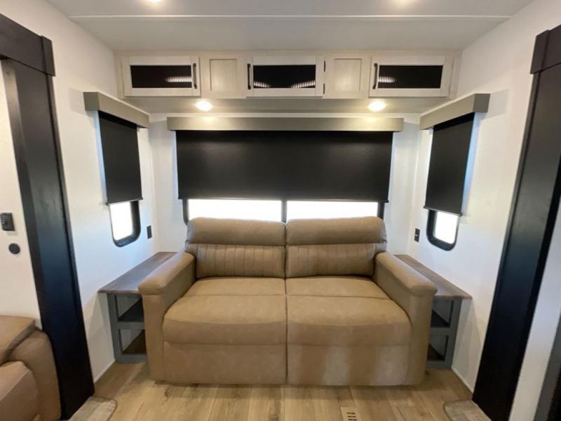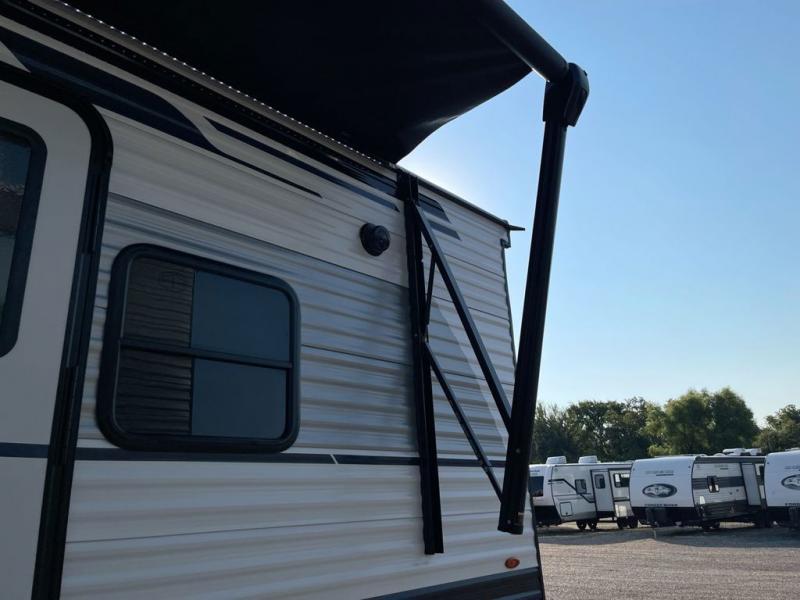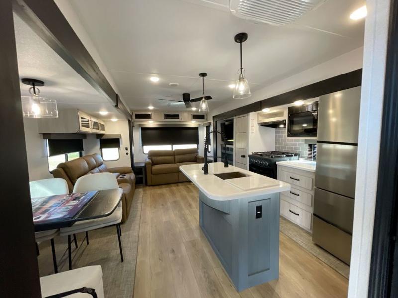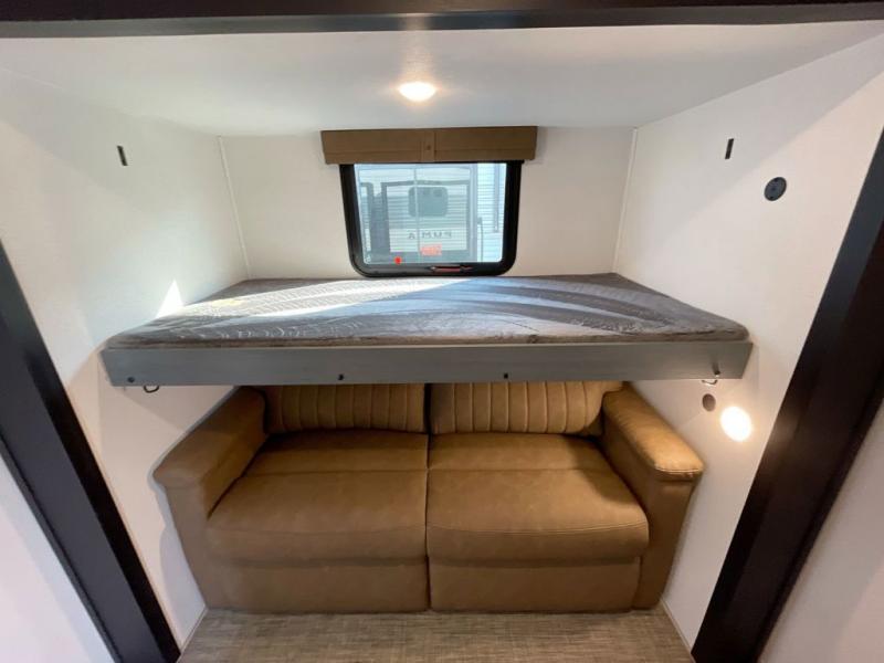 Everyone will want to join you when you head back out to the lake to stay in this trailer! With the middle bunkhouse that includes a bunk above a jiffy sofa and a closet, this can be your kids room or guests headquarters. You will have your own privacy when needed in the front bedroom which includes a queen bed slide and two closets. There is also a dresser and a space within a closet for a washer/dryer prep option. The full bathroom is conveniently located between the two rooms, and the rear of the destination trailer offers a combined living and kitchen area. The dual slides give you lots of floor space around the kitchen island to relax on the booth dinette or sofa, and the cook will have full kitchen amenities including a residential style refrigerator.