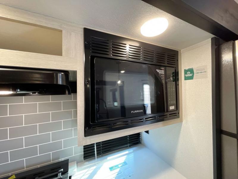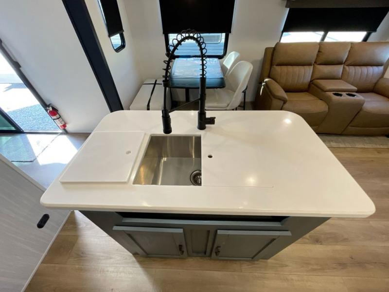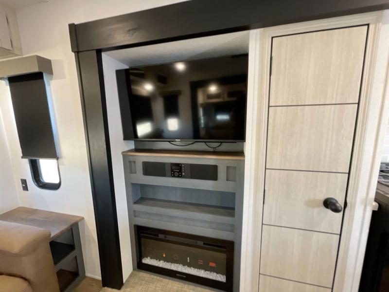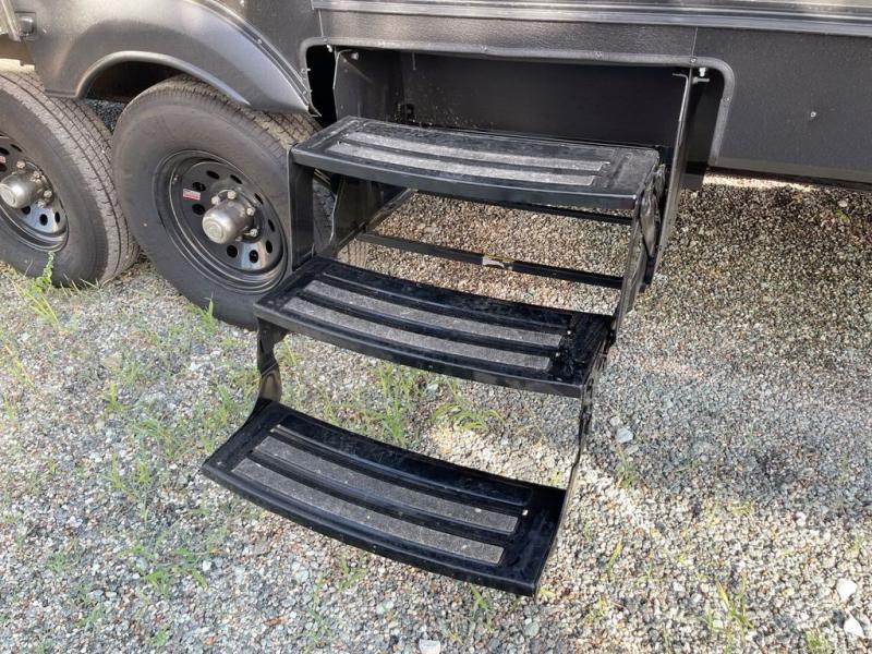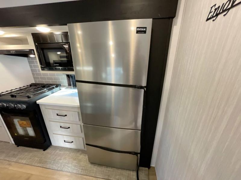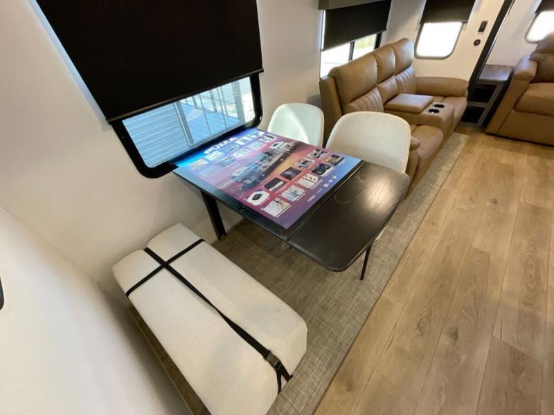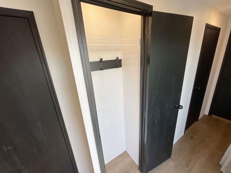 Everyone will want to join you when you head back out to the lake to stay in this trailer! With the middle bunkhouse that includes a bunk above a jiffy sofa and a closet, this can be your kids room or guests headquarters. You will have your own privacy when needed in the front bedroom which includes a queen bed slide and two closets. There is also a dresser and a space within a closet for a washer/dryer prep option. The full bathroom is conveniently located between the two rooms, and the rear of the destination trailer offers a combined living and kitchen area. The dual slides give you lots of floor space around the kitchen island to relax on the booth dinette or sofa, and the cook will have full kitchen amenities including a residential style refrigerator.
