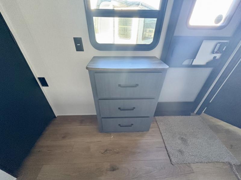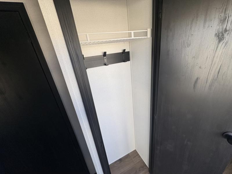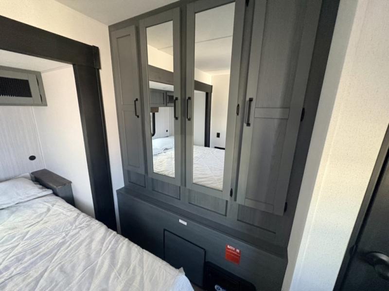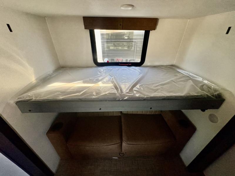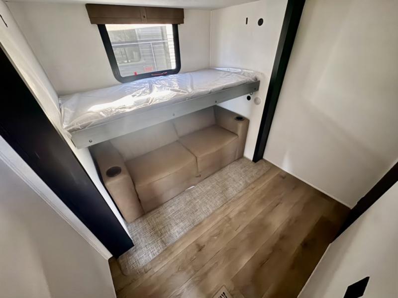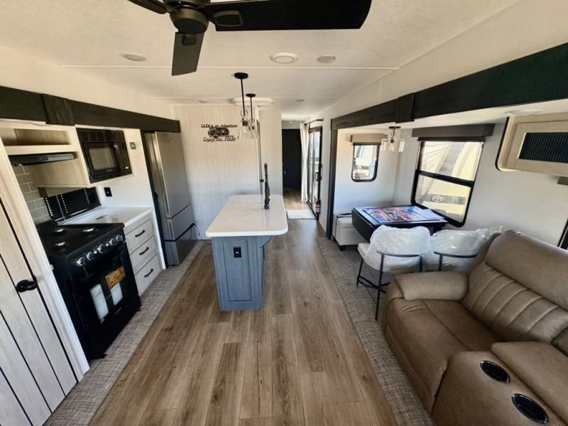Everyone will want to join you when you head back out to the lake to stay in this trailer! With the middle bunkhouse that includes a bunk above a jiffy sofa and a closet, this can be your kids room or guest's headquarters. You will have your own privacy when needed in the front bedroom which includes a queen bed slide and two closets. There is also a dresser and a space within a closet for a washer/dryer prep. The full bathroom is conveniently located between the two rooms, and the rear of the trailer offers a combined living and kitchen area. The dual slides give you lots of floor space around the kitchen island as you prep dinner. There is also a table and chairs to dine at, plus theater seating and a sofa for even more seating and sleeping space!