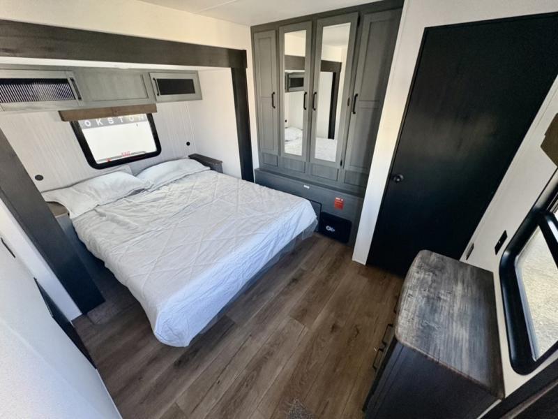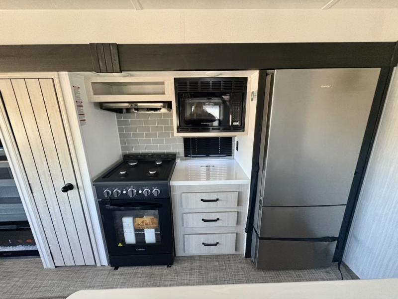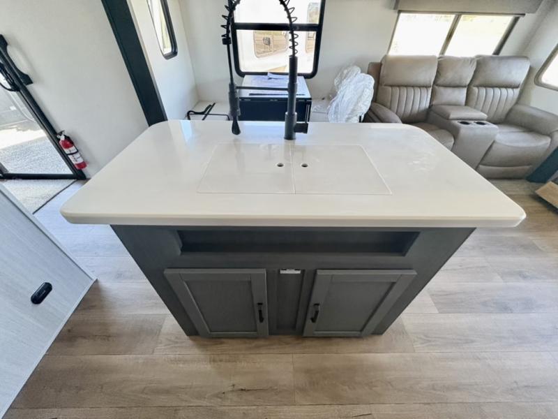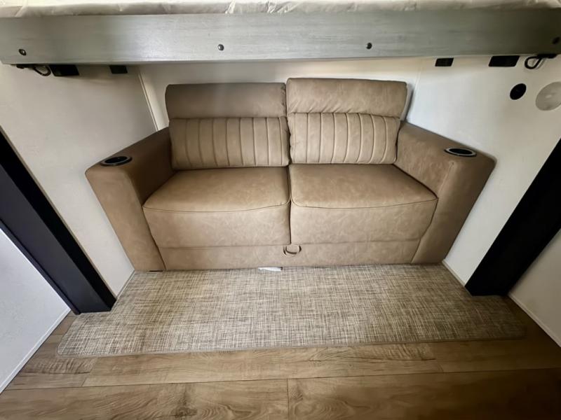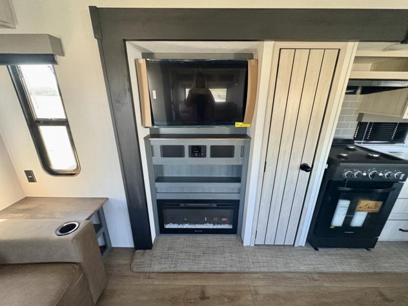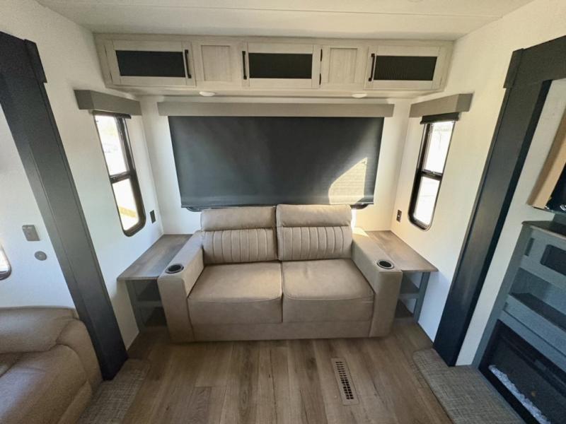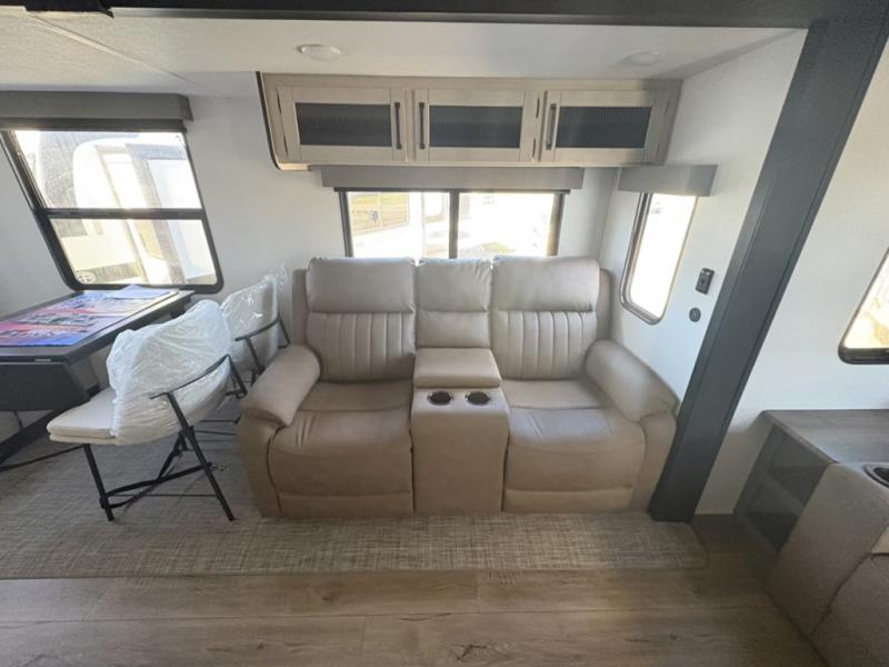 Everyone will want to join you when you head back out to the lake to stay in this trailer! With the middle bunkhouse that includes a bunk above a jiffy sofa and a closet, this can be your kids room or guest's headquarters. You will have your own privacy when needed in the front bedroom which includes a queen bed slide and two closets. There is also a dresser and a space within a closet for a washer/dryer prep. The full bathroom is conveniently located between the two rooms, and the rear of the trailer offers a combined living and kitchen area. The dual slides give you lots of floor space around the kitchen island as you prep dinner. There is also a table and chairs to dine at, plus theater seating and a sofa for even more seating and sleeping space!