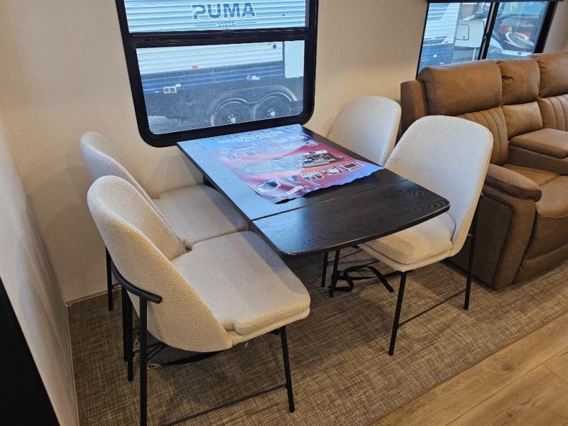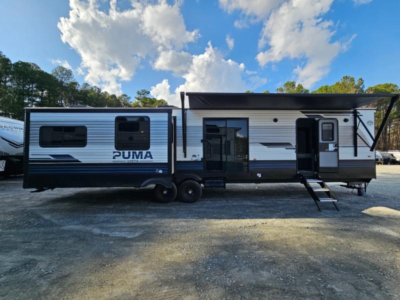The Puma Vista 38RLB is designed for relaxing extended stays at your favorite destination. With a middle bunkhouse, rear living area, kitchen island, and theater seating, this destination trailer offers residential-style comfort and plenty of room for family and guests.