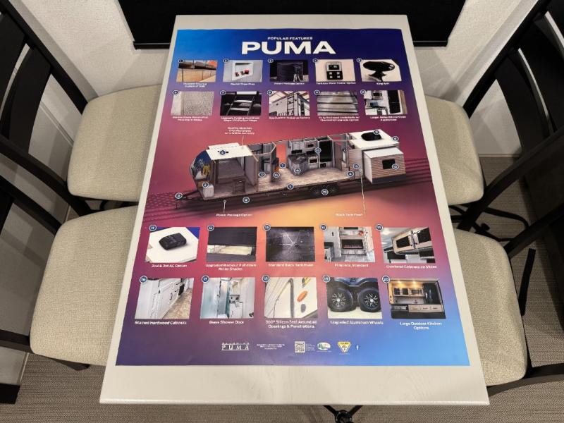 Each Puma Destination trailer by Palomino is designed to give you unforgettable getaways to the destination of your choice! The Value Shopper Package features Congoleum linoleum, LED lighting, an AM/FM/Bluetooth stereo, and an upgraded kitchen faucet to name a few comforts. Two exterior speakers are included with the required Marquis Edition, along with solid surface countertops, night roller shades, an outside shower, and four stabilizer jacks to help keep your unit secure. You will also appreciate the roof and side mount solar prep for off-grid capabilities, as well as WiFi prep if you need the option to work while you're away from home!