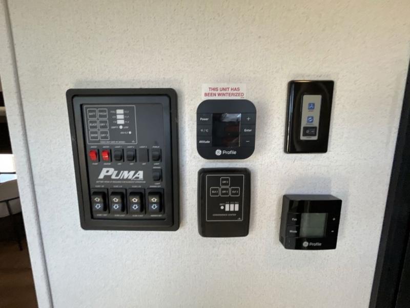 Get out of town and start enjoying the beautiful weather and scenery where you have chosen to place this Puma Destination. This spacious trailer has three slide outs for lots of interior floor space, plus two entries for convenience. The front bedroom offers a king bed slide, two closets, and a dresser. The rear bedroom suite includes a full bathroom and a queen bed slide, a vanity and a wardrobe. In between you can relax in the combined living and kitchen area on the sofa or booth dinette while visiting with the cook with full amenities.