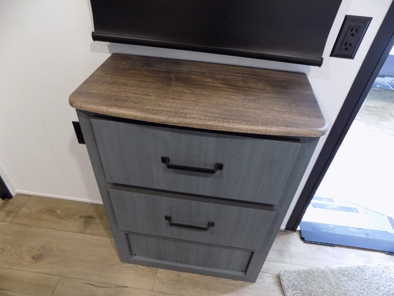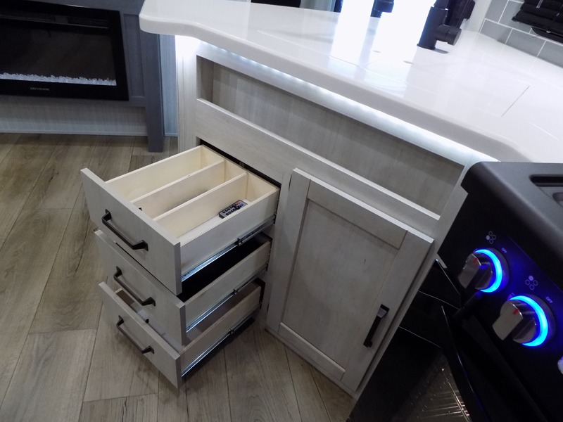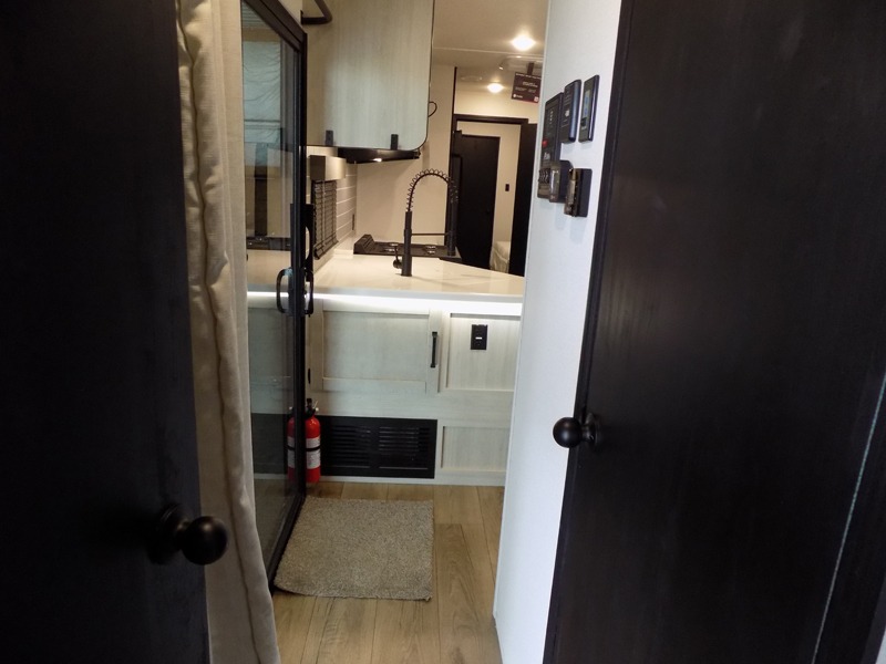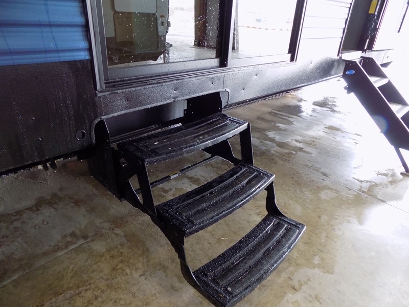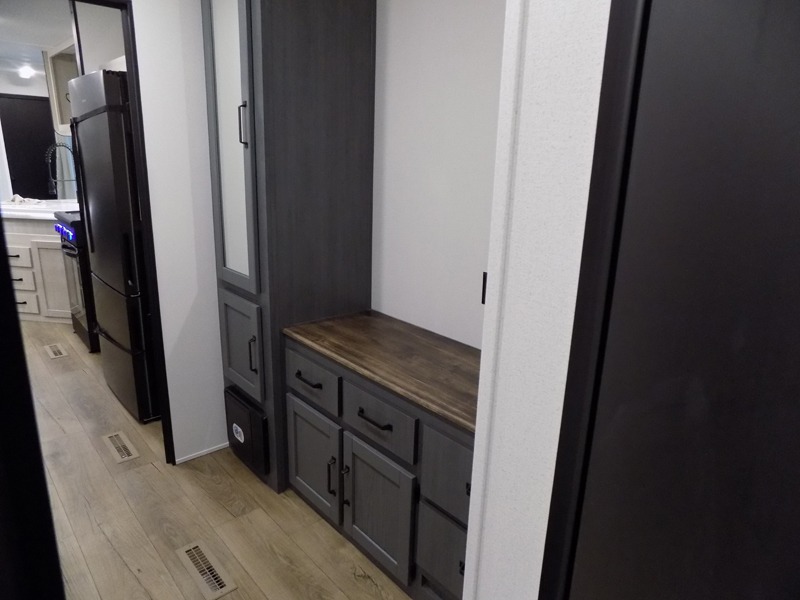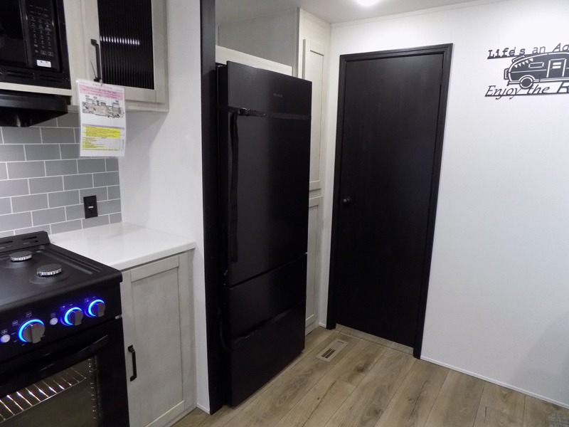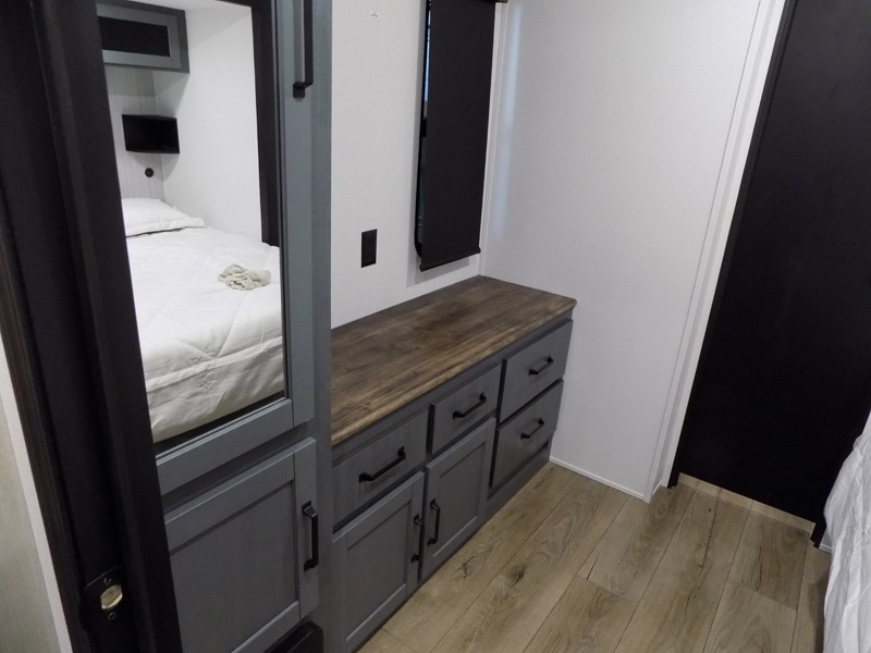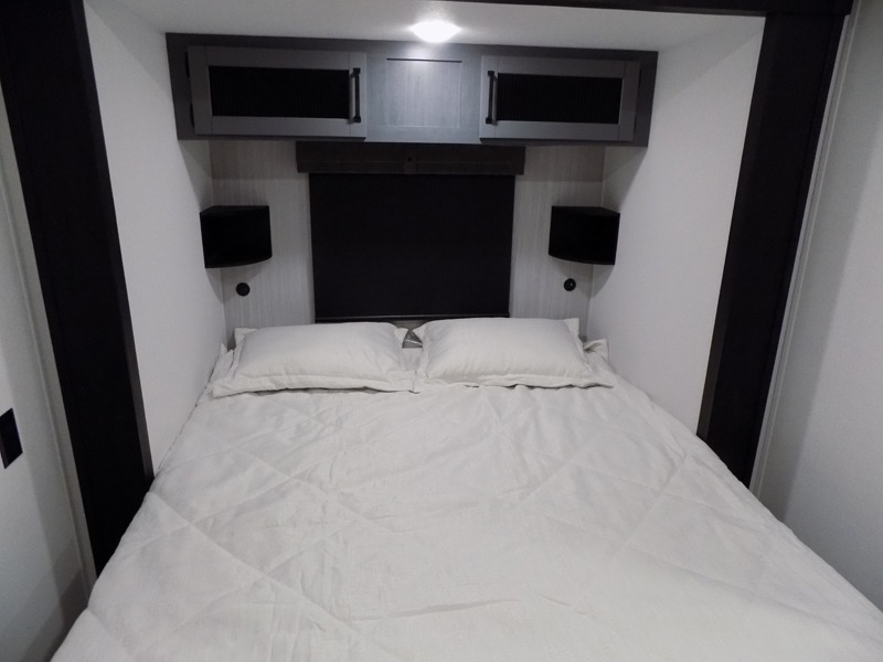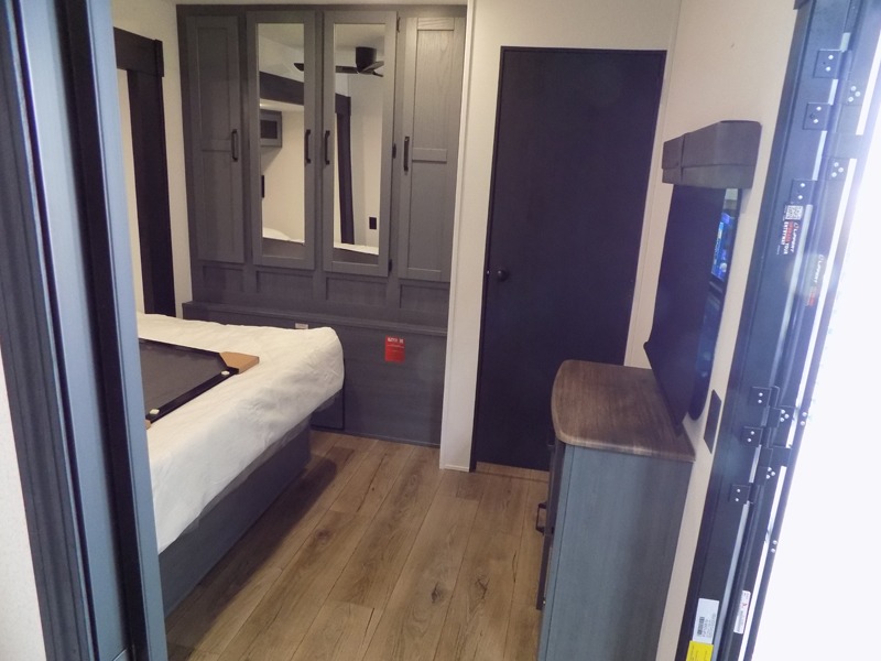 Get out of town and start enjoying the beautiful weather and scenery where you have chosen to place this destination trailer. This spacious trailer has three slide outs for lots of interior floor space, plus two entries for convenience. The front bedroom offers a king bed slide, two closets, and a dresser. The rear bedroom suite includes a full bathroom and a queen bed slide, a vanity and a wardrobe. In between you can relax in the combined living and kitchen area on the sofa or table and chairs while visiting with the cook with full amenities.
