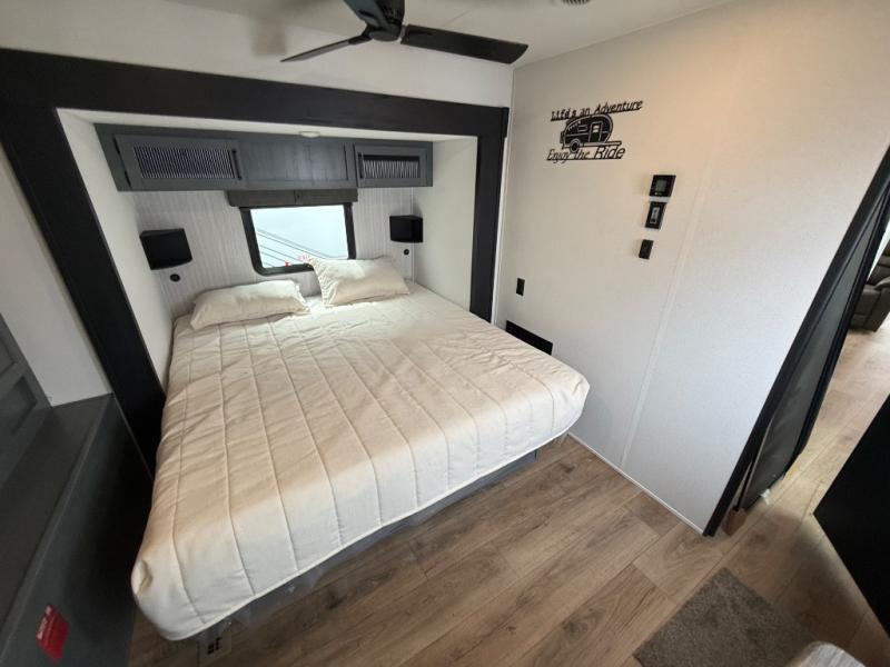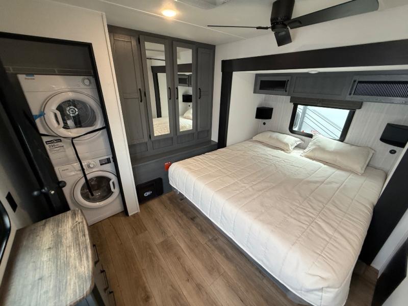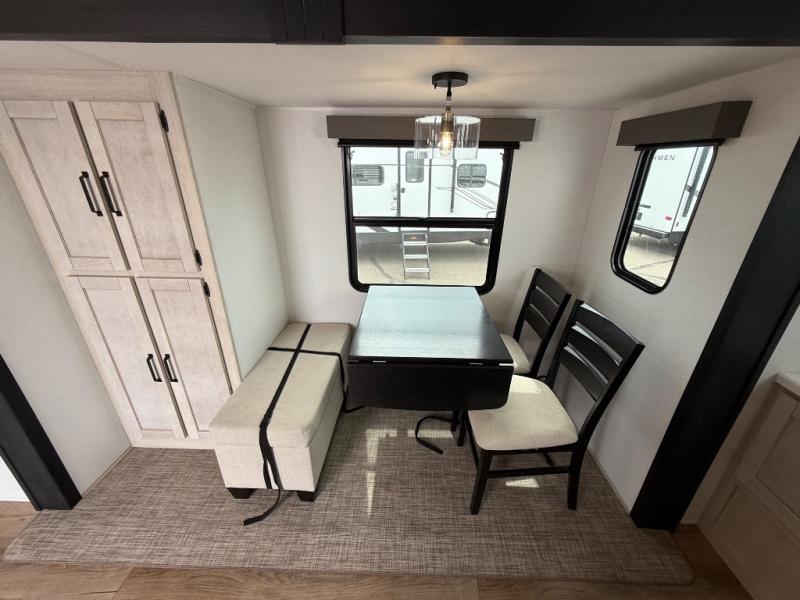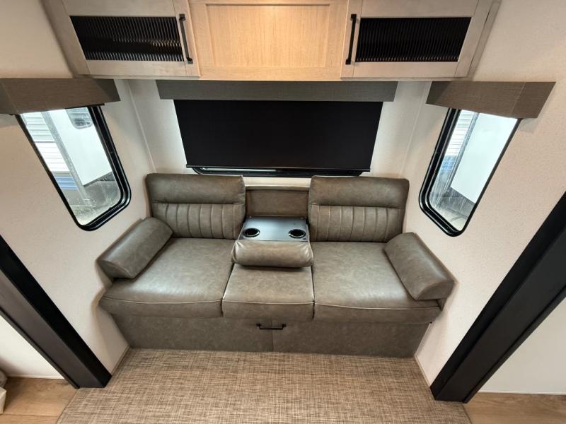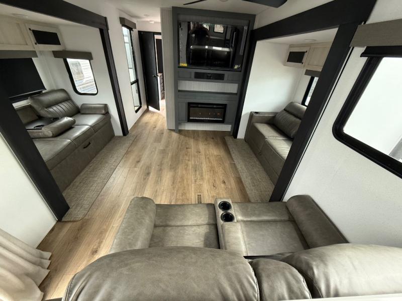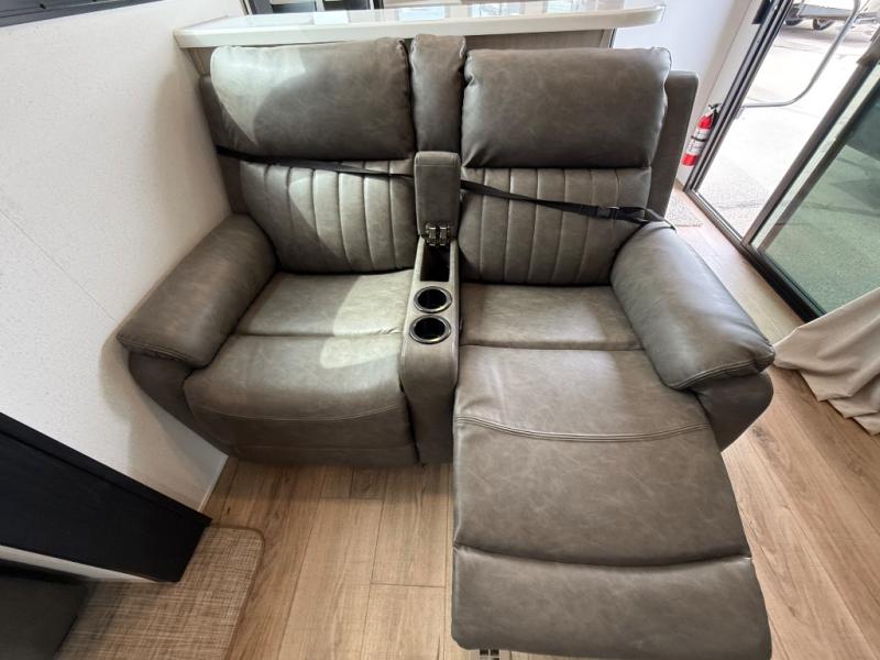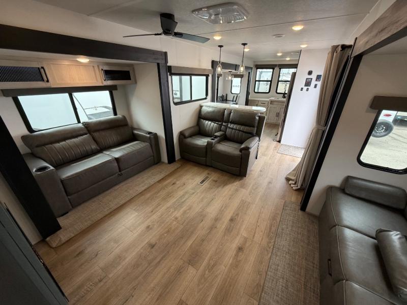 If you are looking for your own space in your next destination trailer, you have found it! With a front separate kitchen, a middle separate living area, a full bathroom and a rear bedroom, you can call one of these spaces your own. The cook will love the front counter space and appliances, and you can dine at the booth dinette or the breakfast nook. Someone can be visiting with friends and family while sitting on the two sofa slides or the two recliners, while another is getting ready in the full bathroom. You will sleep soundly on the king bed slide out, and the closet with washer and dryer prep option will make full-time RV living easier than ever.