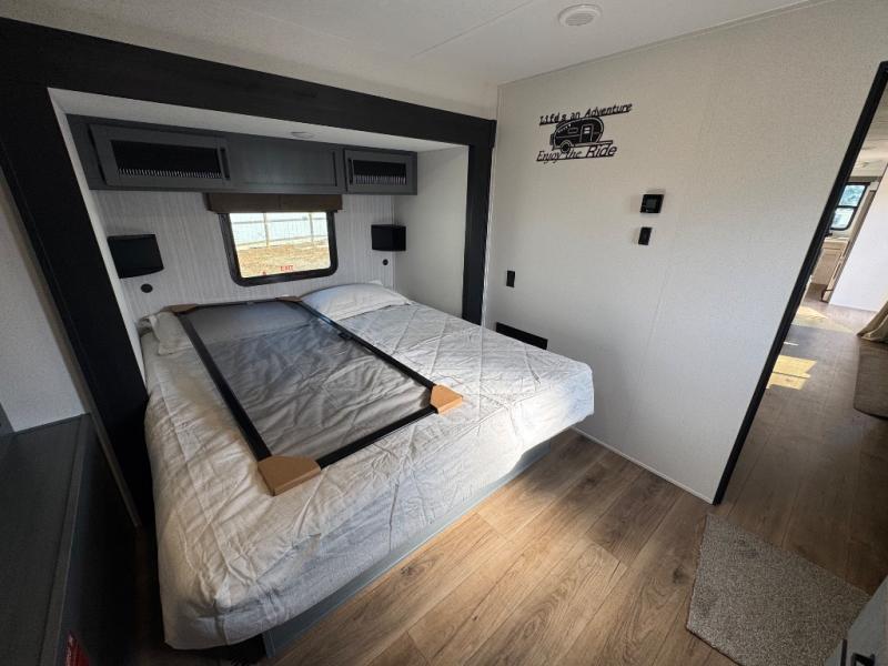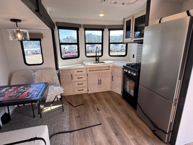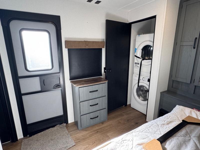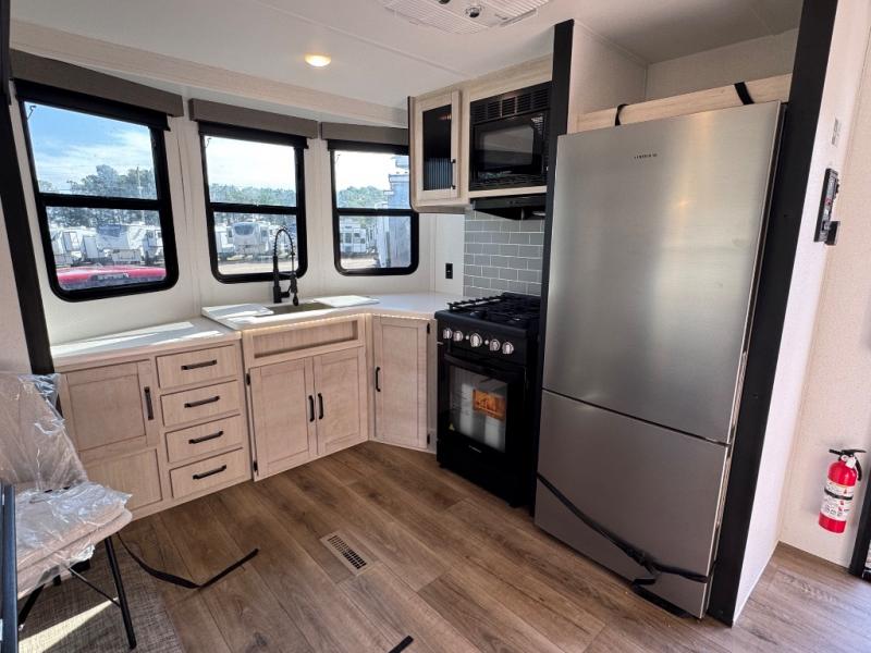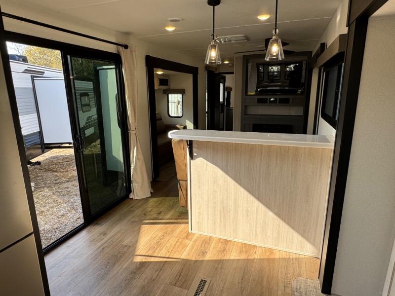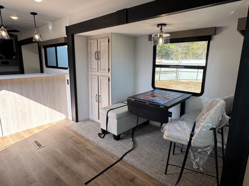 If you are looking for your own space in your next destination trailer, you have found it! With a front separate kitchen, a middle separate living area, a full bathroom and a rear bedroom, you can call one of these spaces your own. The cook will love the front counter space and appliances, and you can dine at the table and chairs or the breakfast nook. Someone can be visiting with friends and family while sitting on the two sofa slides or the theater seating, while another is getting ready in the full bathroom. You will sleep soundly on the king bed slide out, and the closet with washer and dryer prep will make full-time RV living easier than ever.