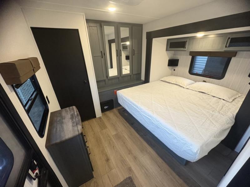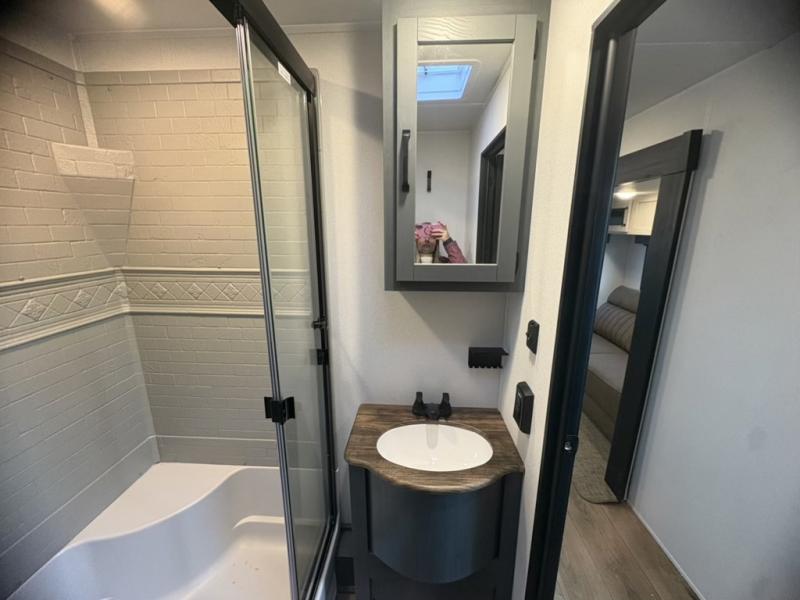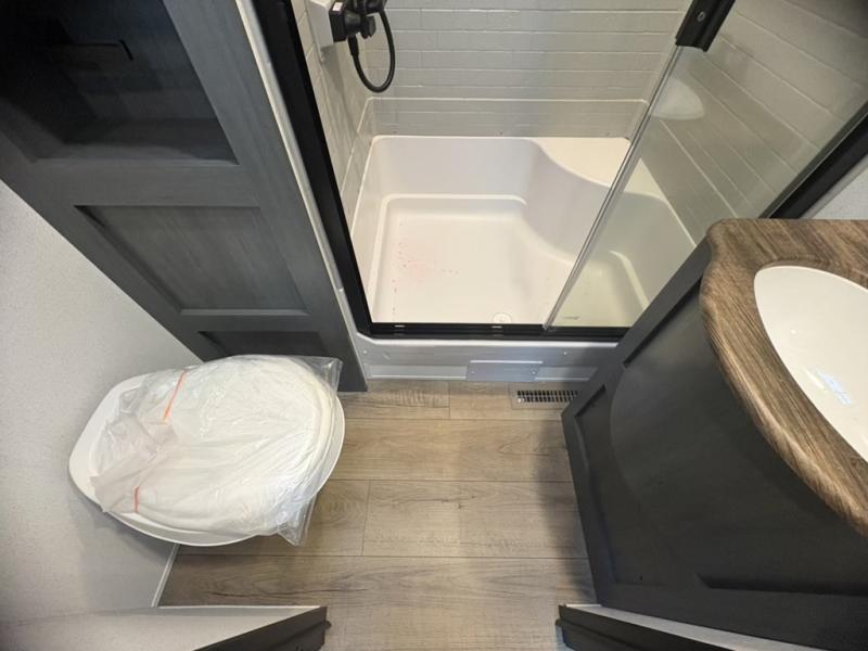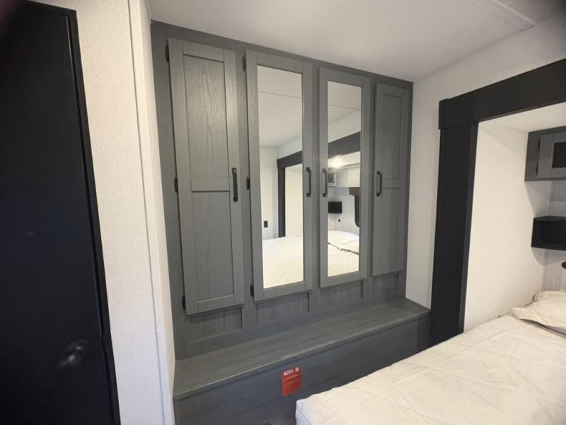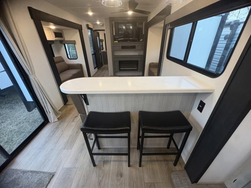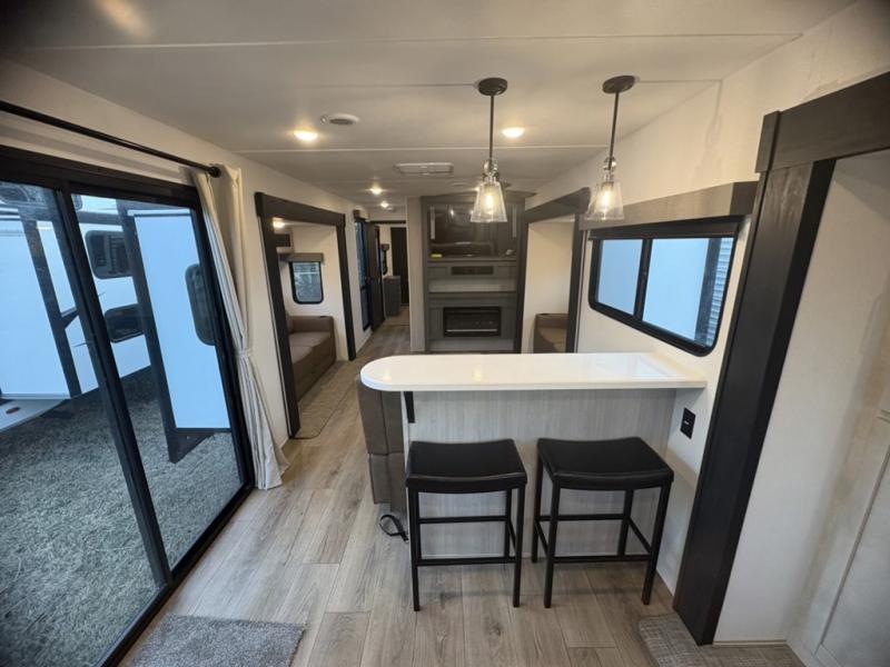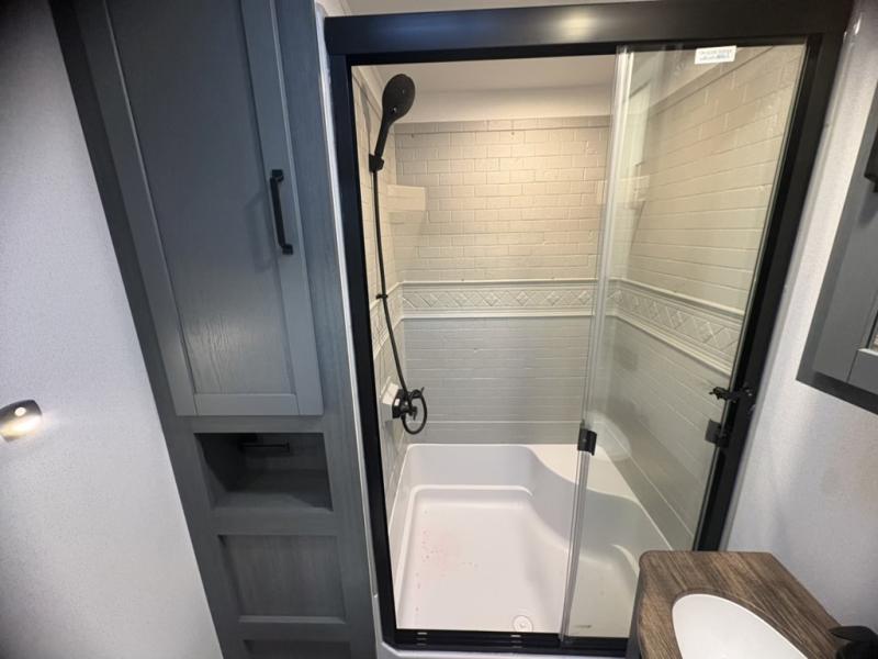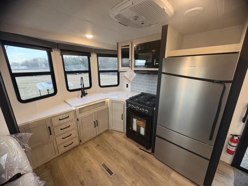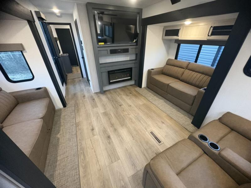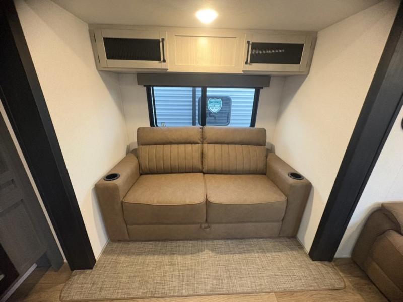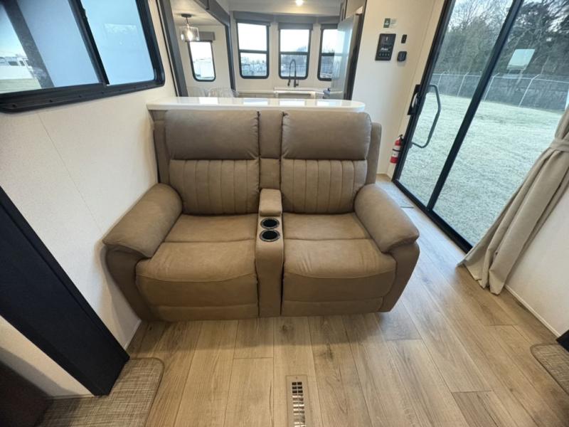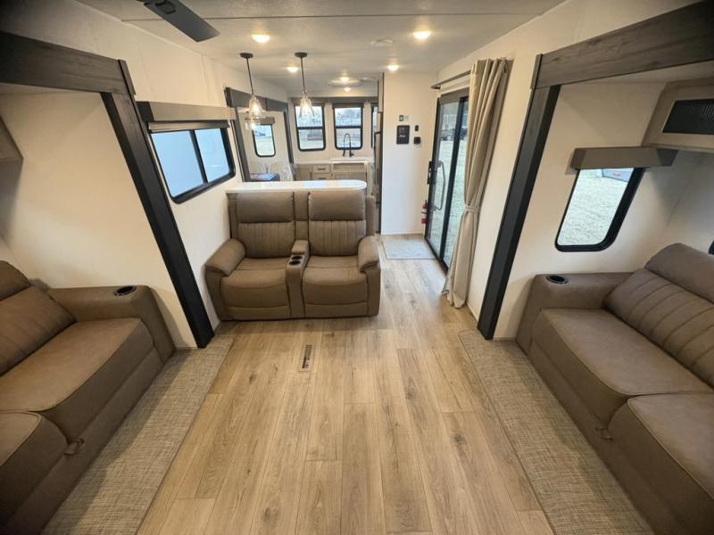 If you are looking for your own space in your next destination trailer, you have found it! With a front separate kitchen, a middle separate living area, a full bathroom and a rear bedroom, you can call one of these spaces your own. The cook will love the front counter space and appliances, and you can dine at the table and chairs or the breakfast nook. Someone can be visiting with friends and family while sitting on the two sofa slides or the theater seating, while another is getting ready in the full bathroom. You will sleep soundly on the king bed slide out, and the closet with washer and dryer prep will make full-time RV living easier than ever.