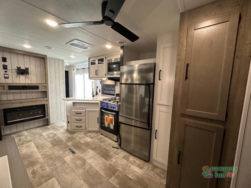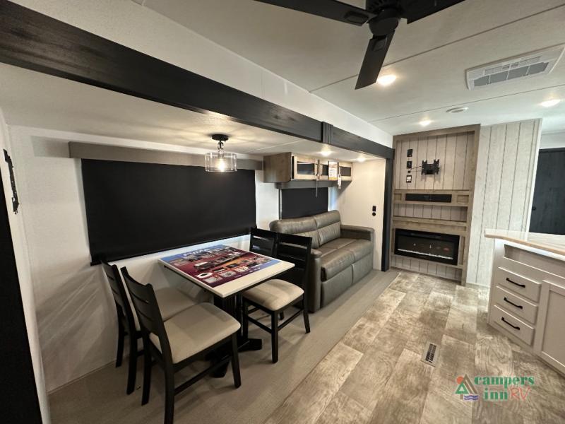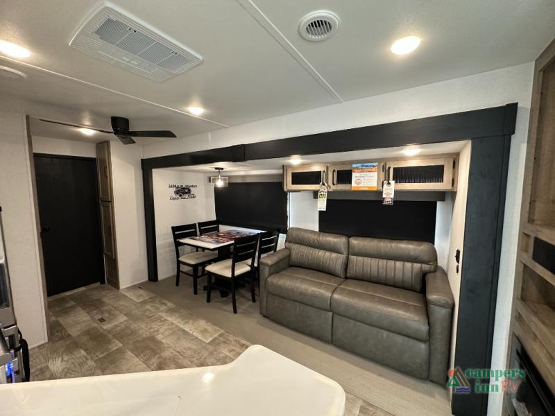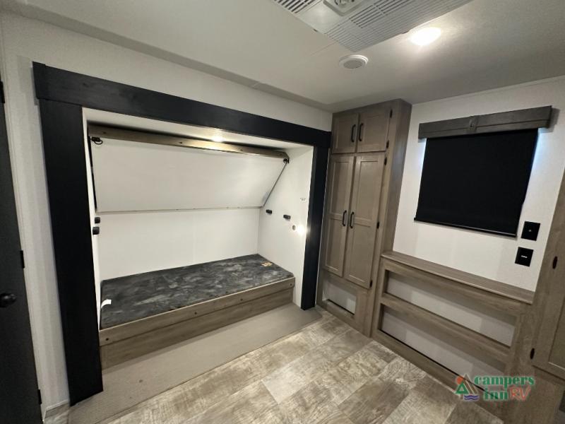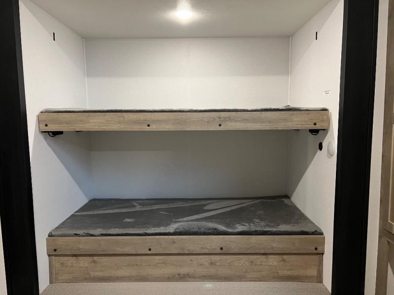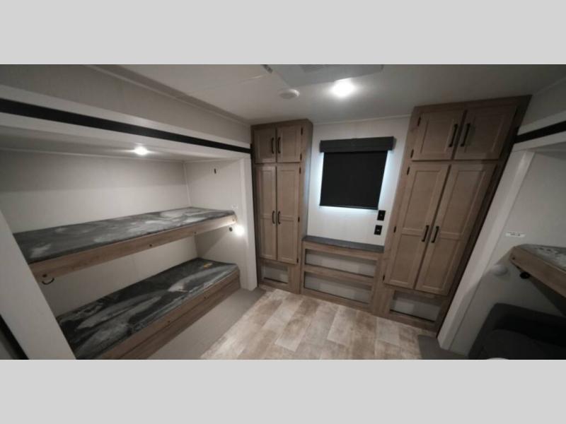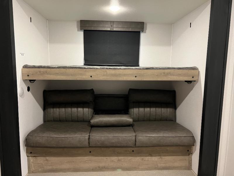 This destination trailer will probably be in the family for years to come with all of its features and amenities such as the rear private bunkhouse with a half bath attached, the dual entry doors for a smooth flow of traffic, and the spacious bedroom with a slide out king-size bed. There is even a closet with the option to add washer and dryer prep. The bunkhouse includes a slide out bunk with a jiffy sofa below, a slide out set of bunks, plus an entertainment center in between two wardrobes. The main living and kitchen area offers full amenities, a U-shaped dinette to dine at, and a sofa to relax on.