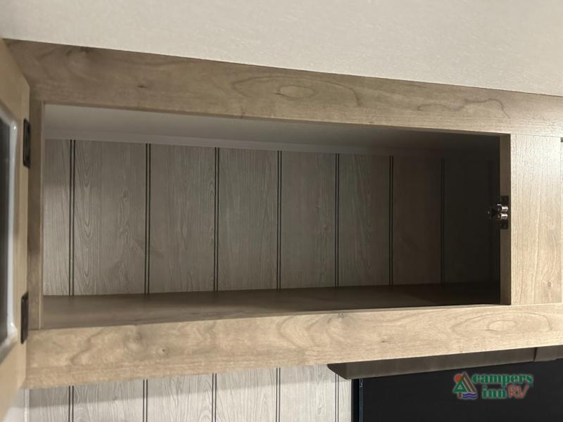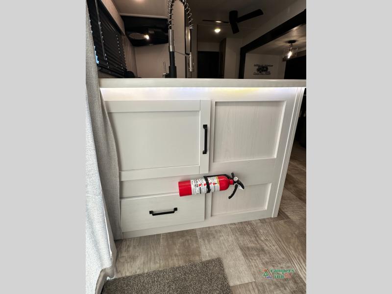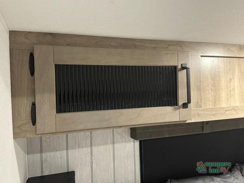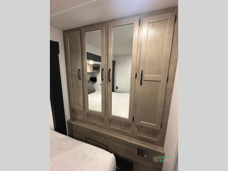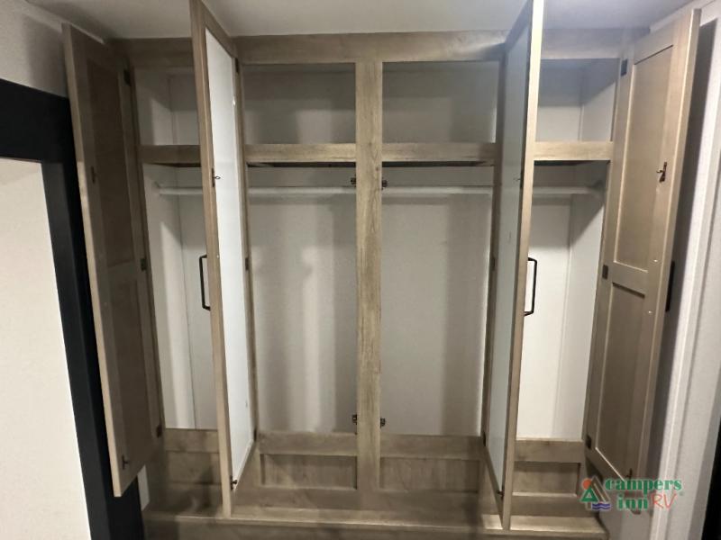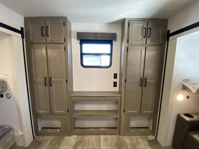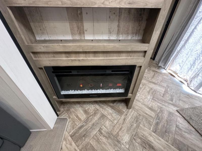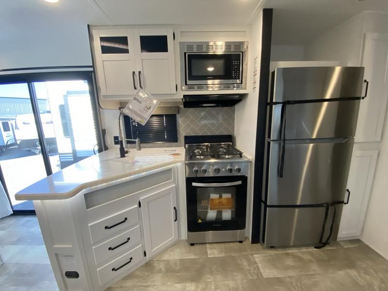 This destination trailer will probably be in the family for years to come with all of its features and amenities such as the rear private bunkhouse with a half bath attached, the dual entry doors for a smooth flow of traffic, and the spacious bedroom with a slide out king-size bed. There is even a closet with the option to add washer and dryer prep. The bunkhouse includes a slide out bunk with a jiffy sofa below, a slide out set of bunks, plus an entertainment center in between two wardrobes. The main living and kitchen area offers full amenities, a U-shaped dinette to dine at, and a sofa to relax on.