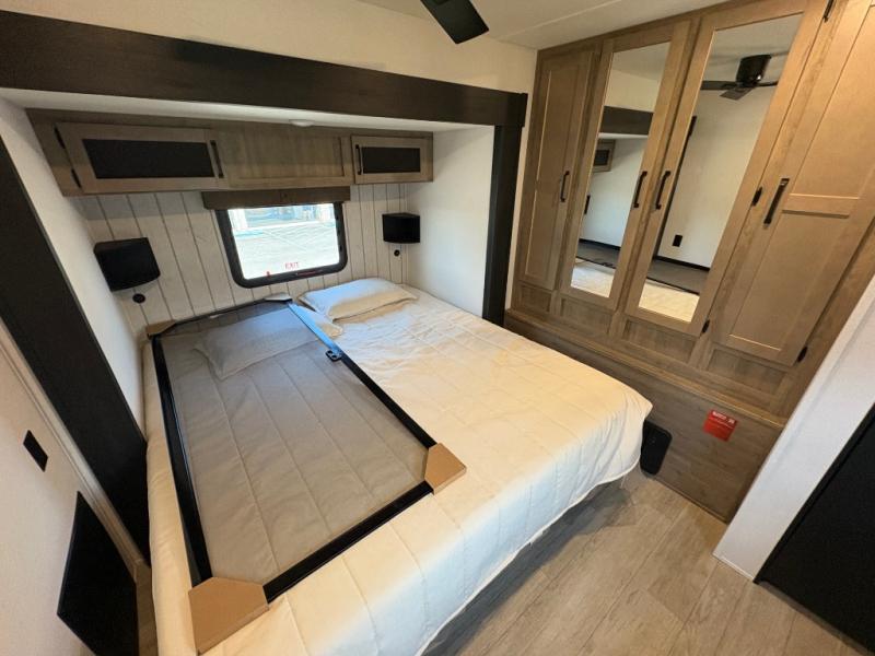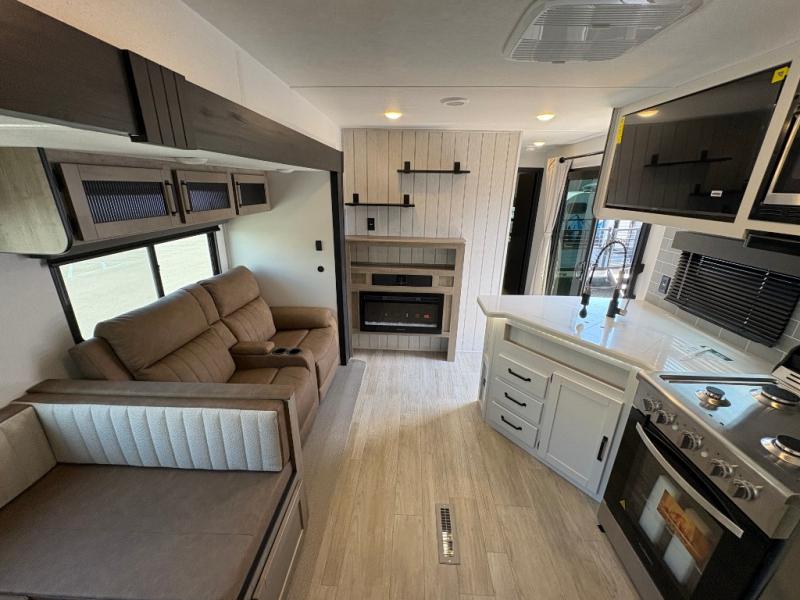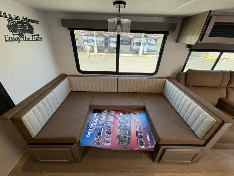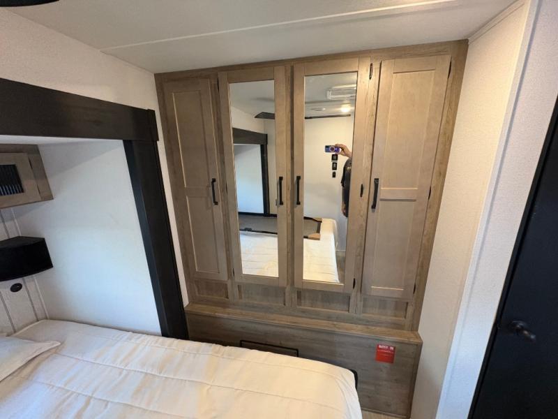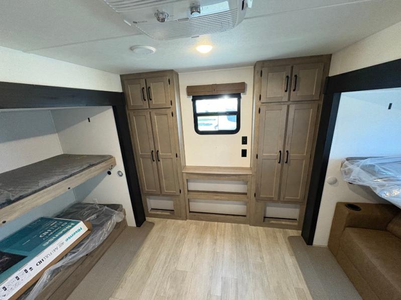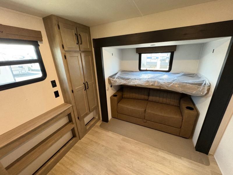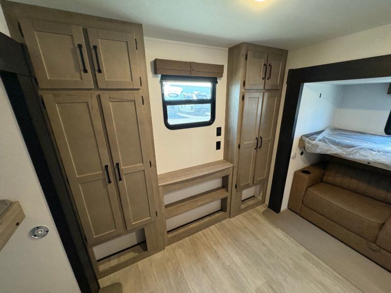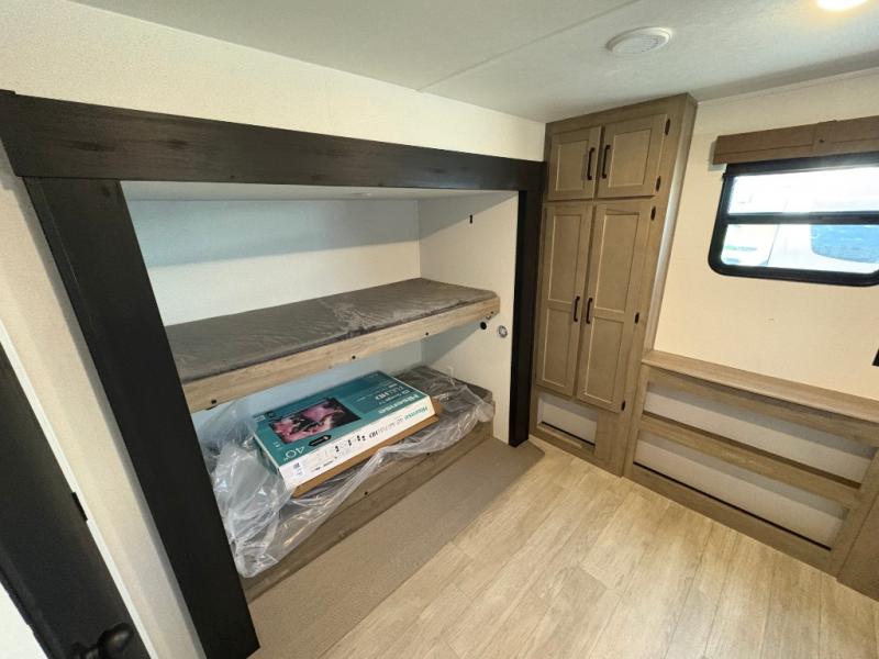 This destination trailer will probably be in the family for years to come with all of its features and amenities such as the rear private bunkhouse with a half bath attached, the dual entry doors for a smooth flow of traffic, and the spacious bedroom with a slide out king-size bed. There is even a closet with the option to add washer and dryer prep. The bunkhouse includes a slide out bunk with a jiffy sofa below, a slide out set of bunks, plus an entertainment center in between two wardrobes. The main living and kitchen area offers full amenities, a U-shaped dinette to dine at, and a sofa to relax on. You even have an optional outside kitchen to cook meals in the great outdoors!