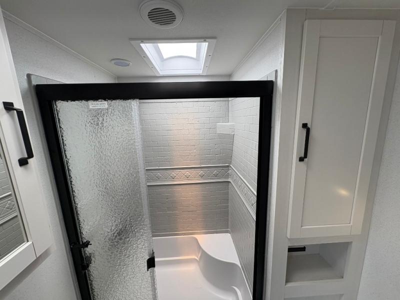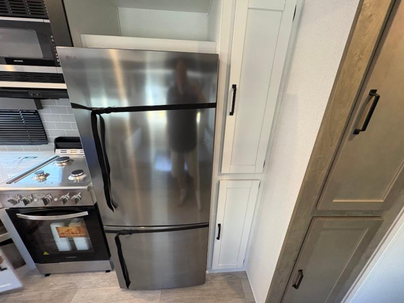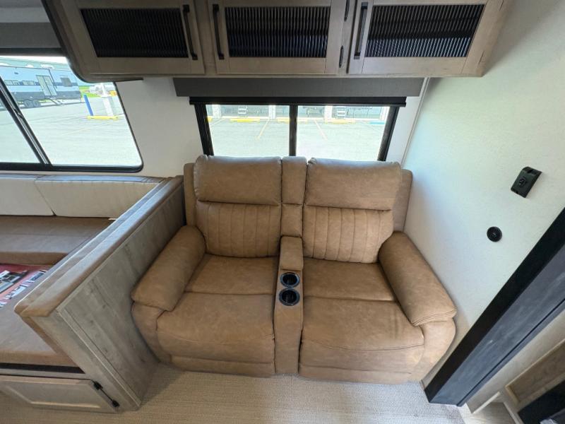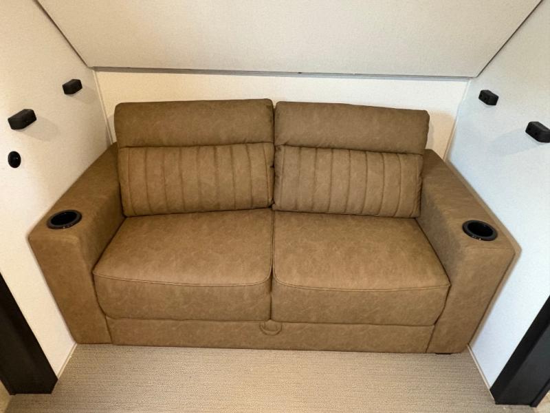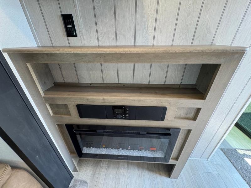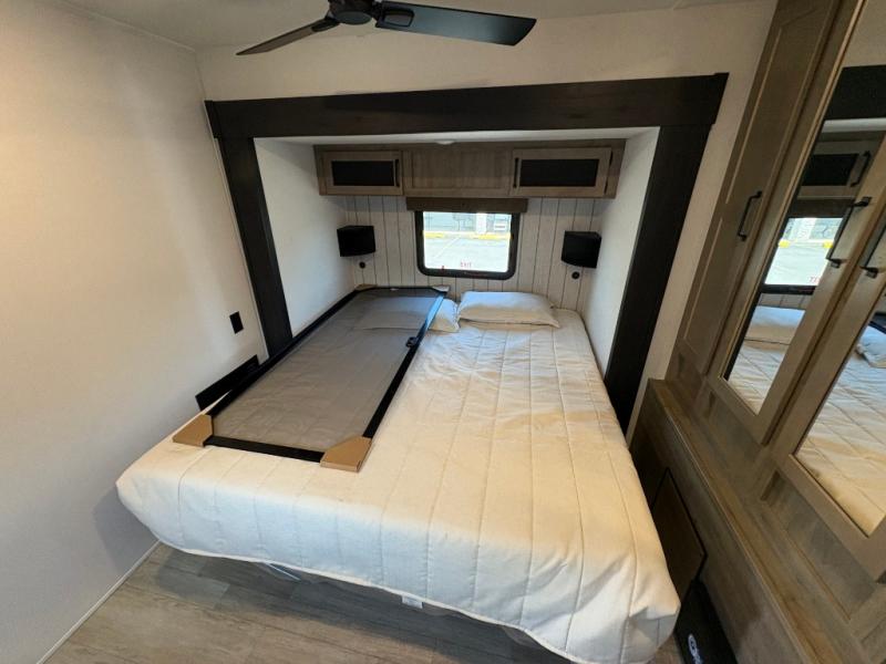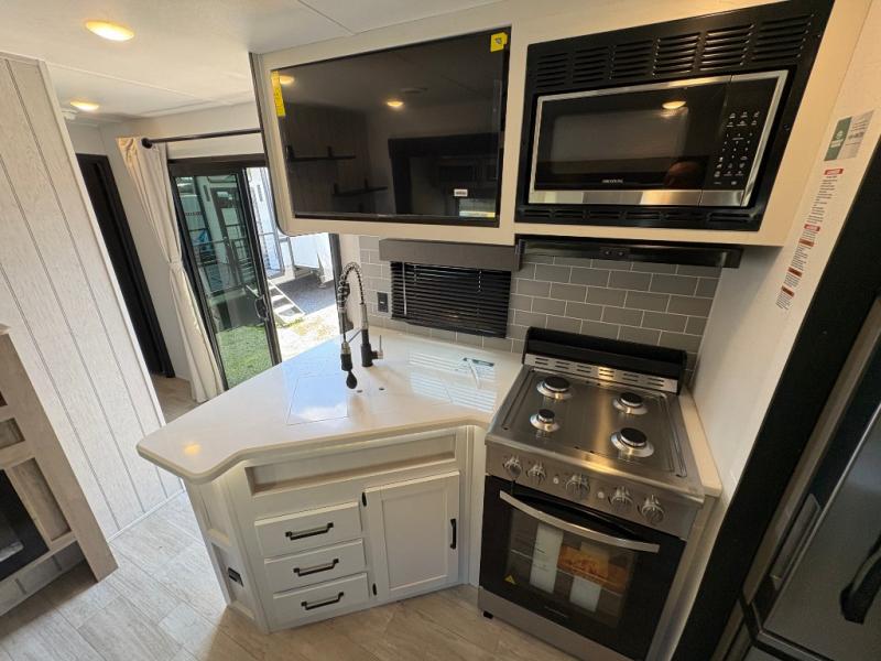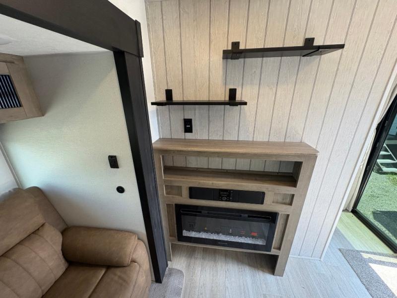 This destination trailer will probably be in the family for years to come with all of its features and amenities such as the rear private bunkhouse with a half bath attached, the dual entry doors for a smooth flow of traffic, and the spacious bedroom with a slide out king-size bed. There is even a closet with the option to add washer and dryer prep. The bunkhouse includes a slide out bunk with a jiffy sofa below, a slide out set of bunks, plus an entertainment center in between two wardrobes. The main living and kitchen area offers full amenities, a U-shaped dinette to dine at, and a sofa to relax on. You even have an optional outside kitchen to cook meals in the great outdoors!