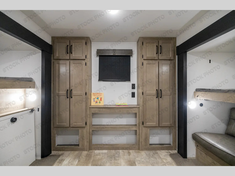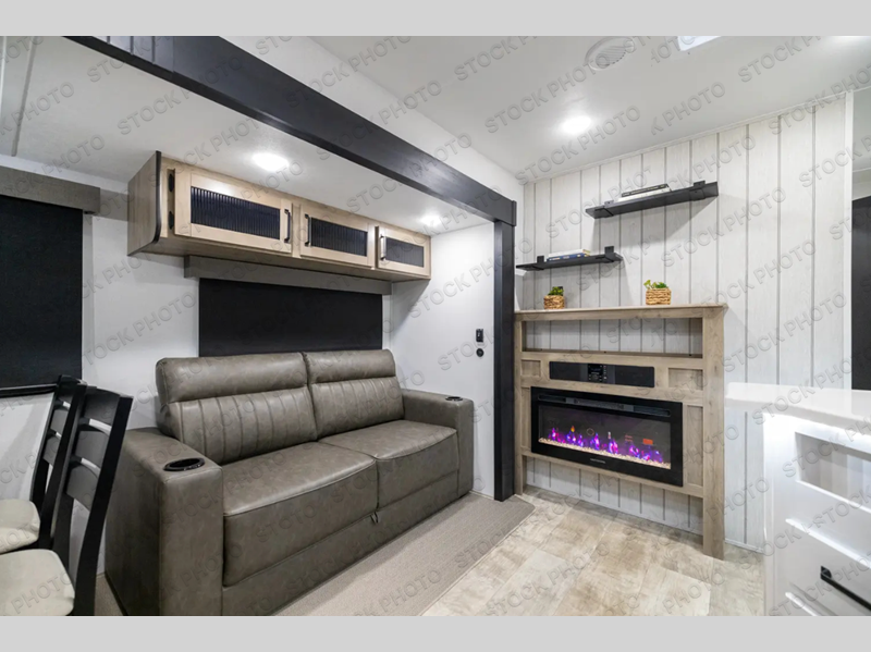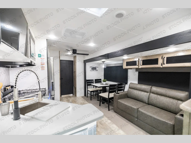 This destination trailer will probably be in the family for years to come with all of its features and amenities such as the rear private bunkhouse with a half bath attached, the dual entry doors for a smooth flow of traffic, and the spacious bedroom with a slide out king-size bed. There is even a closet with the option to add washer and dryer prep. The bunkhouse includes a slide out bunk with a jiffy sofa below, a slide out set of bunks, plus an entertainment center in between two wardrobes. The main living and kitchen area offers full amenities, a U-shaped dinette to dine at, and a sofa to relax on. You even have an optional outside kitchen to cook meals in the great outdoors!