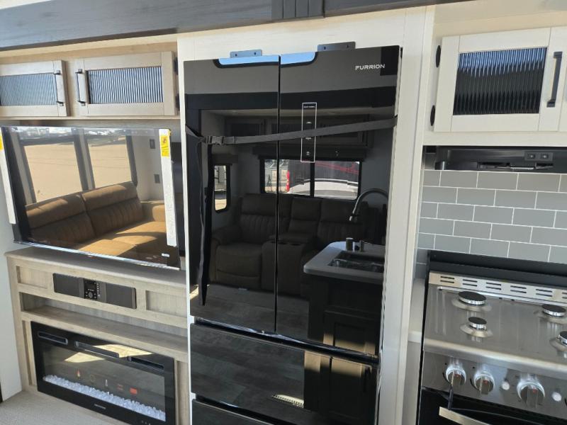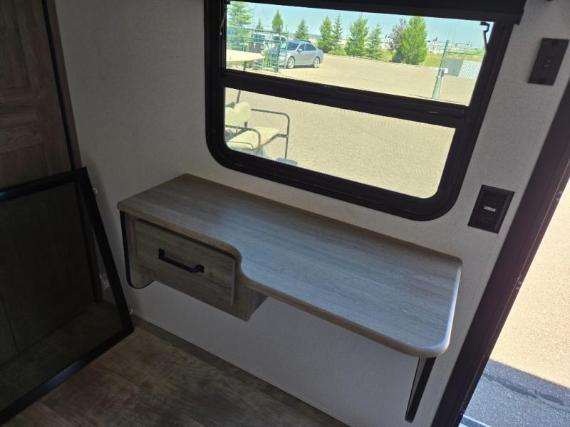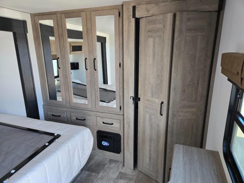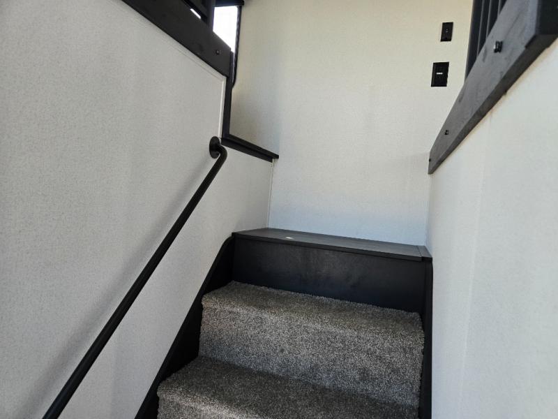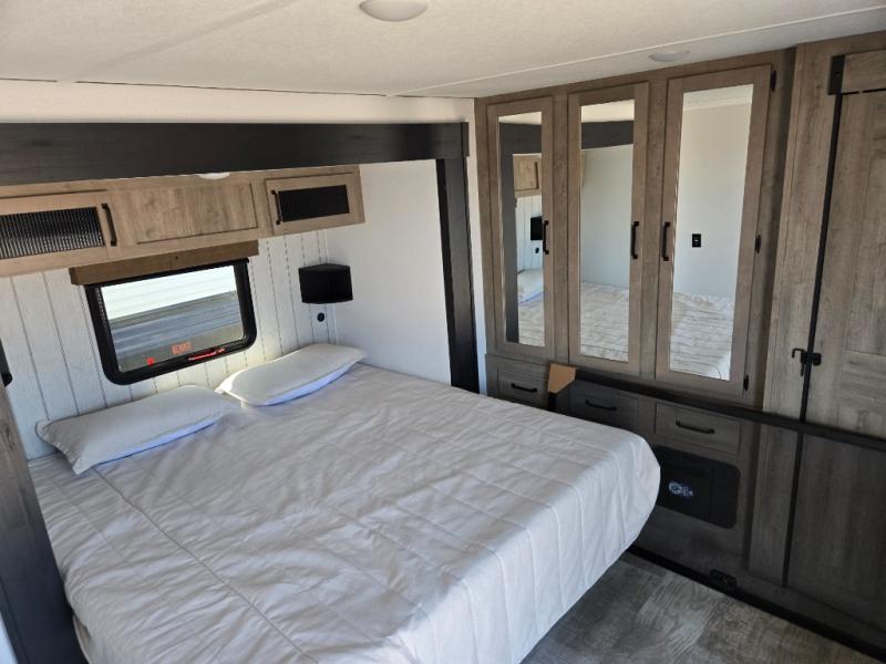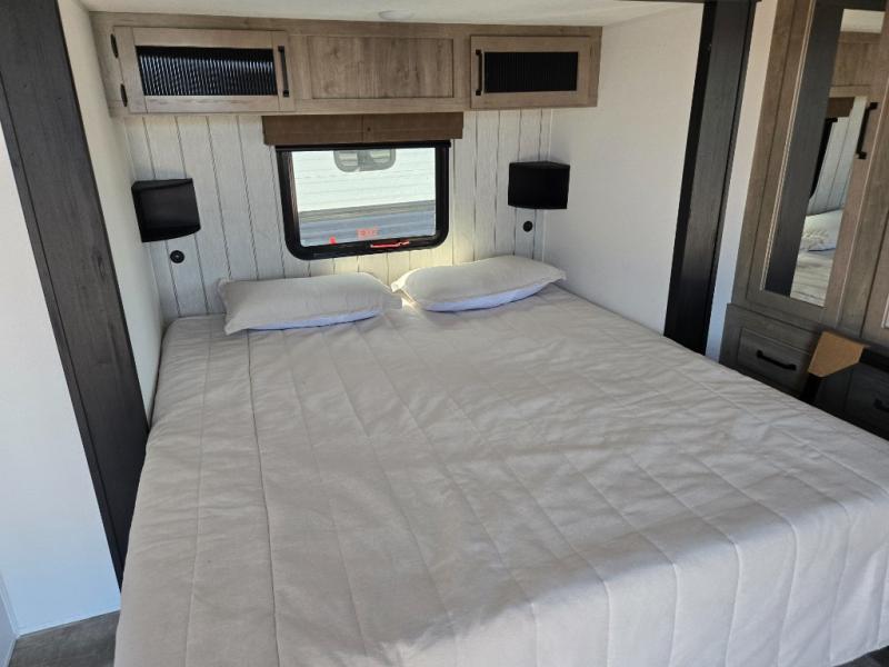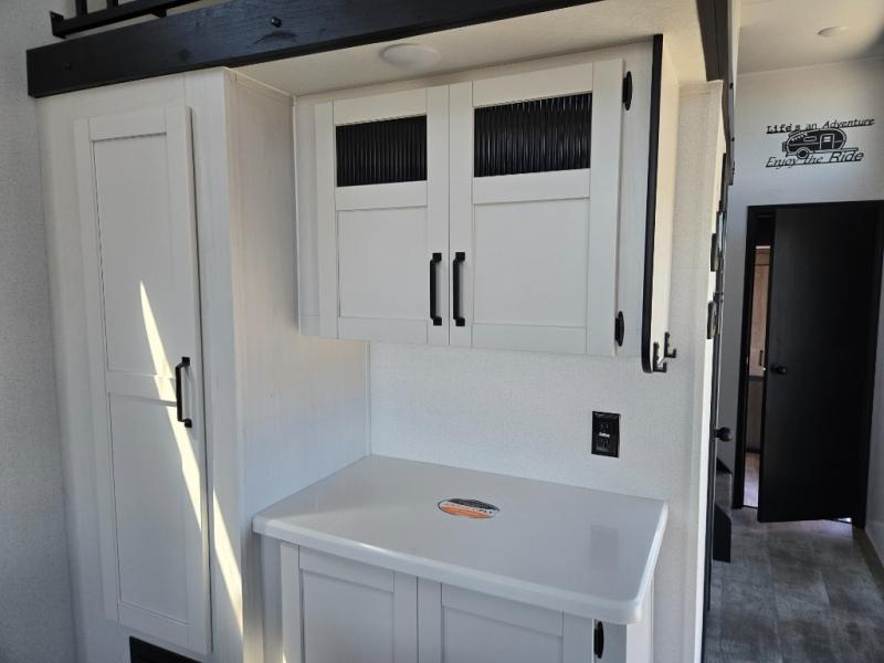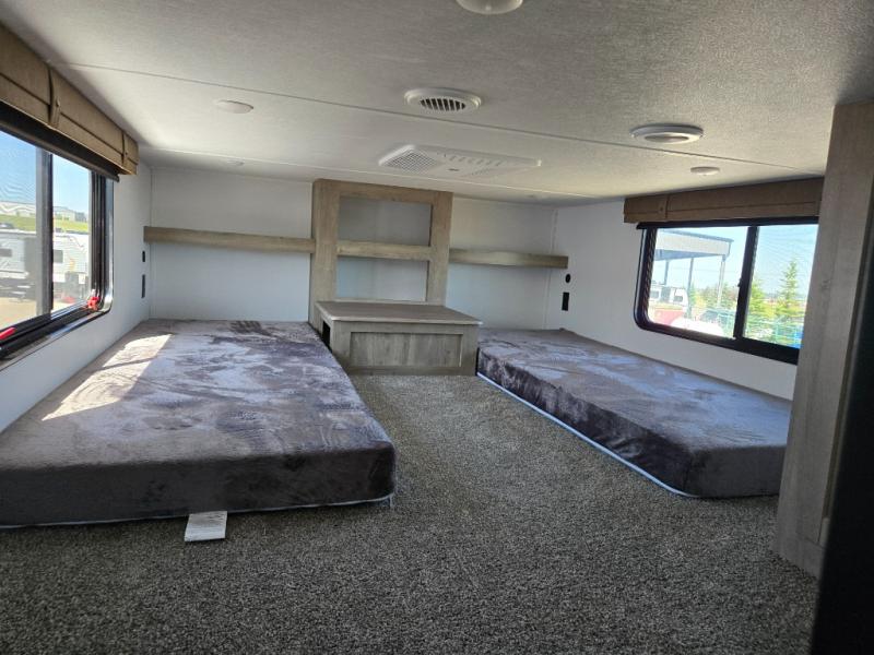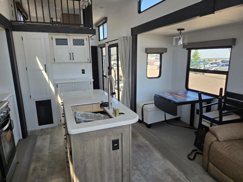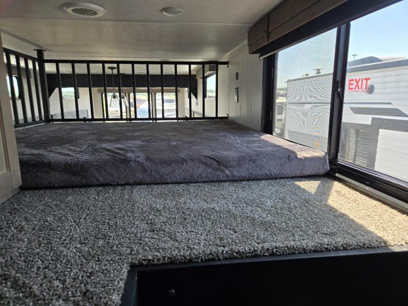 Wherever your destination may be, you can be sure to enjoy it to the fullest with this trailer in tow! With two entry doors, you can enter in through the front private bedroom or the main living area. The bedroom includes a king bed slide out, a desktop if you need to work from home, and a wardrobe/closet to keep your clothes organized. There is also a closet with the option to add washer and dryer prep. Just outside this room are steps that lead to the large loft area with a 58" x 58" bunk mat and a cabinet on one side, plus two 32" x 80" bunk mats on the other. There is also a front cabinet and a wardrobe/closet for plenty of storage space. Once you've headed back downstairs, you can relax on the dual recliners, rear sofa, or free-standing table with a bench and two seats. And the chef of your group will love the kitchen with its residential style refrigerator and pantry, kitchen island, and four burner cooktop!