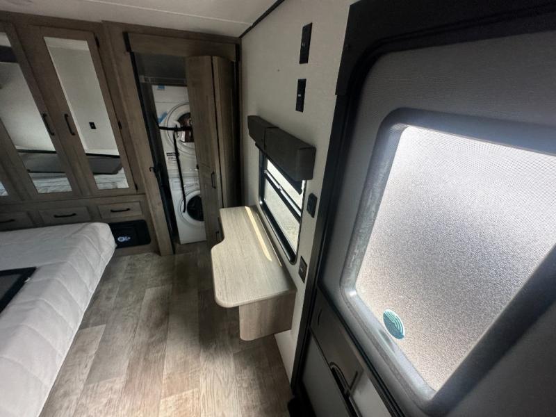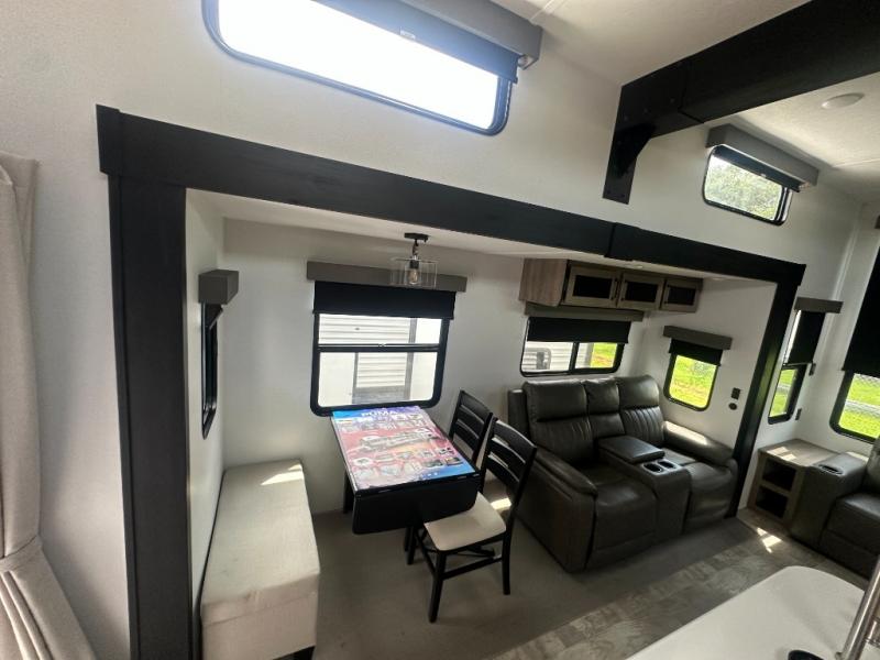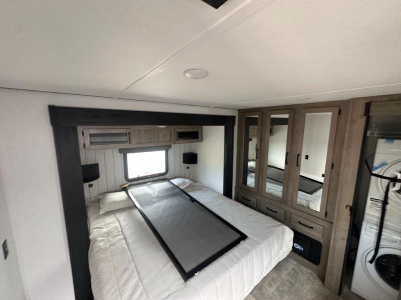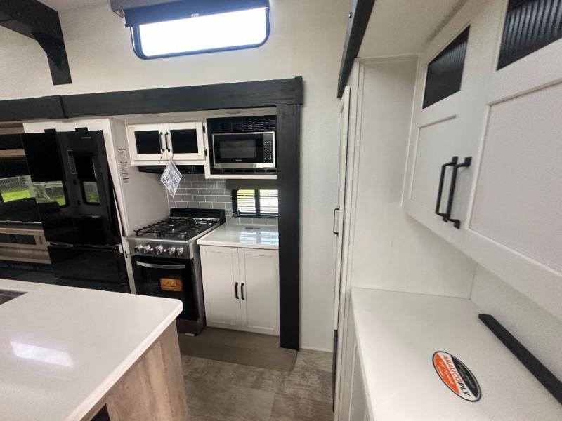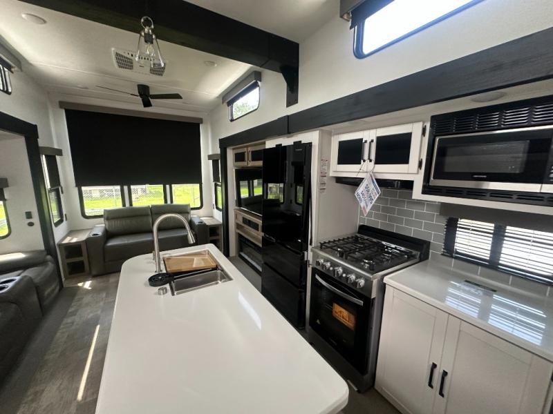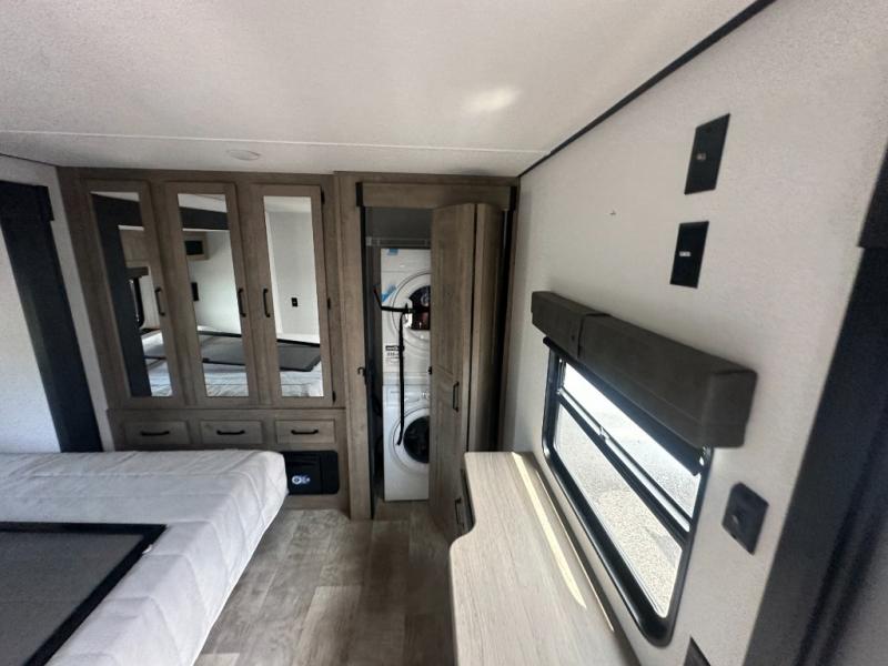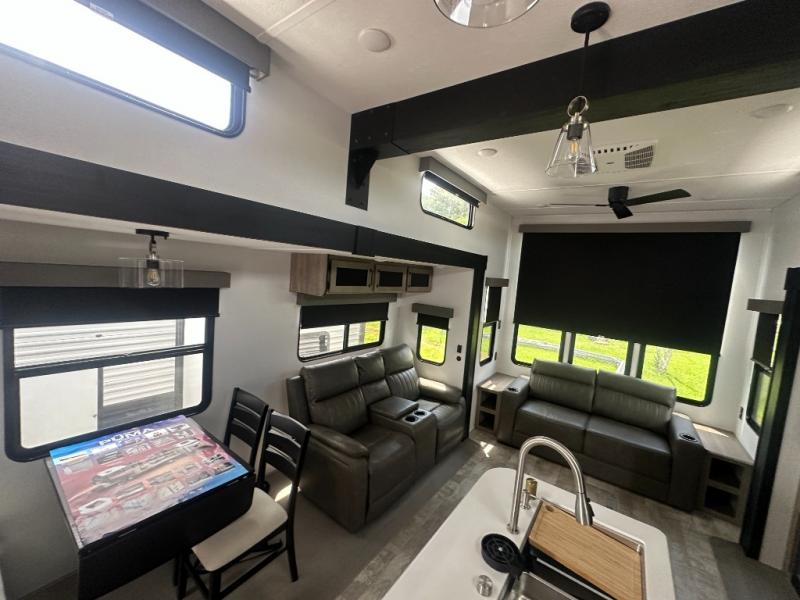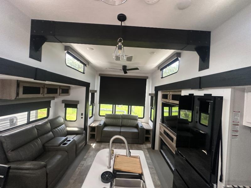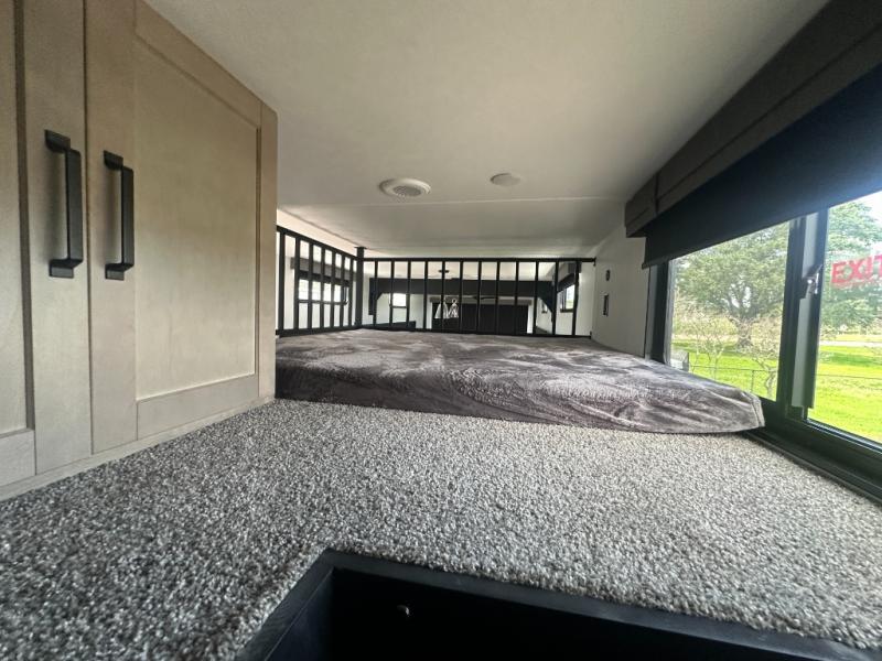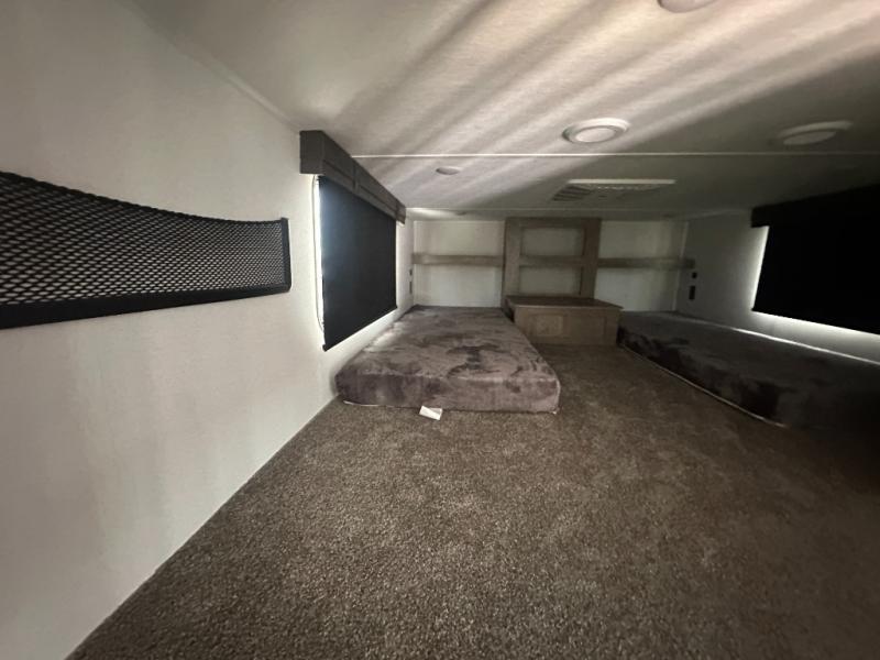 Wherever your destination may be, you can be sure to enjoy it to the fullest with this trailer in tow! With two entry doors, you can enter in through the front private bedroom or the main living area. The bedroom includes a king bed slide out, a desktop if you need to work from home, and a wardrobe/closet to keep your clothes organized. There is also a closet with the option to add washer and dryer prep. Just outside this room are steps that lead to the large loft area with a 58" x 58" bunk mat and a cabinet on one side, plus two 32" x 80" bunk mats on the other. There is also a front cabinet and a wardrobe/closet for plenty of storage space. Once you've headed back downstairs, you can relax on the dual recliners, rear sofa, or free-standing table with a bench and two seats. And the chef of your group will love the kitchen with its residential style refrigerator and pantry, kitchen island, and four burner cooktop!
