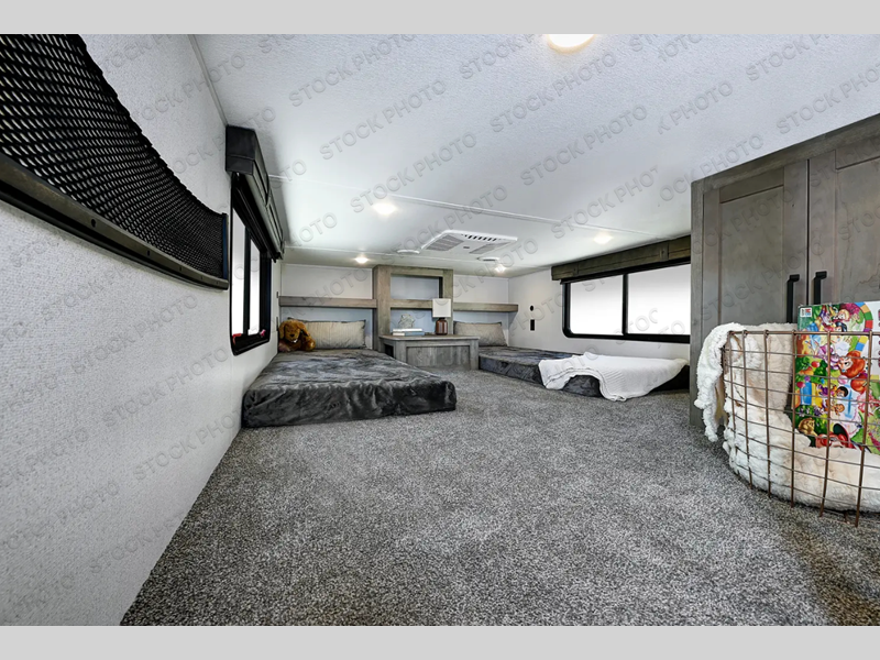 Wherever your destination may be, you can be sure to enjoy it to the fullest with this trailer in tow! With two entry doors, you can enter in through the front private bedroom or the main living area. The bedroom includes a king bed slide out, a desktop if you need to work from home, and a wardrobe/closet to keep your clothes organized. There is also a closet with the option to add washer and dryer prep. Just outside this room are steps that lead to the large loft area with a 58" x 58" bunk mat and a cabinet on one side, plus two 32" x 80" bunk mats on the other. There is also a front cabinet and a wardrobe/closet for plenty of storage space. Once you've headed back downstairs, you can relax on the dual recliners, rear sofa, or free-standing table with a bench and two seats. And the chef of your group will love the kitchen with its residential style refrigerator and pantry, kitchen island, and four burner cooktop!