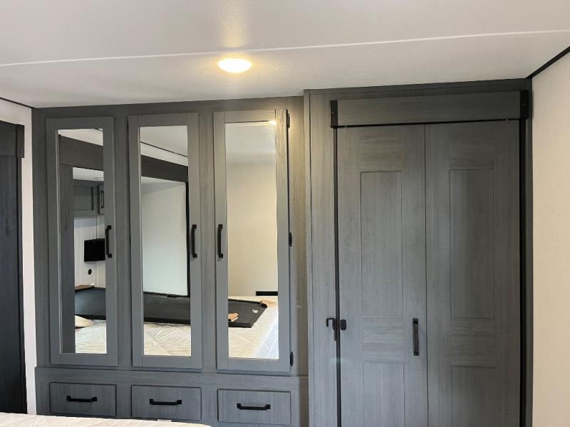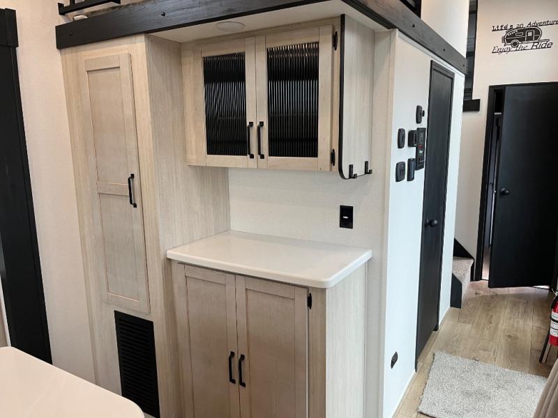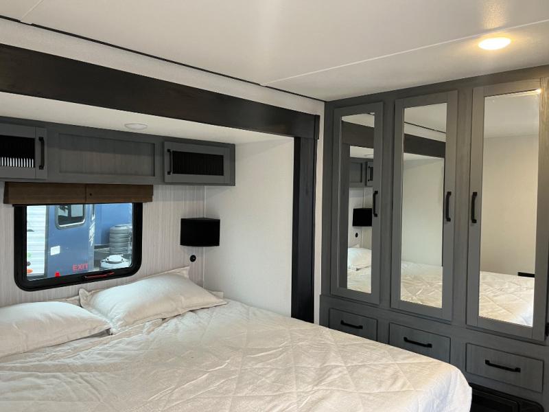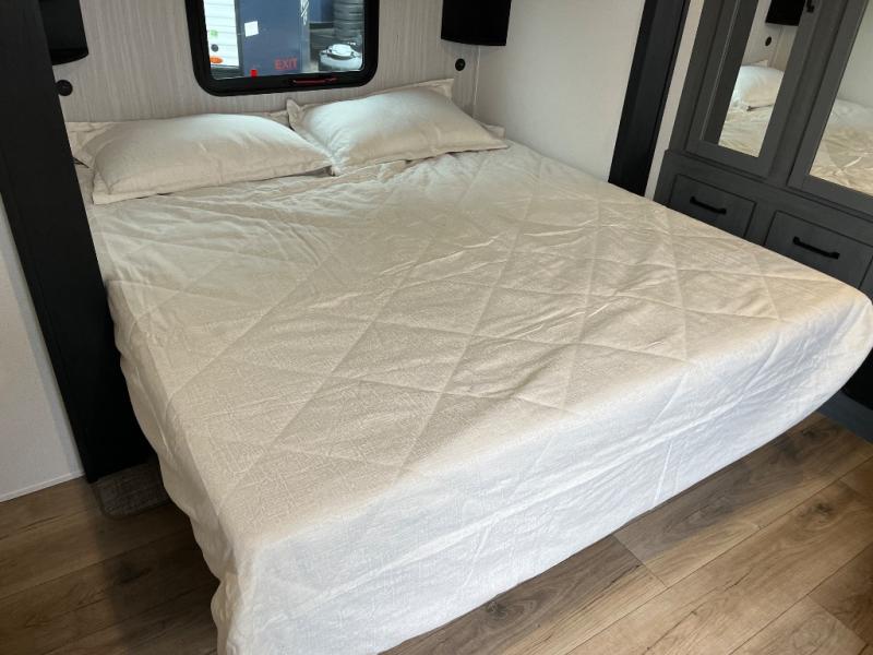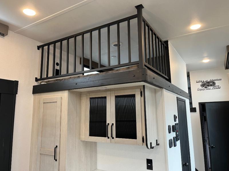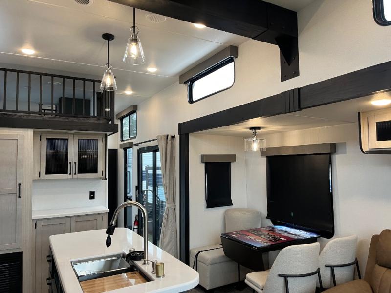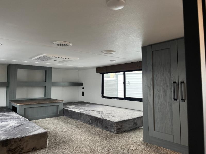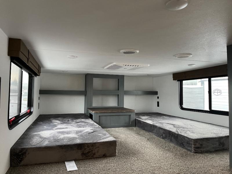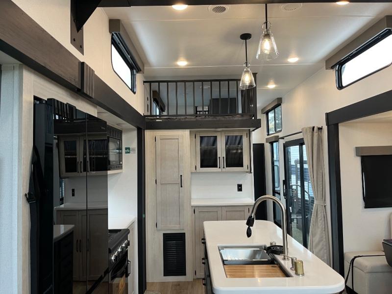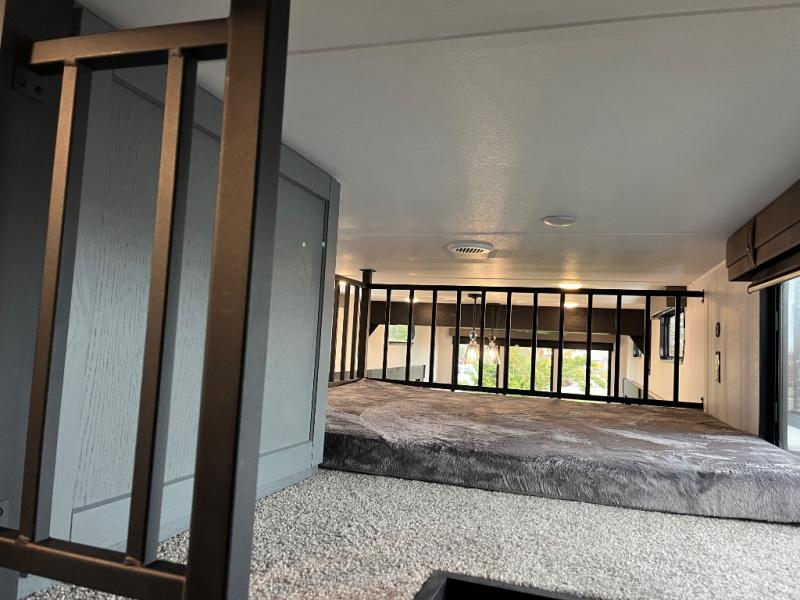 Wherever your destination may be, you can be sure to enjoy it to the fullest with this trailer in tow! With two entry doors, you can enter in through the front private bedroom or the main living area. The bedroom includes a king bed slide out, a desktop if you need to work from home, and a wardrobe/closet to keep your clothes organized. There is also a closet with the option to add washer and dryer prep. Just outside this room are steps that lead to the large loft area with a 58" x 58" bunk mat and a cabinet on one side, plus two 32" x 80" bunk mats on the other. There is also a front cabinet and a wardrobe/closet for plenty of storage space. Once you've headed back downstairs, you can relax on the dual recliners, rear sofa, or free-standing table with a bench and two seats. And the chef of your group will love the kitchen with its residential style refrigerator and pantry, kitchen island, and four burner cooktop!