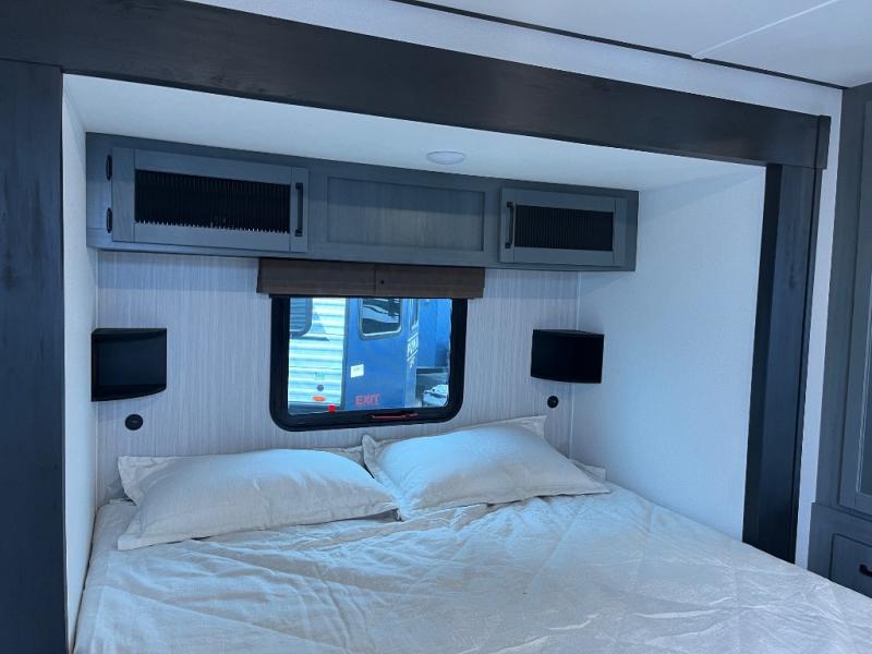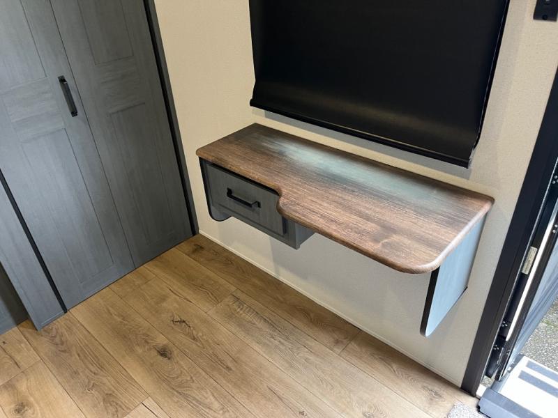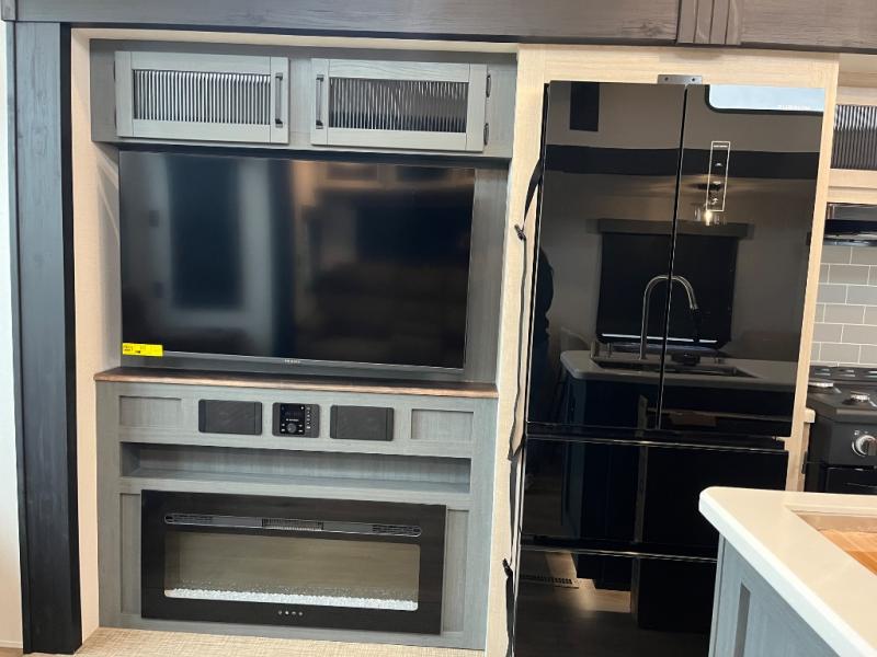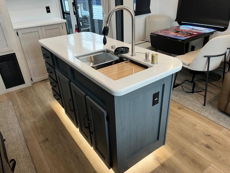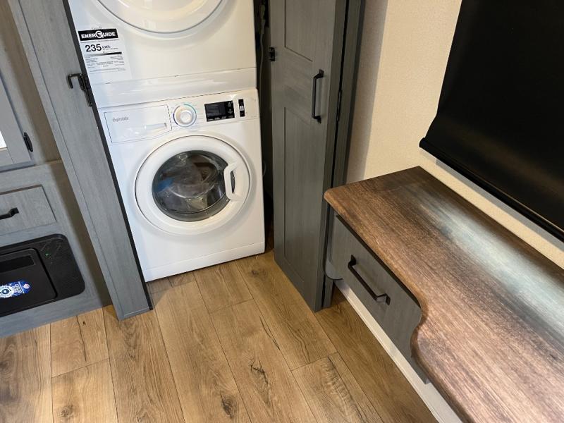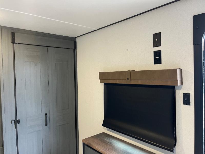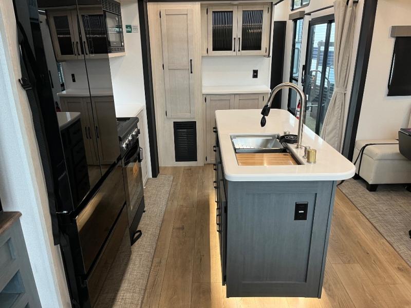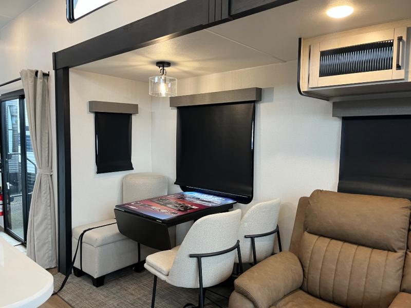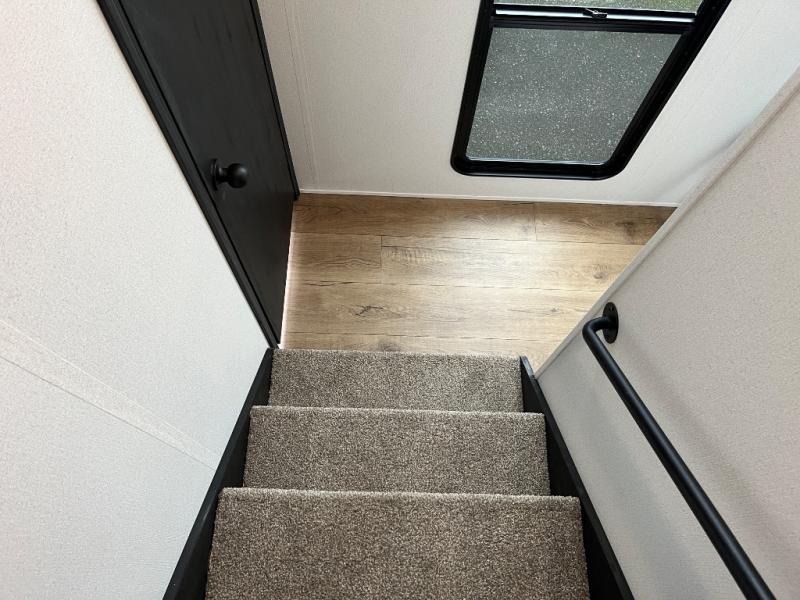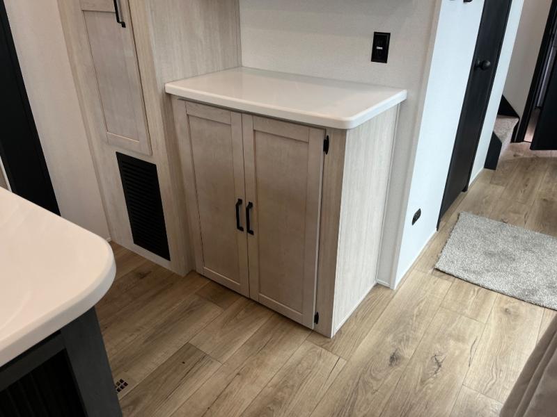 Wherever your destination may be, you can be sure to enjoy it to the fullest with this trailer in tow! With two entry doors, you can enter in through the front private bedroom or the main living area. The bedroom includes a king bed slide out, a desktop if you need to work from home, and a wardrobe/closet to keep your clothes organized. There is also a closet with the option to add washer and dryer prep. Just outside this room are steps that lead to the large loft area with a 58" x 58" bunk mat and a cabinet on one side, plus two 32" x 80" bunk mats on the other. There is also a front cabinet and a wardrobe/closet for plenty of storage space. Once you've headed back downstairs, you can relax on the dual recliners, rear sofa, or free-standing table with a bench and two seats. And the chef of your group will love the kitchen with its residential style refrigerator and pantry, kitchen island, and four burner cooktop!