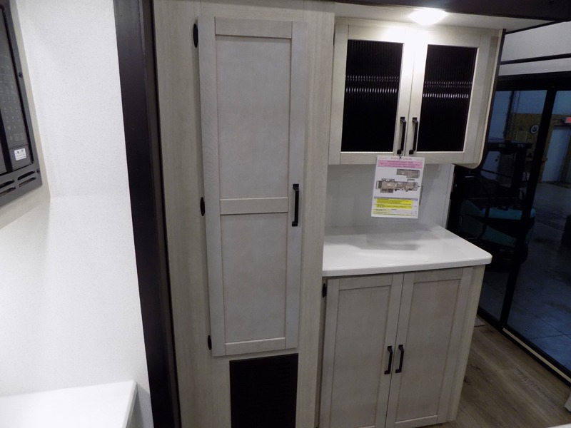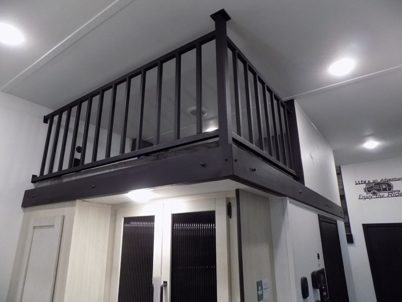 Wherever your destination may be, you can be sure to enjoy it to the fullest with this trailer in tow! With two entry doors, you can enter in through the front private bedroom or the main living area. The bedroom includes a king bed slide out, a desktop if you need to work from home, and a wardrobe/closet to keep your clothes organized. There is also a closet with the option to add washer and dryer prep. Just outside this room are steps that lead to the large loft area with a 58" x 58" bunk mat and a cabinet on one side, plus two 32" x 80" bunk mats on the other. There is also a front cabinet and a wardrobe/closet for plenty of storage space. Once you've headed back downstairs, you can relax on the dual recliners, rear sofa, or free-standing table with a bench and two seats. And the chef of your group will love the kitchen with its residential style refrigerator and pantry, kitchen island, and four burner cooktop!