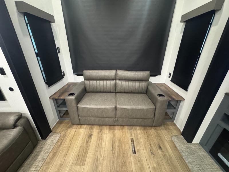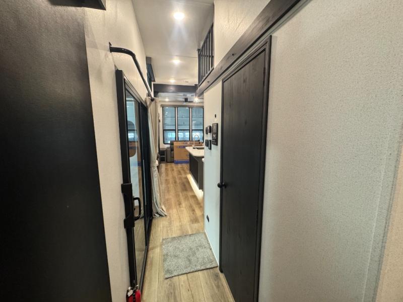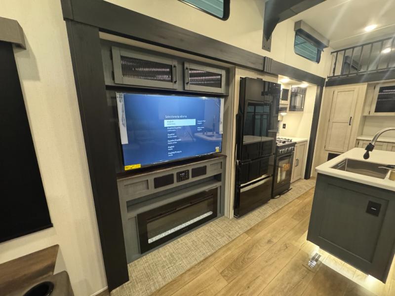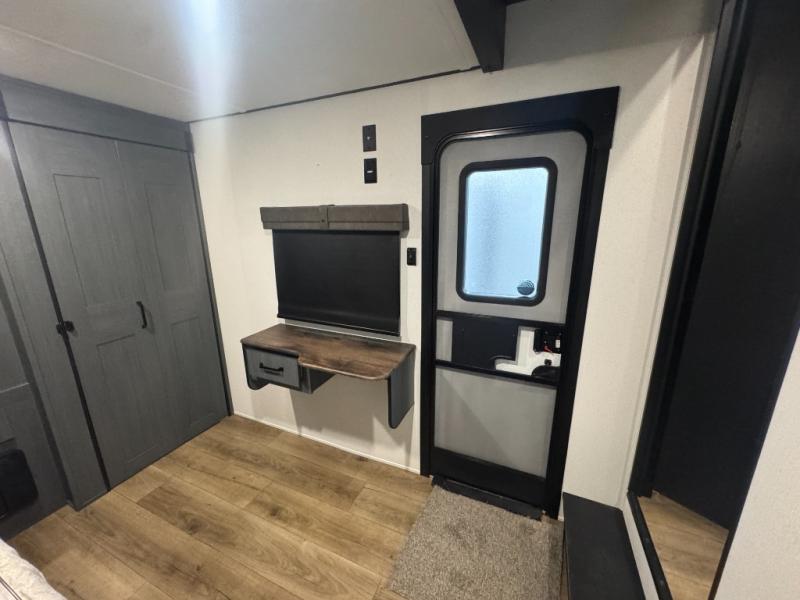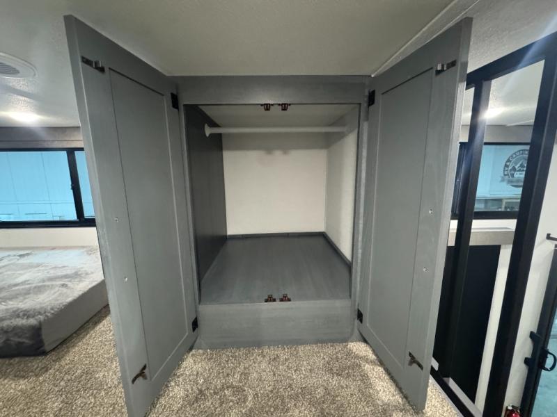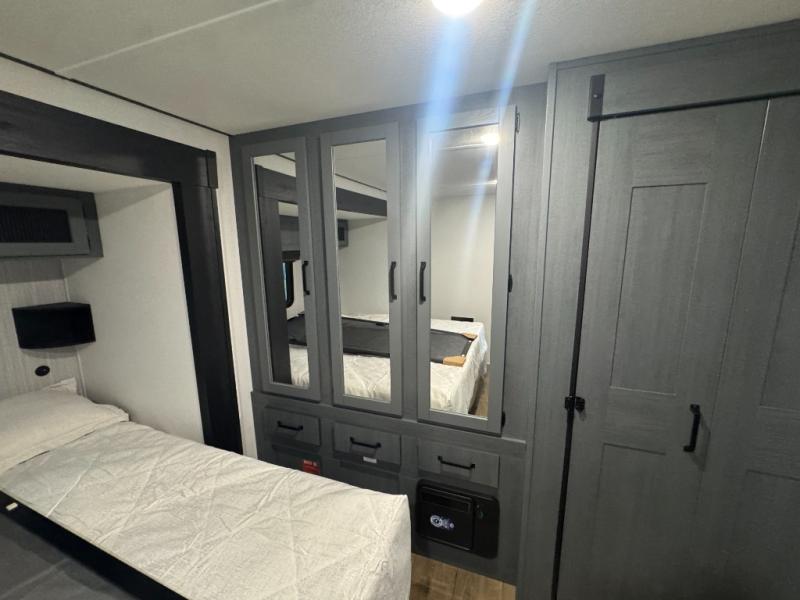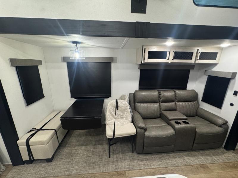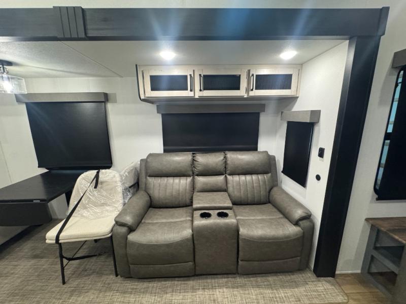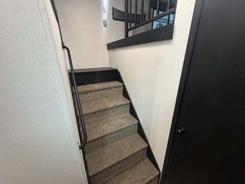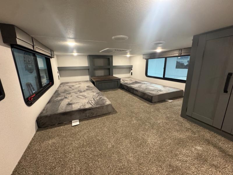 Wherever your destination may be, you can be sure to enjoy it to the fullest with this trailer in tow! With two entry doors, you can enter in through the front private bedroom or the main living area. The bedroom includes a king bed slide out, a desktop if you need to work from home, and a wardrobe/closet to keep your clothes organized. There is also a closet with the washer and dryer prep if you plan to add these appliances. Just outside this room are steps that lead to the large loft area with a 58" x 58" bunk mat and a cabinet on one side, plus two 32" x 80" bunk mats on the other. There is also a front cabinet and a wardrobe/closet for plenty of storage space. Once you've headed back downstairs, you can relax on the theater seating, rear sofa, or table and chairs with bench seating. And the chef of your group will love the kitchen with its residential style refrigerator and pantry, kitchen island, and four burner cooktop!