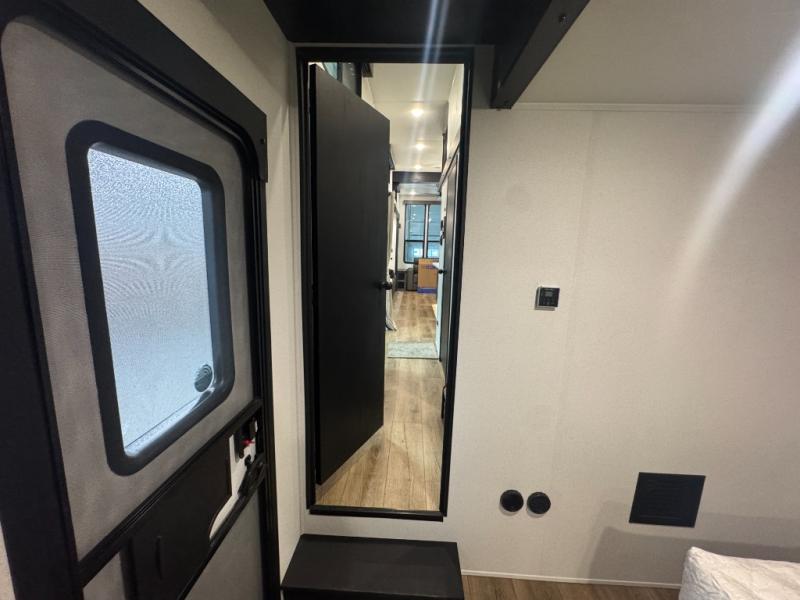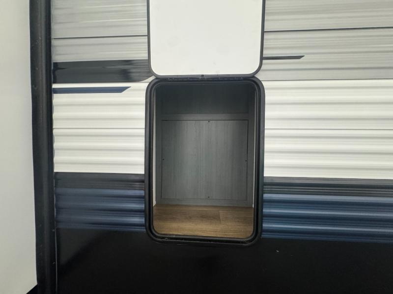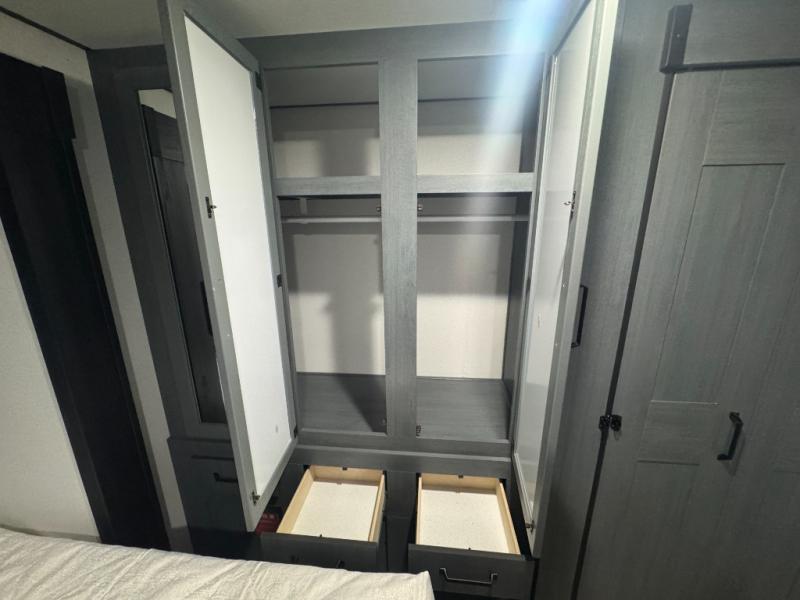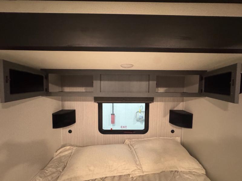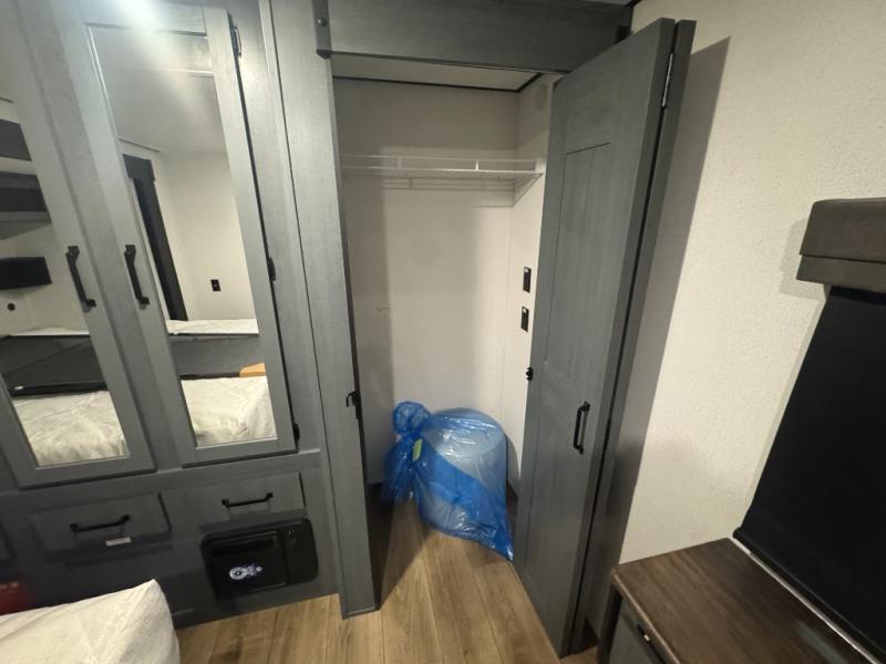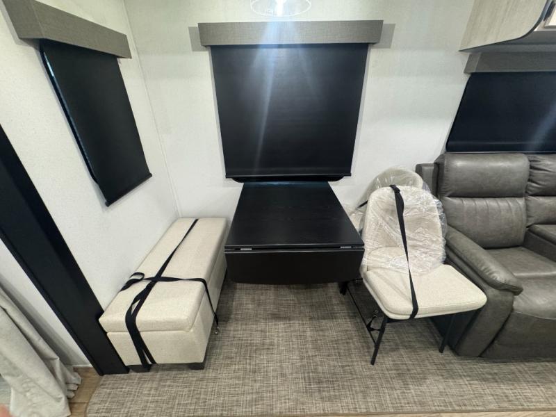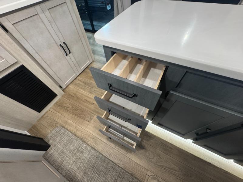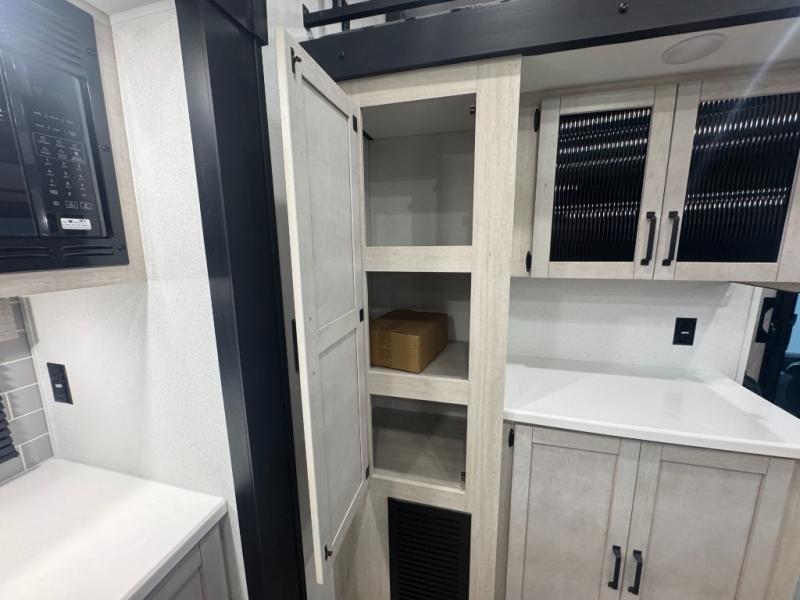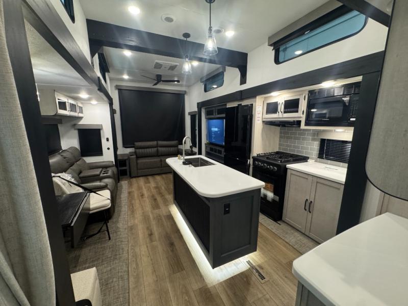 Wherever your destination may be, you can be sure to enjoy it to the fullest with this trailer in tow! With two entry doors, you can enter in through the front private bedroom or the main living area. The bedroom includes a king bed slide out, a desktop if you need to work from home, and a wardrobe/closet to keep your clothes organized. There is also a closet with the washer and dryer prep if you plan to add these appliances. Just outside this room are steps that lead to the large loft area with a 58" x 58" bunk mat and a cabinet on one side, plus two 32" x 80" bunk mats on the other. There is also a front cabinet and a wardrobe/closet for plenty of storage space. Once you've headed back downstairs, you can relax on the theater seating, rear sofa, or table and chairs with bench seating. And the chef of your group will love the kitchen with its residential style refrigerator and pantry, kitchen island, and four burner cooktop!