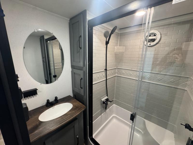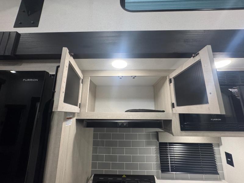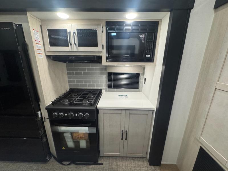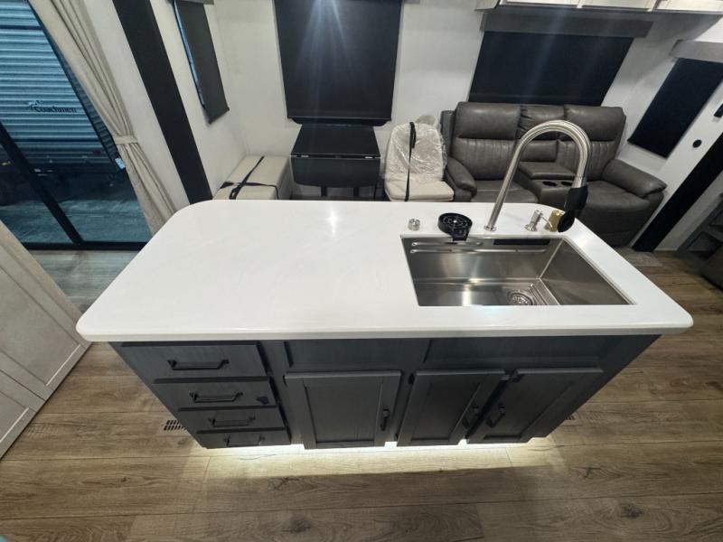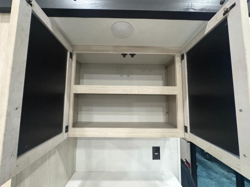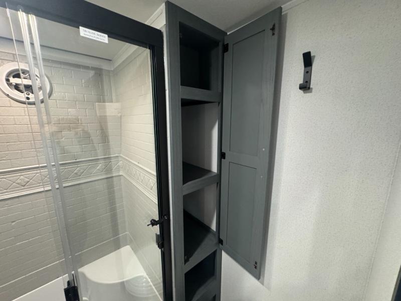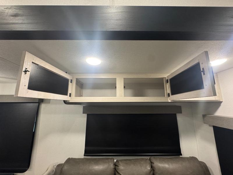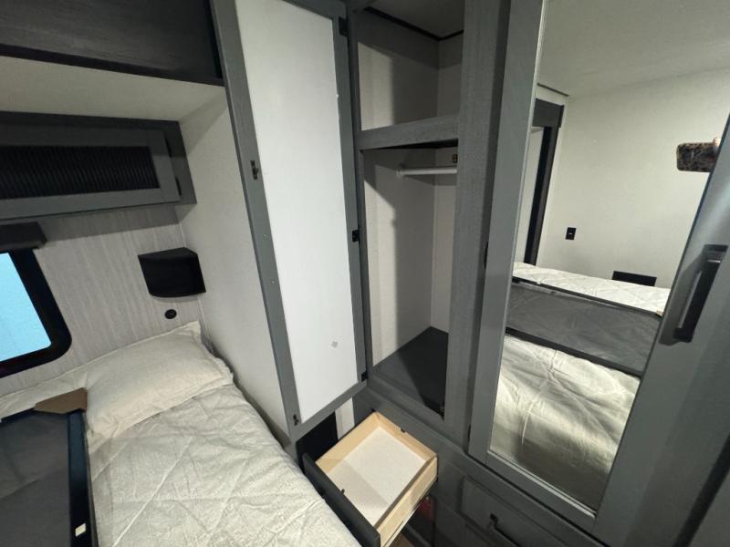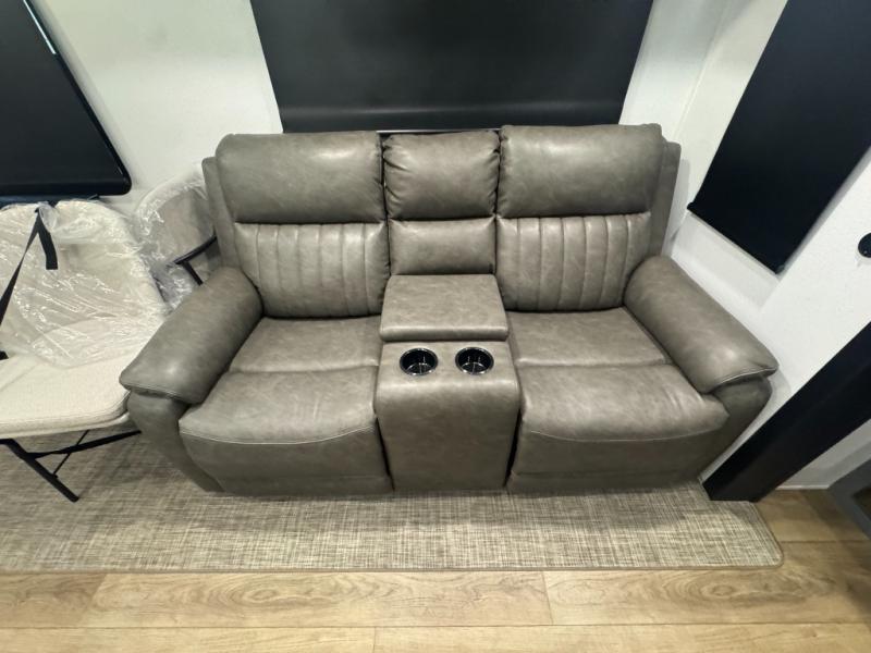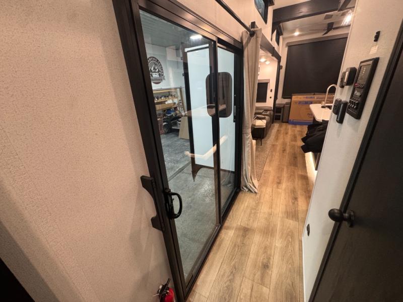 Wherever your destination may be, you can be sure to enjoy it to the fullest with this trailer in tow! With two entry doors, you can enter in through the front private bedroom or the main living area. The bedroom includes a king bed slide out, a desktop if you need to work from home, and a wardrobe/closet to keep your clothes organized. There is also a closet with the washer and dryer prep if you plan to add these appliances. Just outside this room are steps that lead to the large loft area with a 58" x 58" bunk mat and a cabinet on one side, plus two 32" x 80" bunk mats on the other. There is also a front cabinet and a wardrobe/closet for plenty of storage space. Once you've headed back downstairs, you can relax on the theater seating, rear sofa, or table and chairs with bench seating. And the chef of your group will love the kitchen with its residential style refrigerator and pantry, kitchen island, and four burner cooktop!