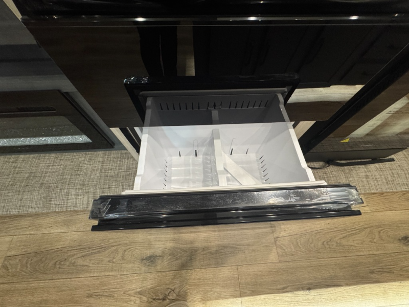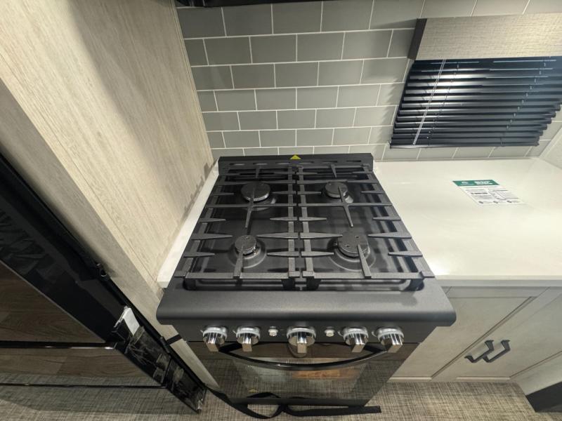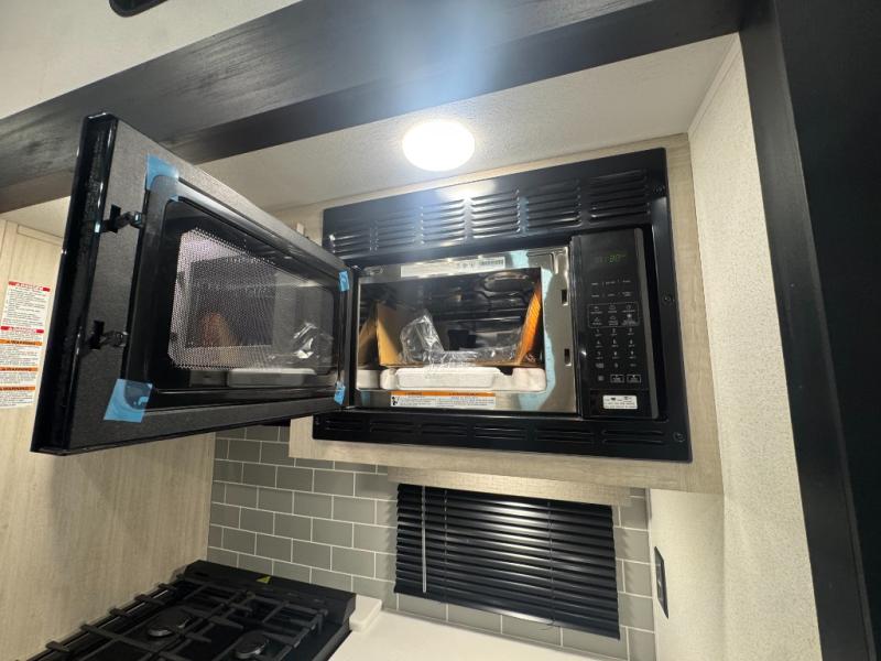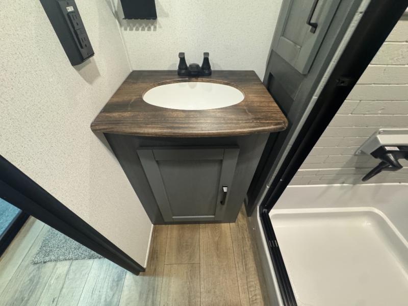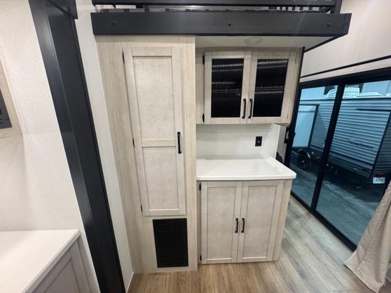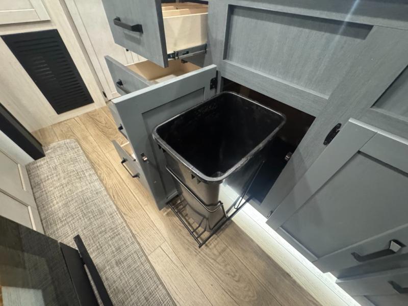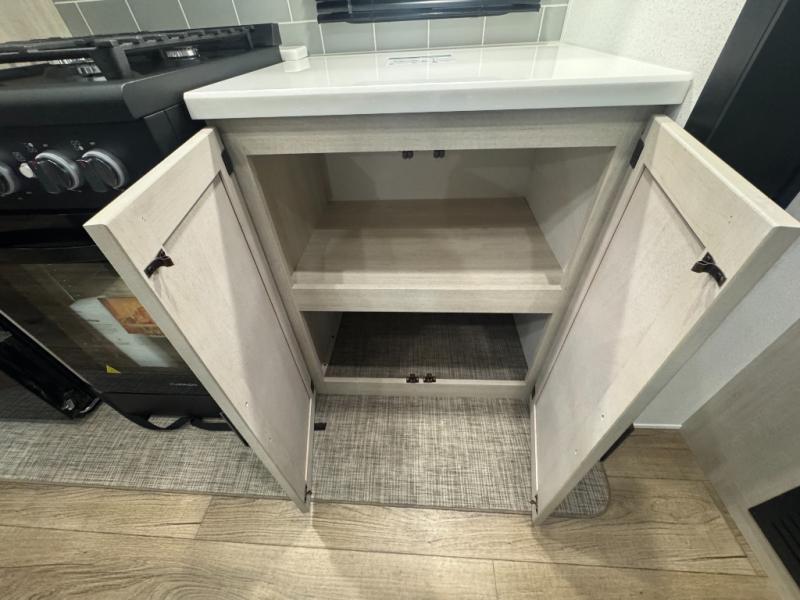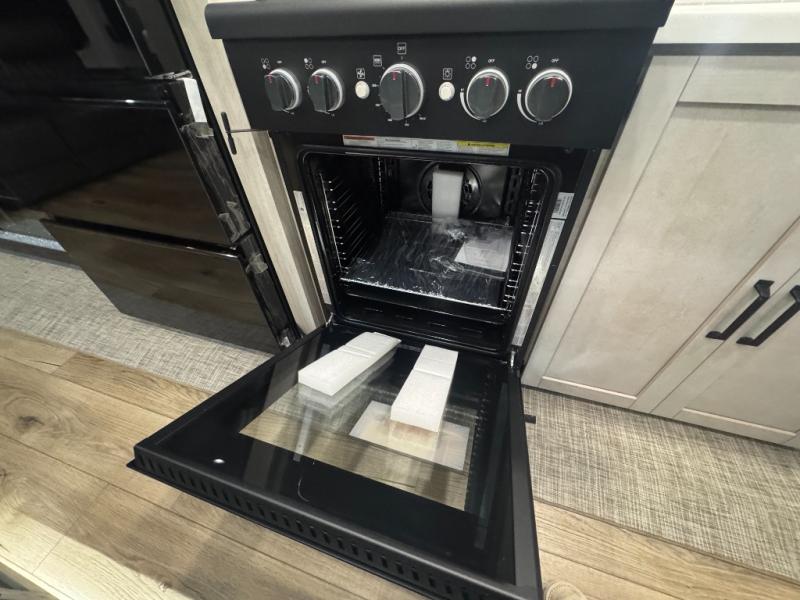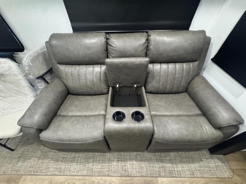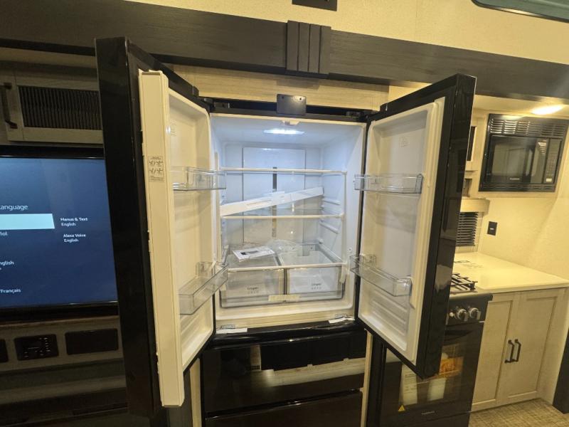 Wherever your destination may be, you can be sure to enjoy it to the fullest with this trailer in tow! With two entry doors, you can enter in through the front private bedroom or the main living area. The bedroom includes a king bed slide out, a desktop if you need to work from home, and a wardrobe/closet to keep your clothes organized. There is also a closet with the washer and dryer prep if you plan to add these appliances. Just outside this room are steps that lead to the large loft area with a 58" x 58" bunk mat and a cabinet on one side, plus two 32" x 80" bunk mats on the other. There is also a front cabinet and a wardrobe/closet for plenty of storage space. Once you've headed back downstairs, you can relax on the theater seating, rear sofa, or table and chairs with bench seating. And the chef of your group will love the kitchen with its residential style refrigerator and pantry, kitchen island, and four burner cooktop!