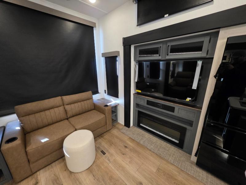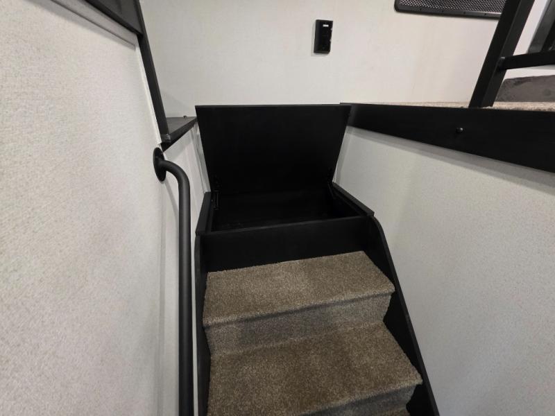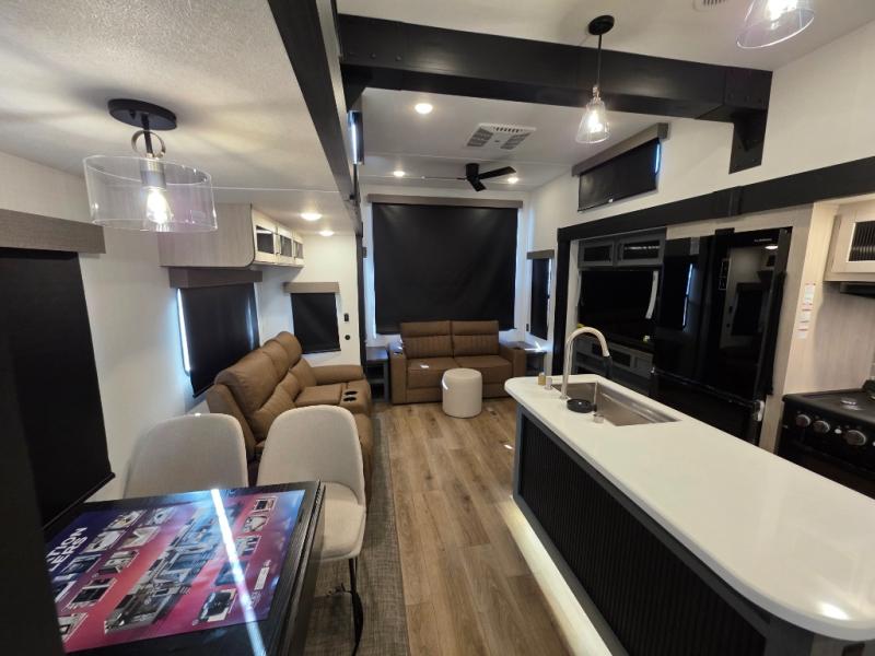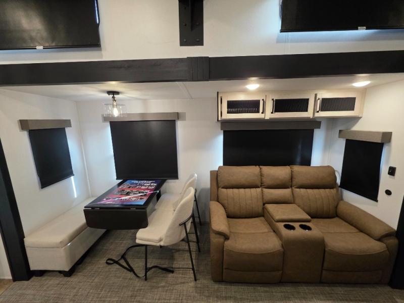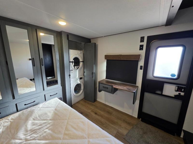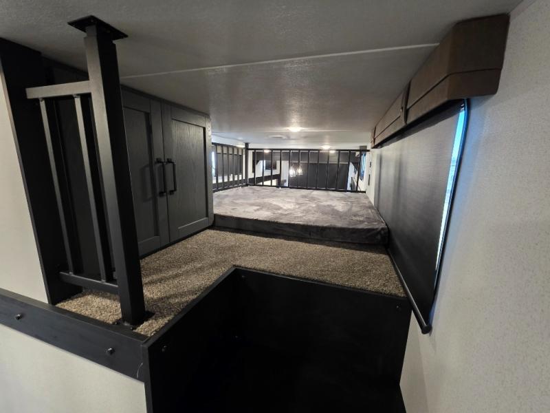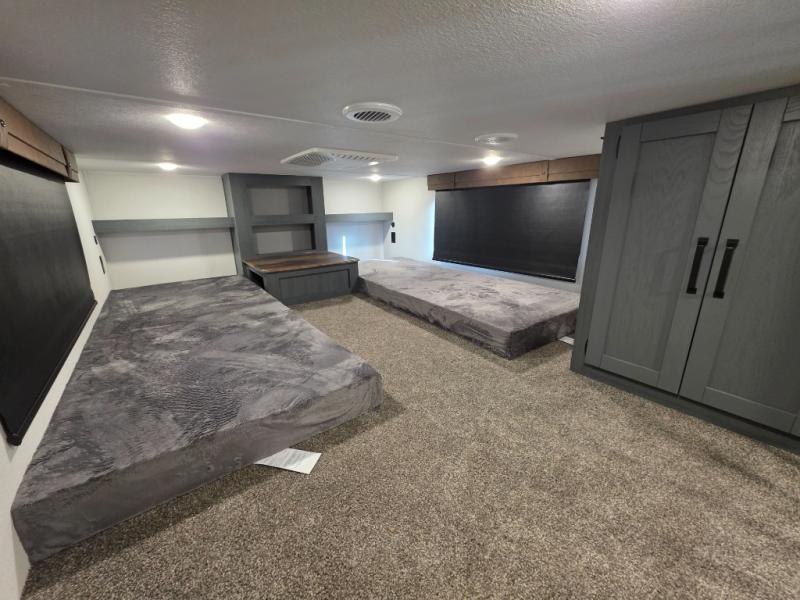 Wherever your destination may be, you can be sure to enjoy it to the fullest with this trailer in tow! With two entry doors, you can enter in through the front private bedroom or the main living area. The bedroom includes a king bed slide out, a desktop if you need to work from home, and a wardrobe/closet to keep your clothes organized. There is also a closet with the washer and dryer prep if you plan to add these appliances. Just outside this room are steps that lead to the large loft area with a 58" x 58" bunk mat and a cabinet on one side, plus two 32" x 80" bunk mats on the other. There is also a front cabinet and a wardrobe/closet for plenty of storage space. Once you've headed back downstairs, you can relax on the theater seating, rear sofa, or table and chairs with bench seating. And the chef of your group will love the kitchen with its residential style refrigerator and pantry, kitchen island, and four burner cooktop!