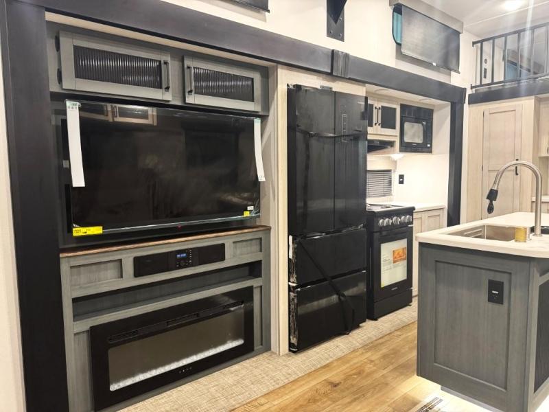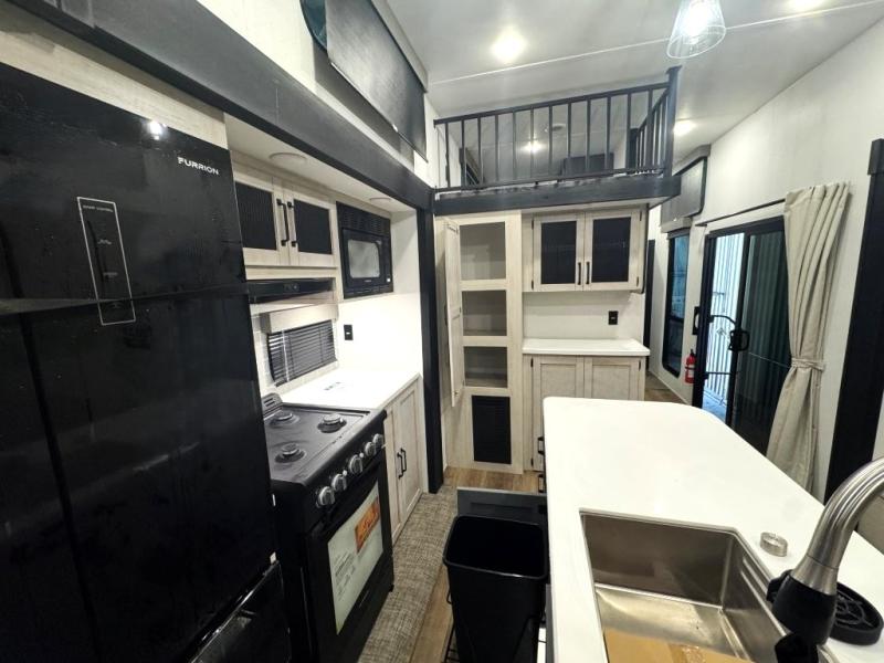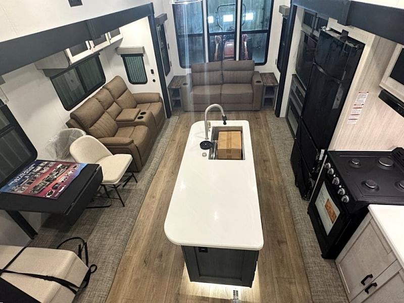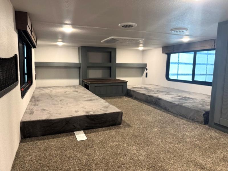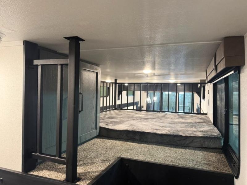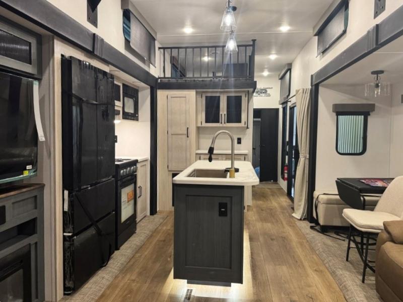 Wherever your destination may be, you can be sure to enjoy it to the fullest with this trailer in tow! With two entry doors, you can enter in through the front private bedroom or the main living area. The bedroom includes a king bed slide out, a desktop if you need to work from home, and a wardrobe/closet to keep your clothes organized. There is also a closet with the washer and dryer prep if you plan to add these appliances. Just outside this room are steps that lead to the large loft area with a 58" x 58" bunk mat and a cabinet on one side, plus two 32" x 80" bunk mats on the other. There is also a front cabinet and a wardrobe/closet for plenty of storage space. Once you've headed back downstairs, you can relax on the theater seating, rear sofa, or table and chairs with bench seating. And the chef of your group will love the kitchen with its residential style refrigerator and pantry, kitchen island, and four burner cooktop!