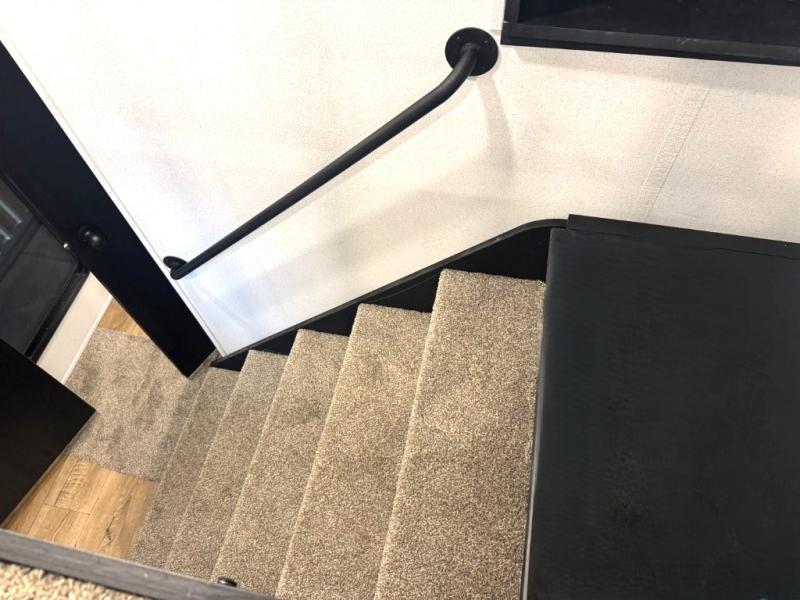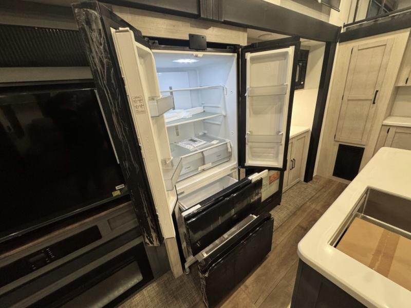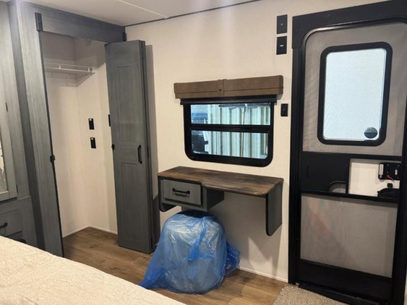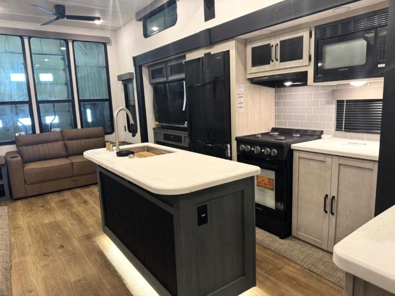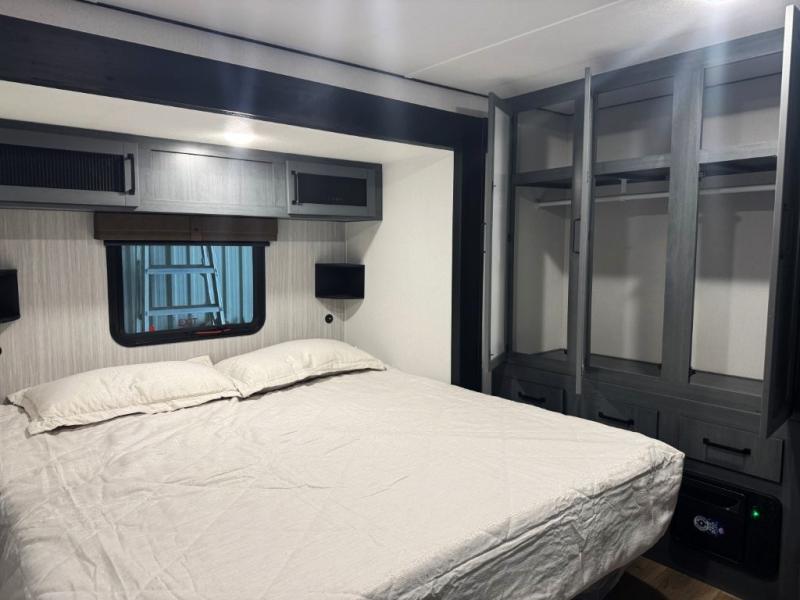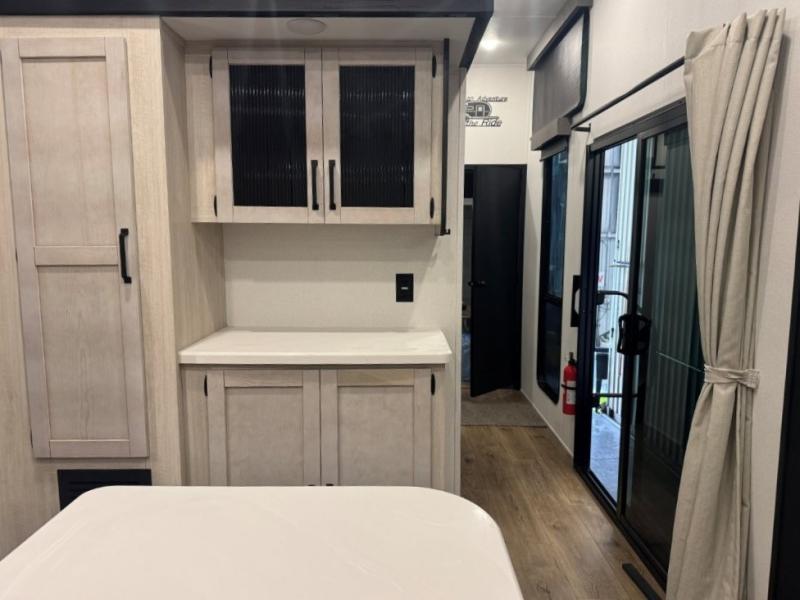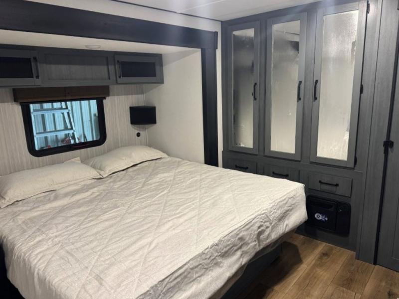 Wherever your destination may be, you can be sure to enjoy it to the fullest with this trailer in tow! With two entry doors, you can enter in through the front private bedroom or the main living area. The bedroom includes a king bed slide out, a desktop if you need to work from home, and a wardrobe/closet to keep your clothes organized. There is also a closet with the washer and dryer prep if you plan to add these appliances. Just outside this room are steps that lead to the large loft area with a 58" x 58" bunk mat and a cabinet on one side, plus two 32" x 80" bunk mats on the other. There is also a front cabinet and a wardrobe/closet for plenty of storage space. Once you've headed back downstairs, you can relax on the theater seating, rear sofa, or table and chairs with bench seating. And the chef of your group will love the kitchen with its residential style refrigerator and pantry, kitchen island, and four burner cooktop!