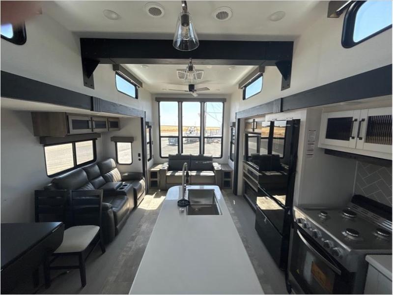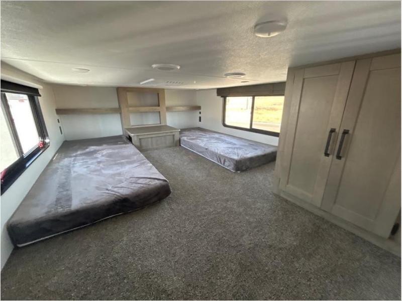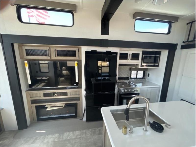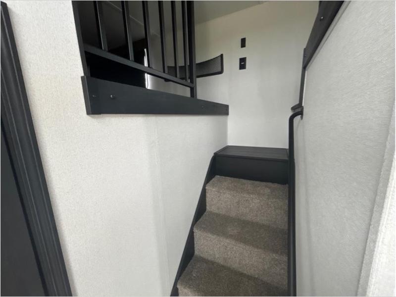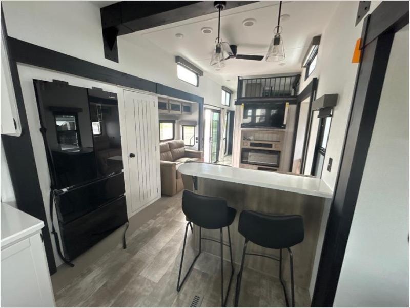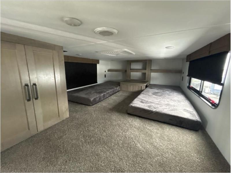 Wherever your destination may be, you can be sure to enjoy it to the fullest with this trailer in tow! With two entry doors, you can enter in through the front private bedroom or the main living area. The bedroom includes a king bed slide out, a desktop if you need to work from home, and a wardrobe/closet to keep your clothes organized. There is also a closet with the washer and dryer prep if you plan to add these appliances. Just outside this room are steps that lead to the large loft area with a 58" x 58" bunk mat and a cabinet on one side, plus two 32" x 80" bunk mats on the other. There is also a front cabinet and a wardrobe/closet for plenty of storage space. Once you've headed back downstairs, you can relax on the theater seating, rear sofa, or table and chairs with bench seating. And the chef of your group will love the kitchen with its residential style refrigerator and pantry, kitchen island, and four burner cooktop!