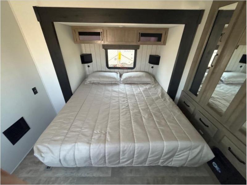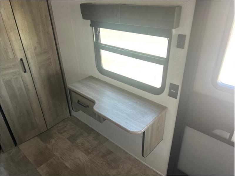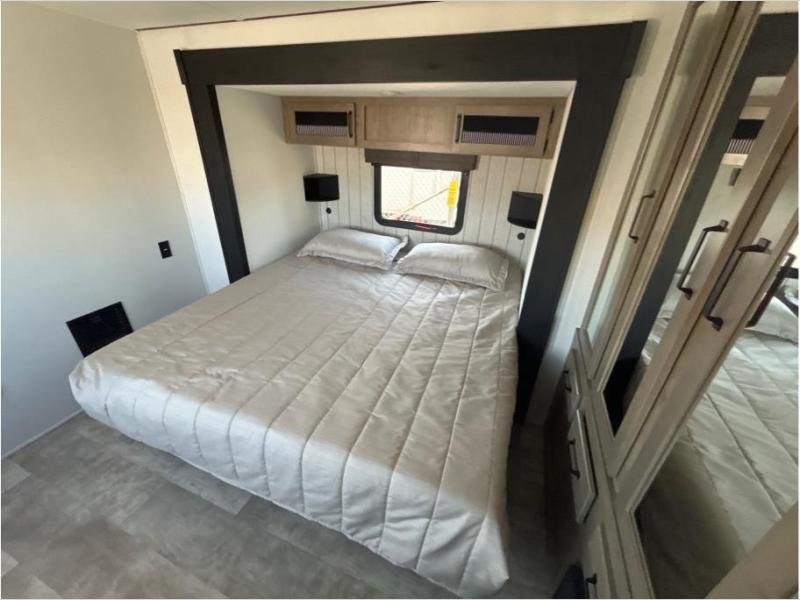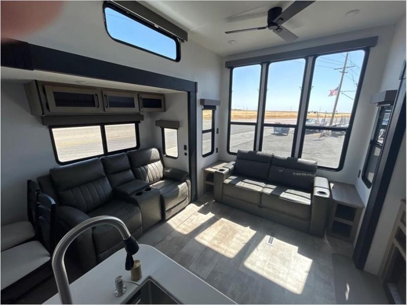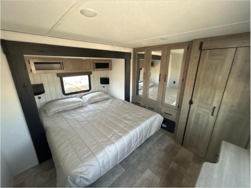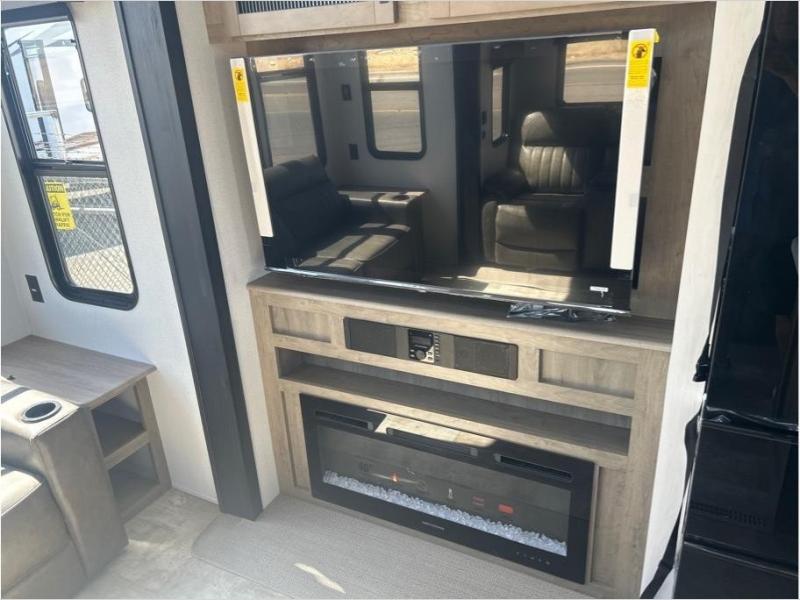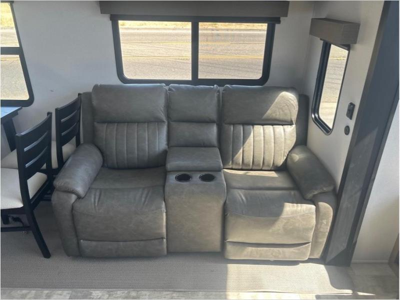 Wherever your destination may be, you can be sure to enjoy it to the fullest with this trailer in tow! With two entry doors, you can enter in through the front private bedroom or the main living area. The bedroom includes a king bed slide out, a desktop if you need to work from home, and a wardrobe/closet to keep your clothes organized. There is also a closet with the washer and dryer prep if you plan to add these appliances. Just outside this room are steps that lead to the large loft area with a 58" x 58" bunk mat and a cabinet on one side, plus two 32" x 80" bunk mats on the other. There is also a front cabinet and a wardrobe/closet for plenty of storage space. Once you've headed back downstairs, you can relax on the theater seating, rear sofa, or table and chairs with bench seating. And the chef of your group will love the kitchen with its residential style refrigerator and pantry, kitchen island, and four burner cooktop!