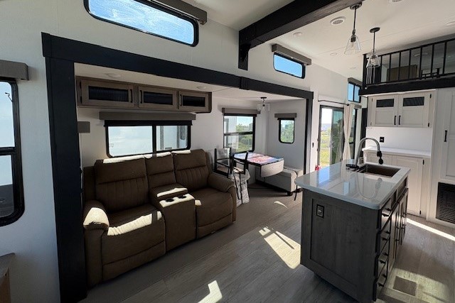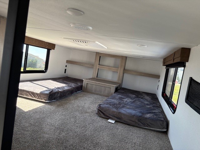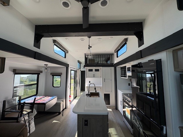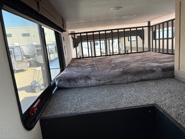 Wherever your destination may be, you can be sure to enjoy it to the fullest with this trailer in tow! With two entry doors, you can enter in through the rear private bedroom or the main living area. The bedroom includes a king bed slide out, a wardrobe/closet to keep your clothes organized, plus a closet with the option to add washer and dryer prep. Just outside this room are steps that lead to the large loft area with a 58" x 58" bunk mat and a cabinet on one side, plus two 32" x 69" bunk mats on the other. There is also a cabinet and a wardrobe/closet for plenty of storage space. Once you've headed back downstairs, you can relax on the dual recliners, front sofa, or free-standing table with a bench and two seats. And the chef of your group will love the kitchen with its residential style refrigerator and pantry, kitchen island, and four burner cooktop!