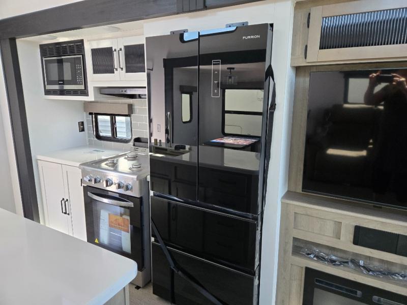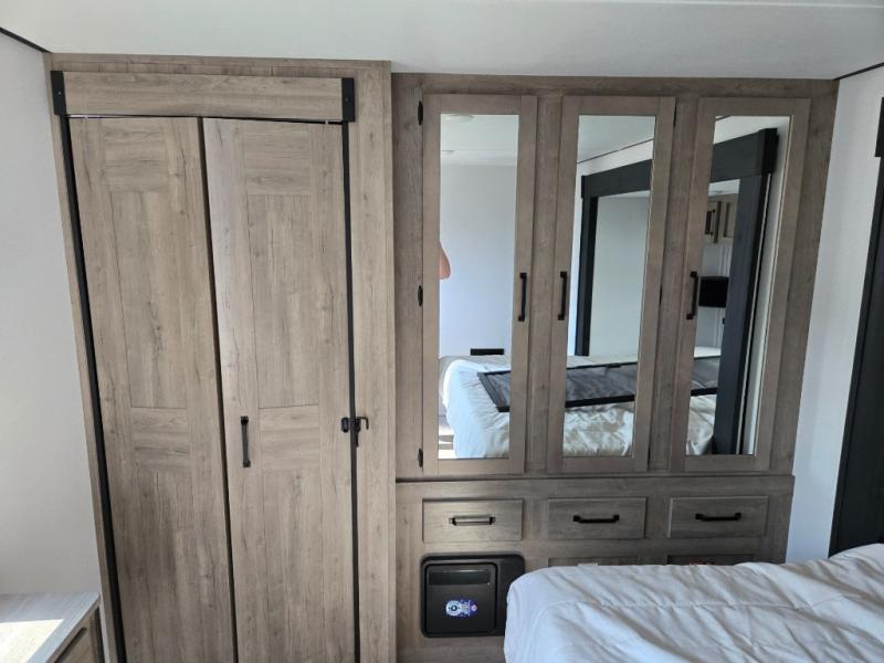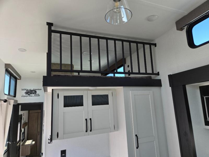 Wherever your destination may be, you can be sure to enjoy it to the fullest with this trailer in tow! With two entry doors, you can enter in through the rear private bedroom or the main living area. The bedroom includes a king bed slide out, a wardrobe/closet to keep your clothes organized, plus a closet with the option to add washer and dryer prep. Just outside this room are steps that lead to the large loft area with a 58" x 58" bunk mat and a cabinet on one side, plus two 32" x 69" bunk mats on the other. There is also a cabinet and a wardrobe/closet for plenty of storage space. Once you've headed back downstairs, you can relax on the dual recliners, front sofa, or free-standing table with a bench and two seats. And the chef of your group will love the kitchen with its residential style refrigerator and pantry, kitchen island, and four burner cooktop!