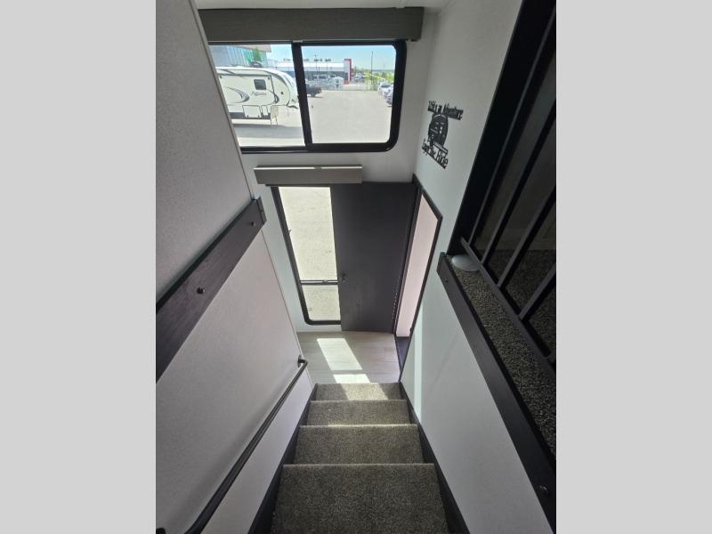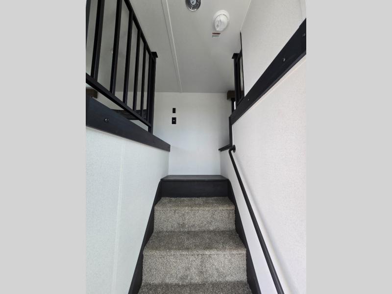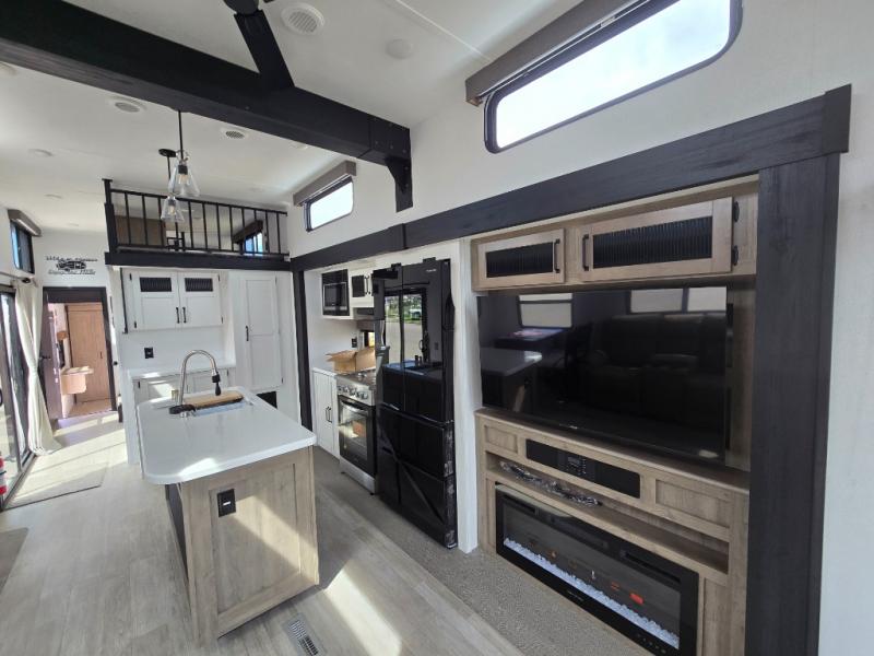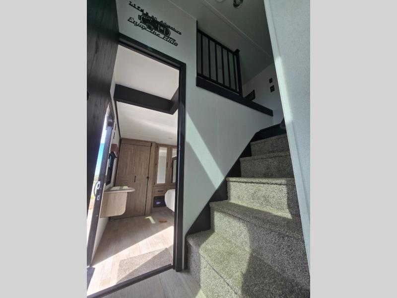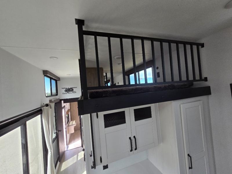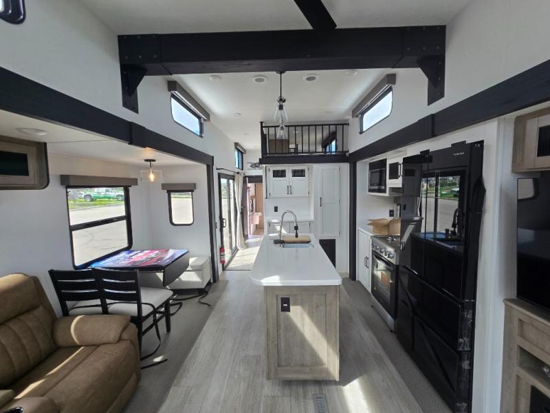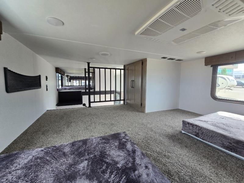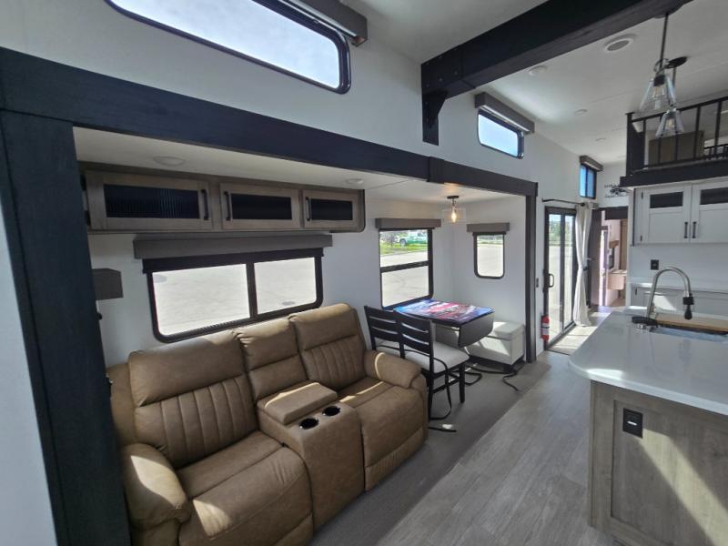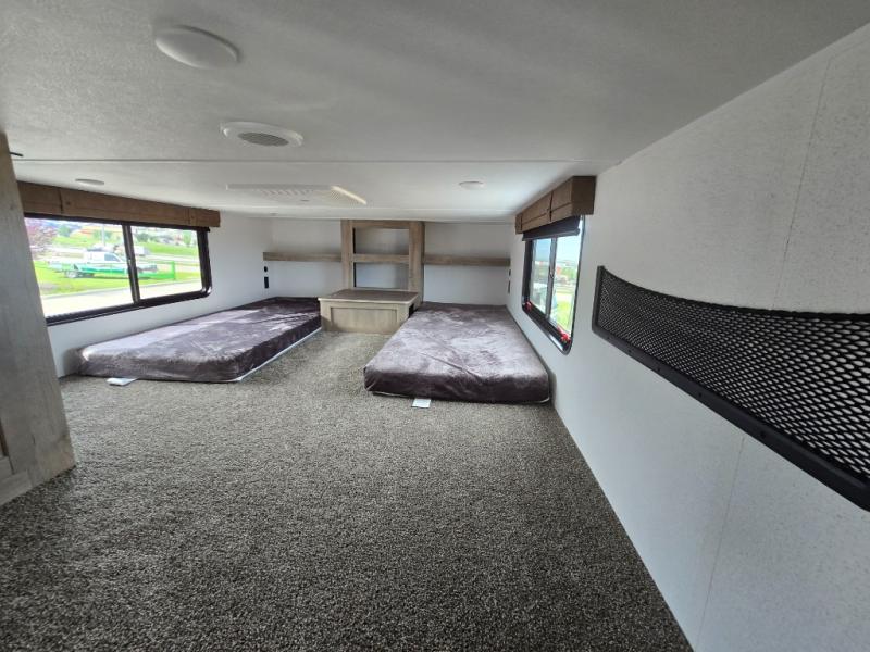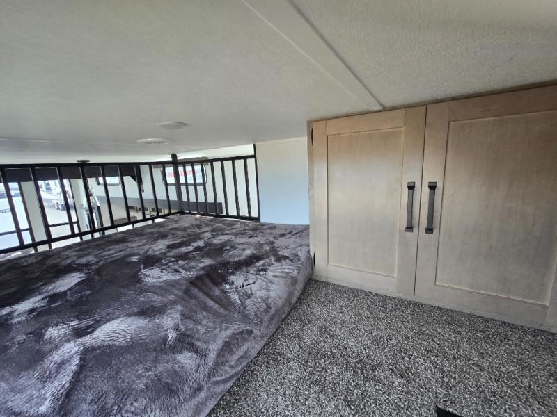 Wherever your destination may be, you can be sure to enjoy it to the fullest with this trailer in tow! With two entry doors, you can enter in through the rear private bedroom or the main living area. The bedroom includes a king bed slide out, a wardrobe/closet to keep your clothes organized, plus a closet with the option to add washer and dryer prep. Just outside this room are steps that lead to the large loft area with a 58" x 58" bunk mat and a cabinet on one side, plus two 32" x 69" bunk mats on the other. There is also a cabinet and a wardrobe/closet for plenty of storage space. Once you've headed back downstairs, you can relax on the dual recliners, front sofa, or free-standing table with a bench and two seats. And the chef of your group will love the kitchen with its residential style refrigerator and pantry, kitchen island, and four burner cooktop!