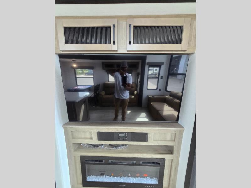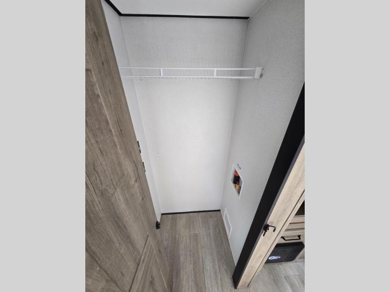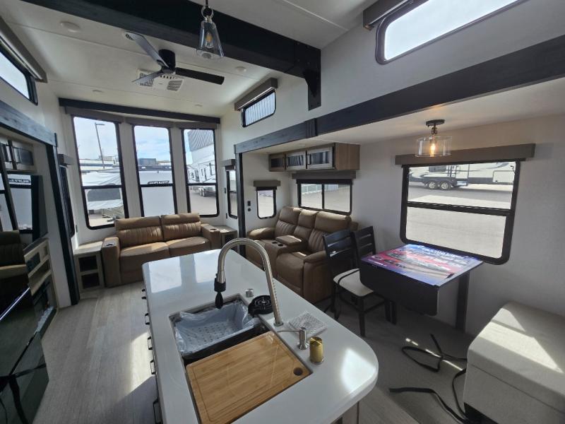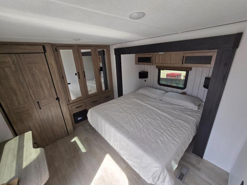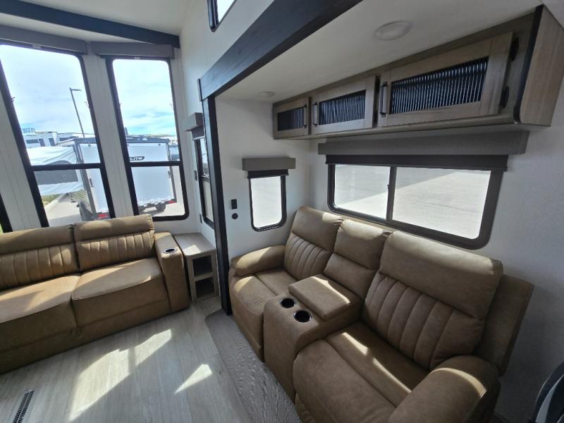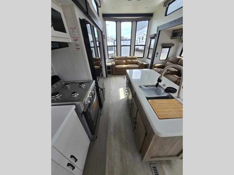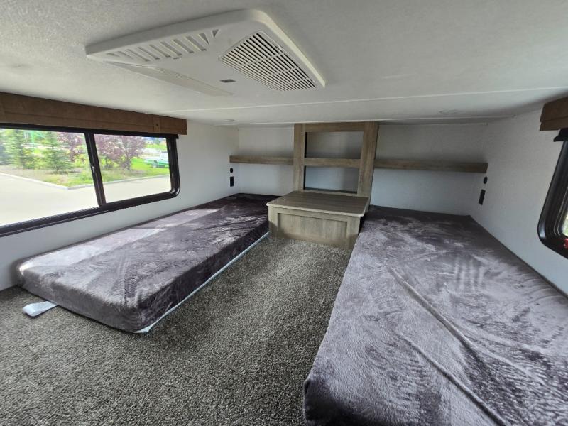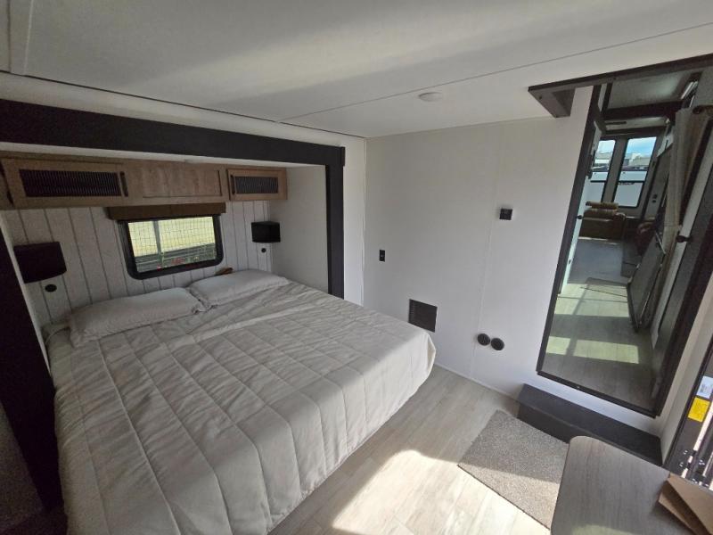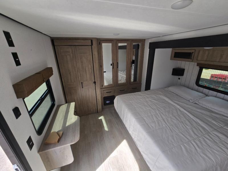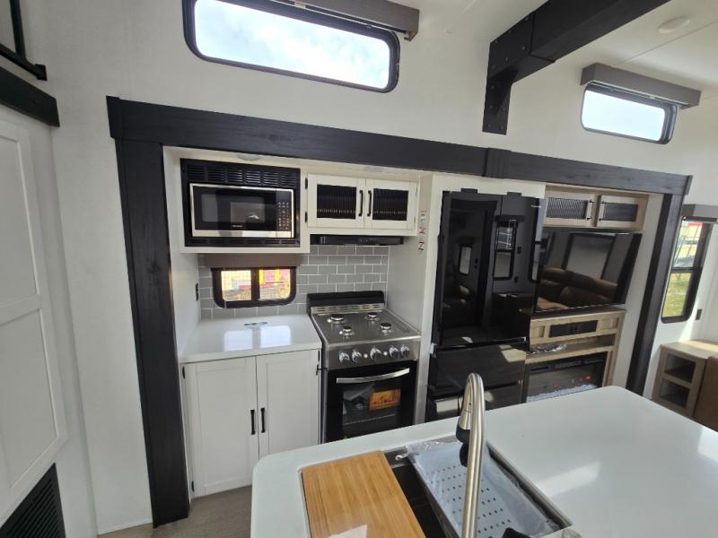 Wherever your destination may be, you can be sure to enjoy it to the fullest with this trailer in tow! With two entry doors, you can enter in through the rear private bedroom or the main living area. The bedroom includes a king bed slide out, a wardrobe/closet to keep your clothes organized, plus a closet with the option to add washer and dryer prep. Just outside this room are steps that lead to the large loft area with a 58" x 58" bunk mat and a cabinet on one side, plus two 32" x 69" bunk mats on the other. There is also a cabinet and a wardrobe/closet for plenty of storage space. Once you've headed back downstairs, you can relax on the dual recliners, front sofa, or free-standing table with a bench and two seats. And the chef of your group will love the kitchen with its residential style refrigerator and pantry, kitchen island, and four burner cooktop!